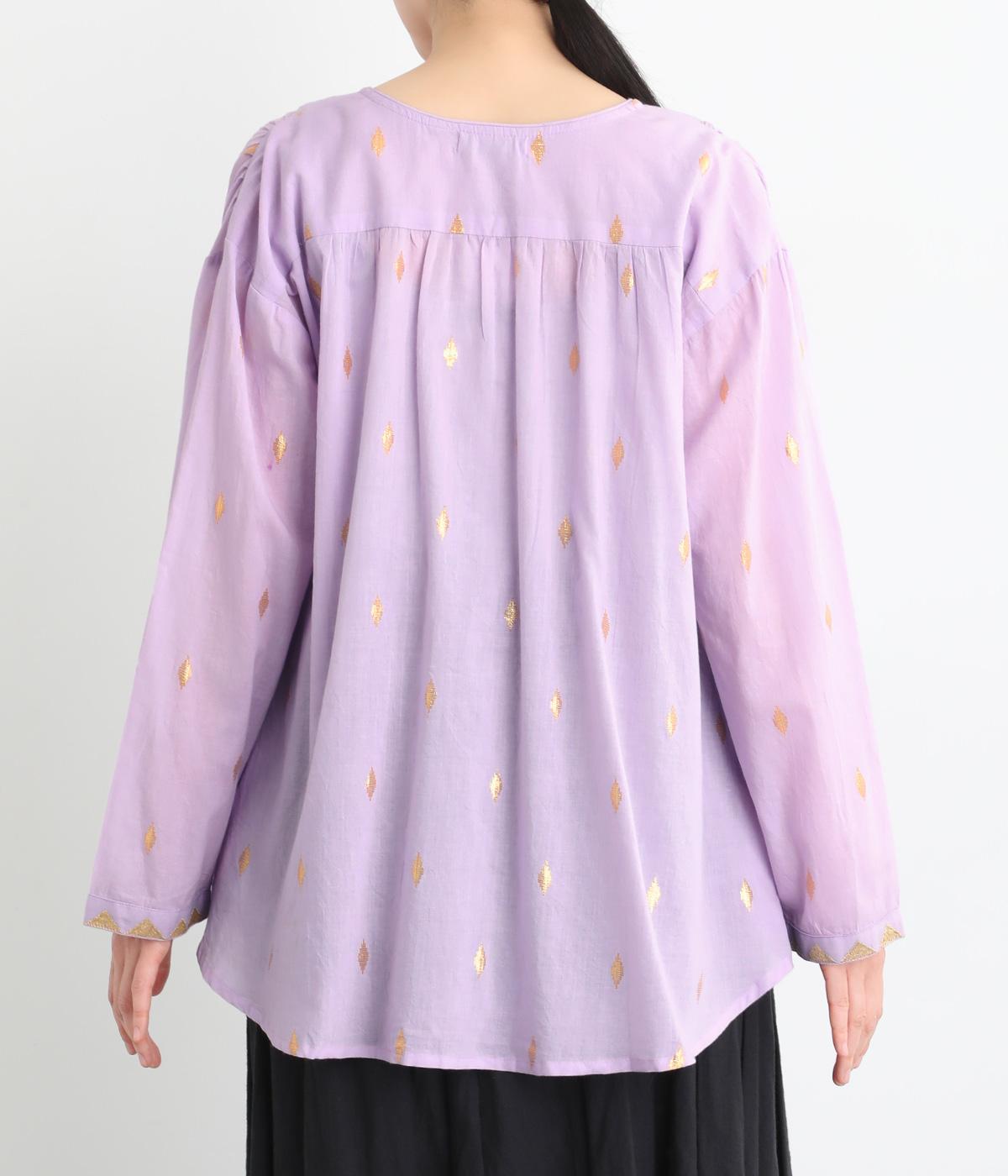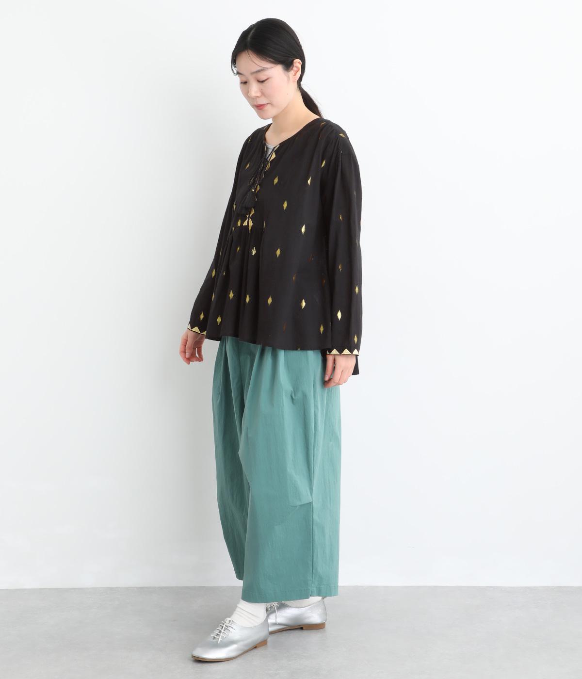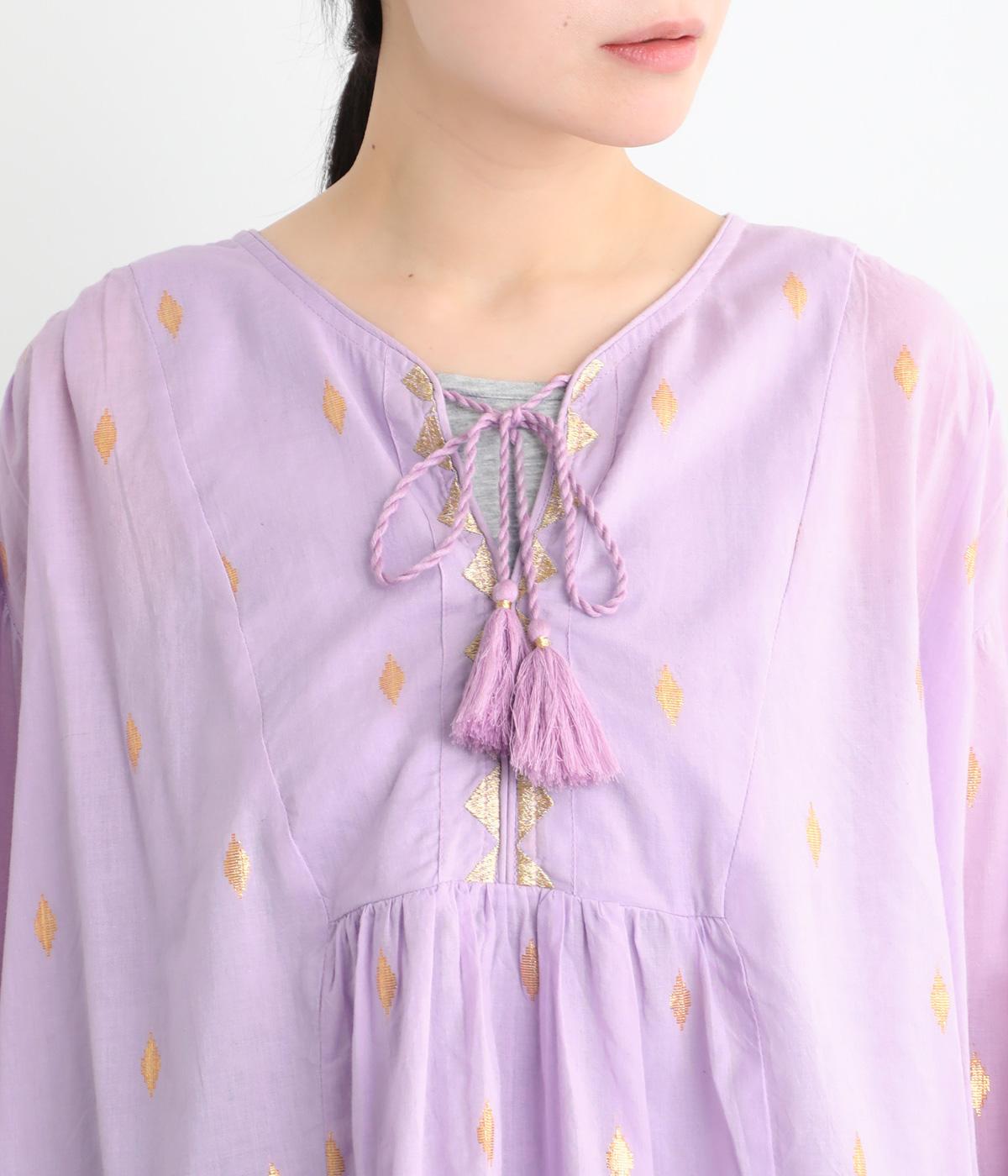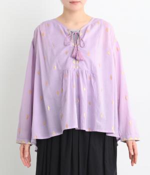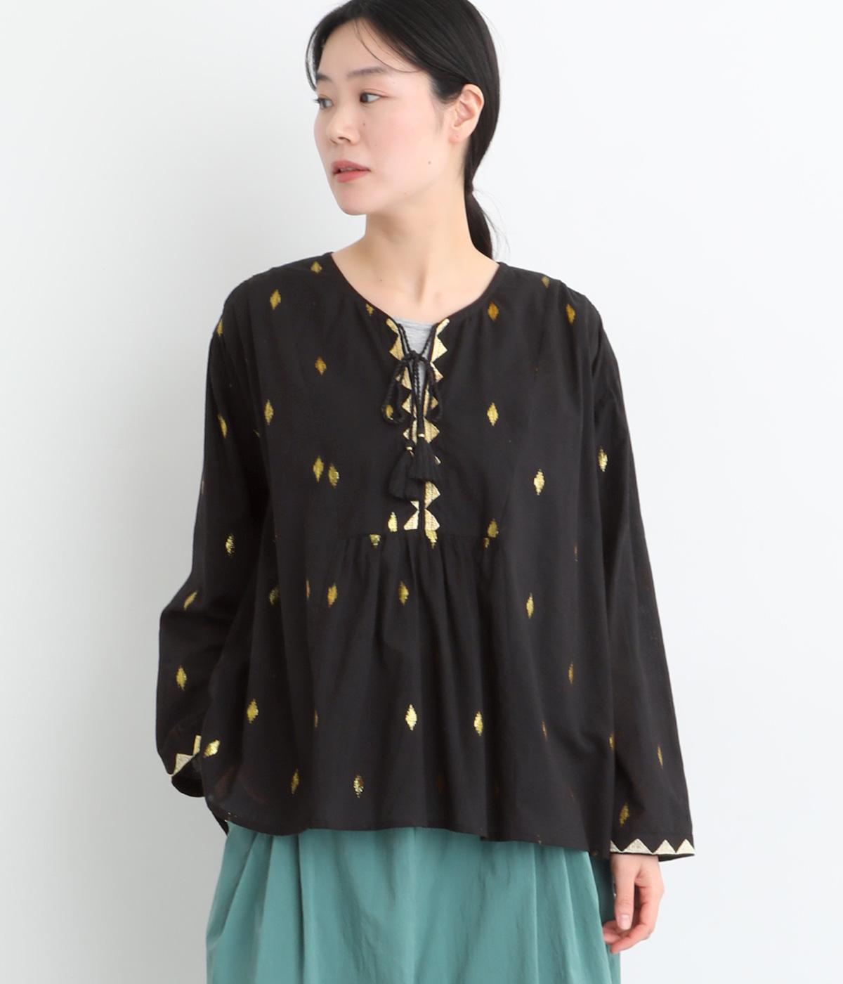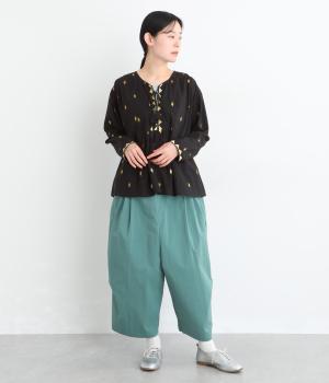 生地に織り込んだ煌びやかな金色が映えるプルオーバーです。軽やかな生地が美しいドレープをつくり、動くたびに華やかさを引き立てます。首元は紐仕様で、結んでも垂らしてもほどよい抜け感を演出します。