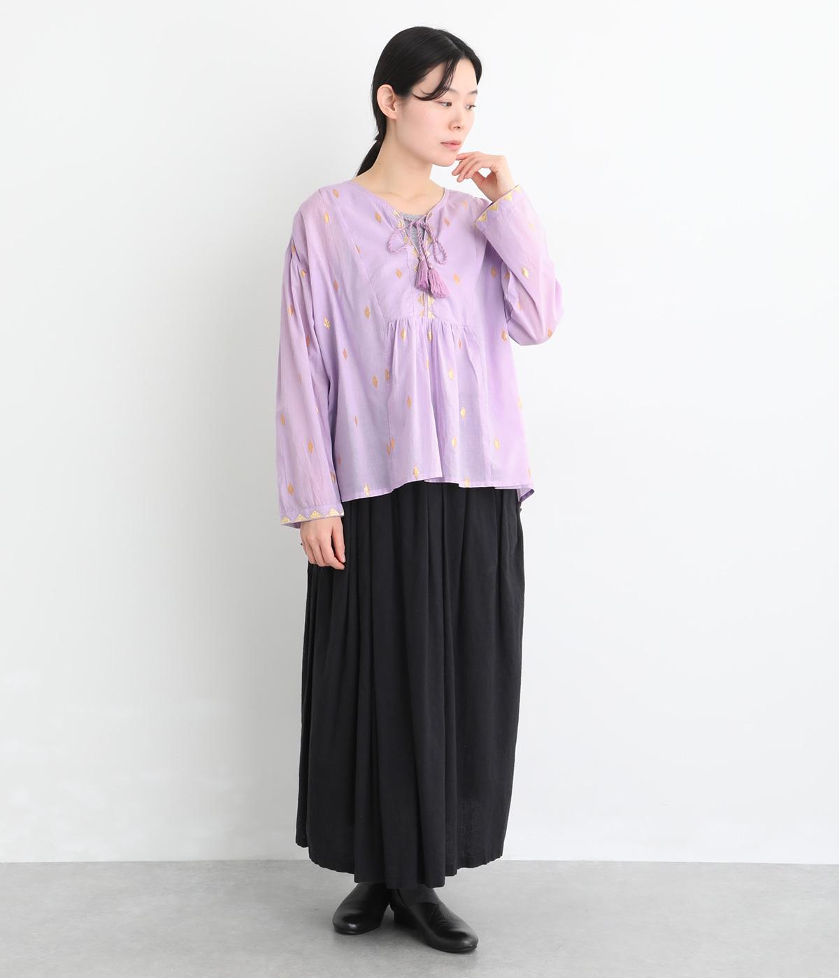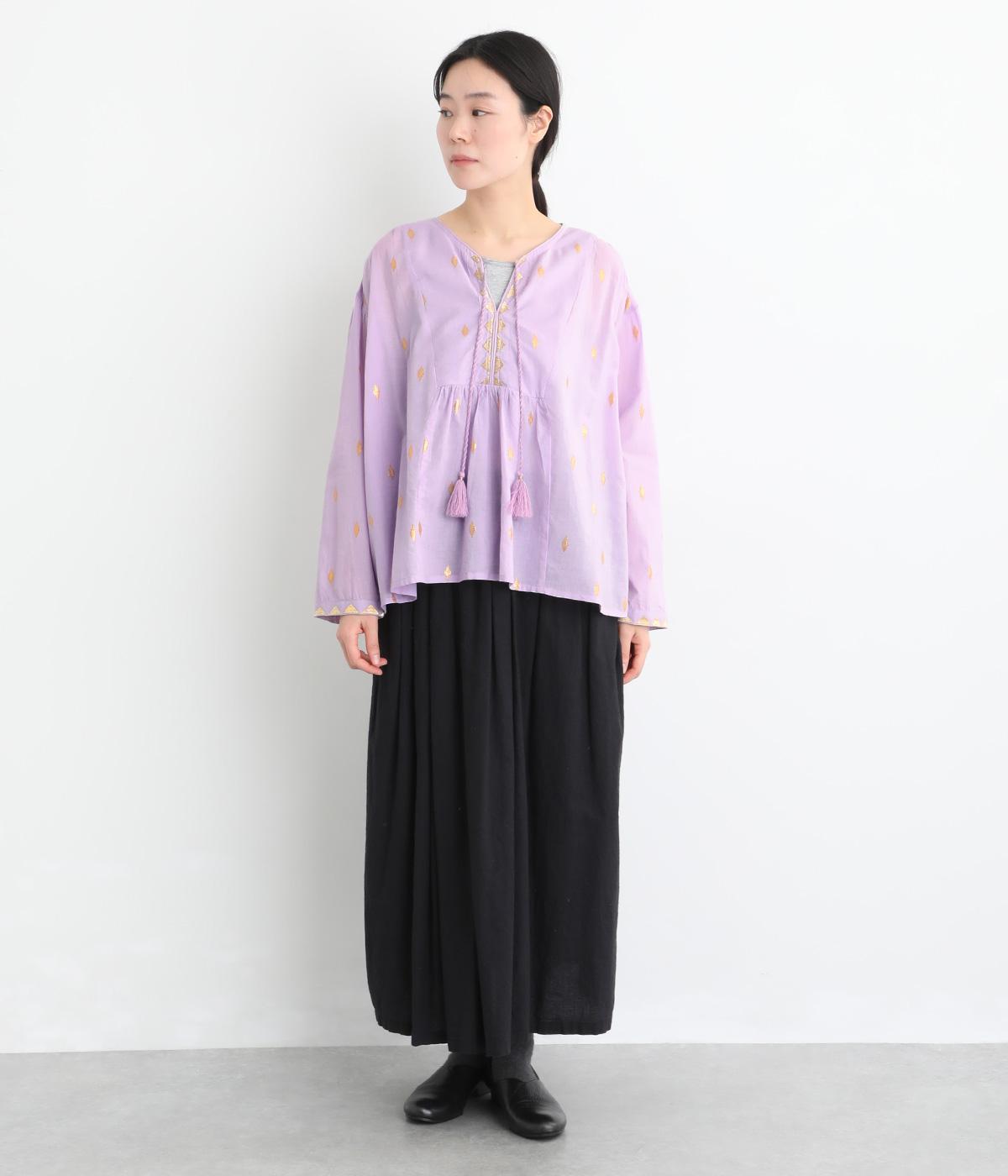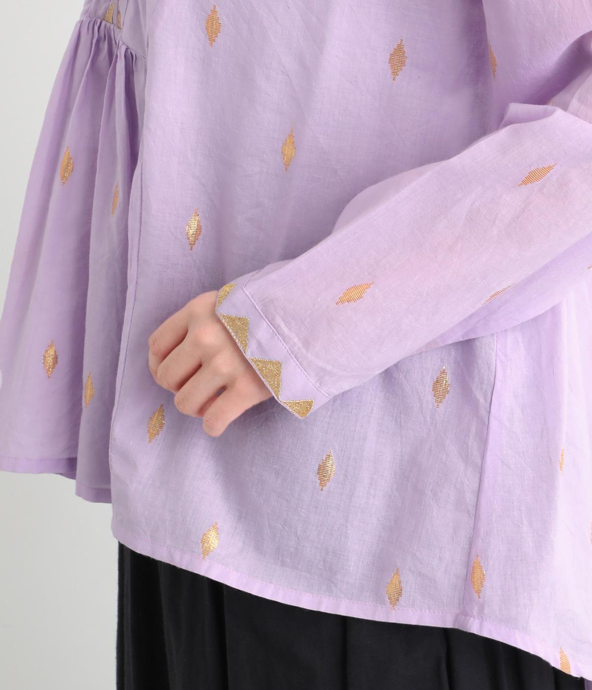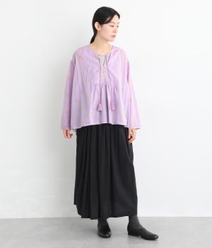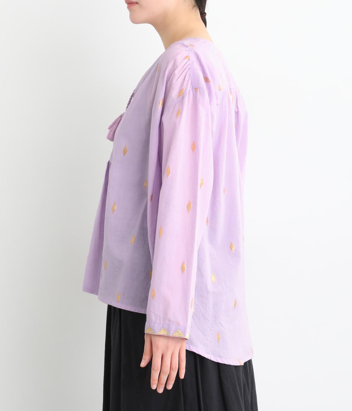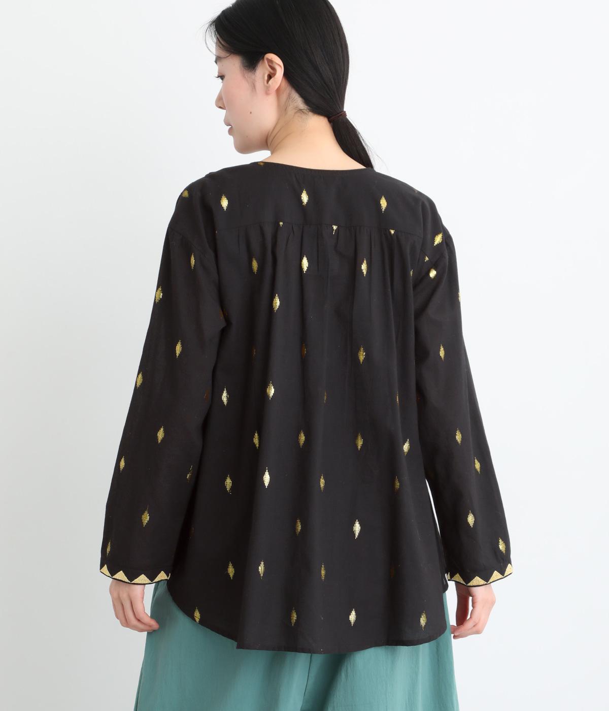 生地に織り込んだ煌びやかな金色が映えるプルオーバーです。軽やかな生地が美しいドレープをつくり、動くたびに華やかさを引き立てます。首元は紐仕様で、結んでも垂らしてもほどよい抜け感を演出します。