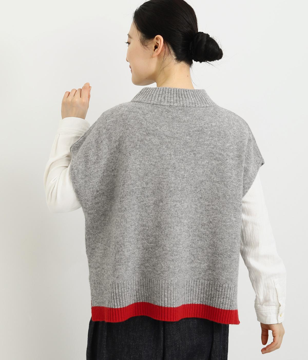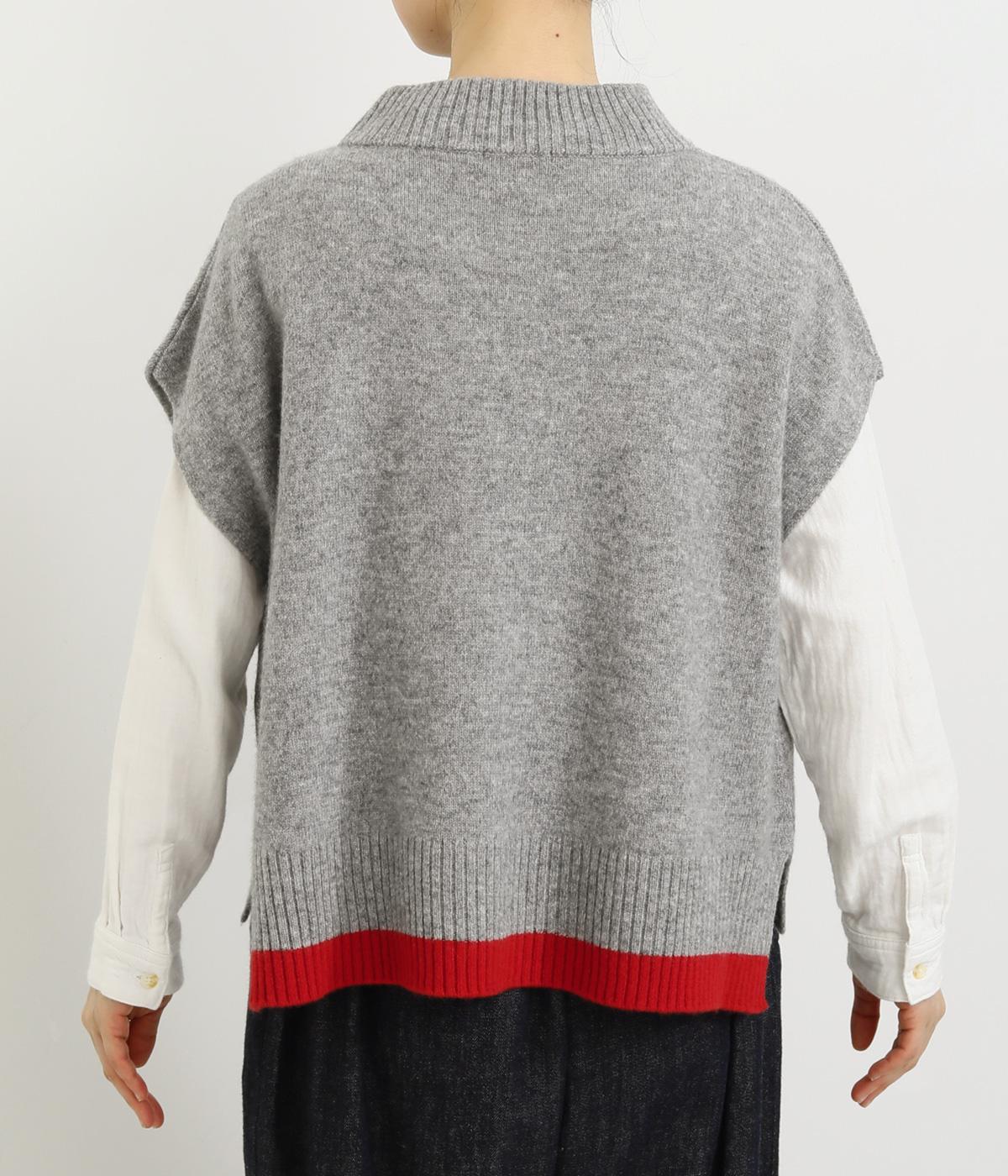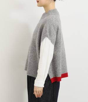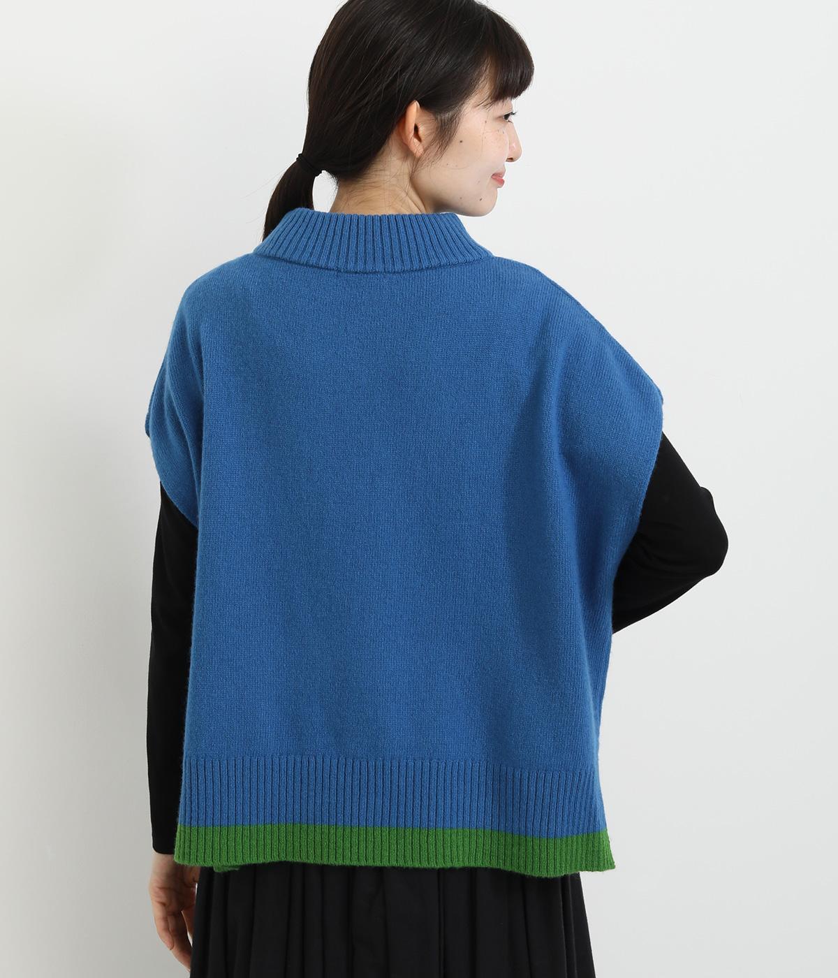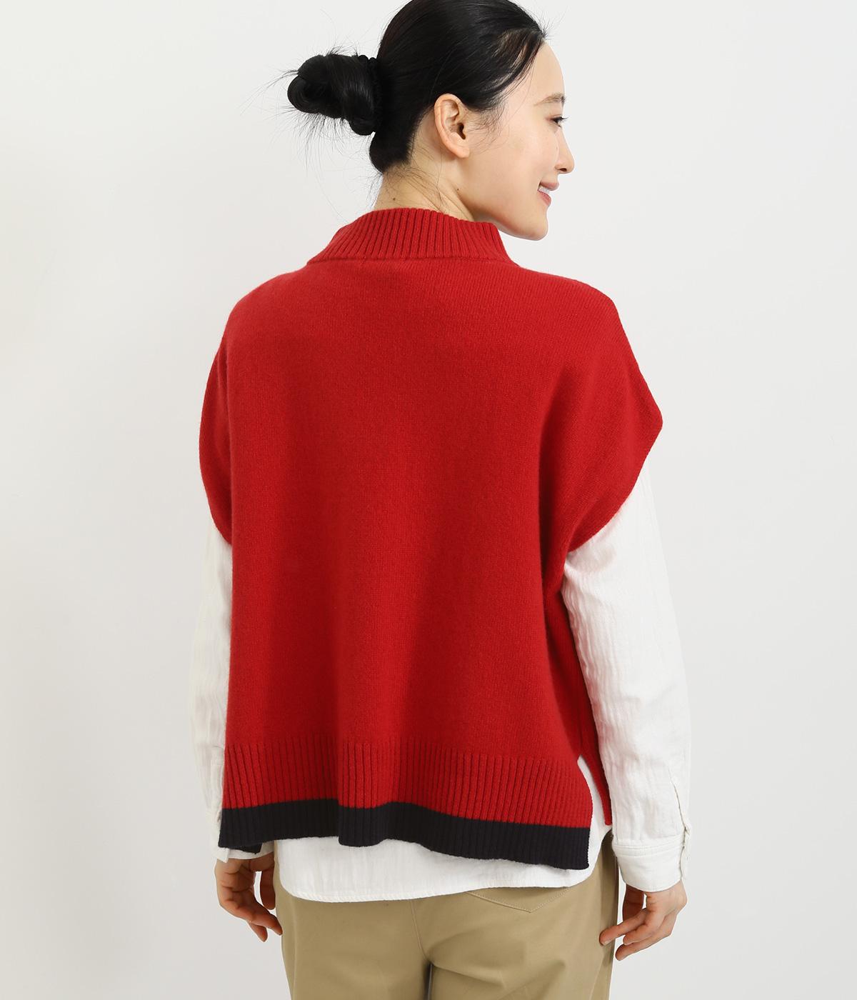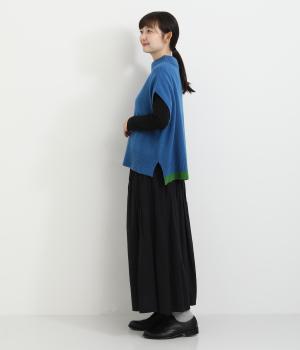 うしろの裾のバイカラーがデザインポイントになっているベスト。高すぎないボトルネックとゆったりした身幅でリラックスした着心地です。秋冬のレイヤードスタイルにパッと華やかさを添えるアイテムです。