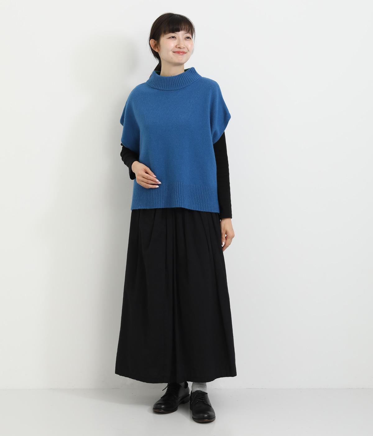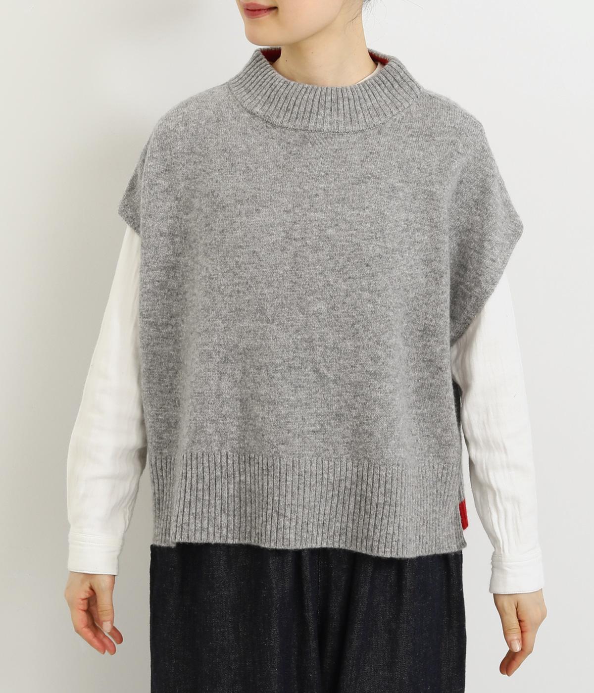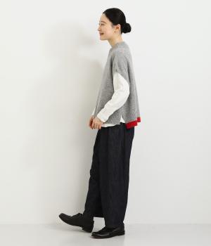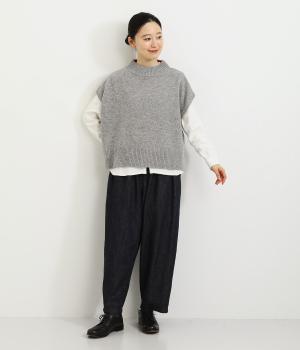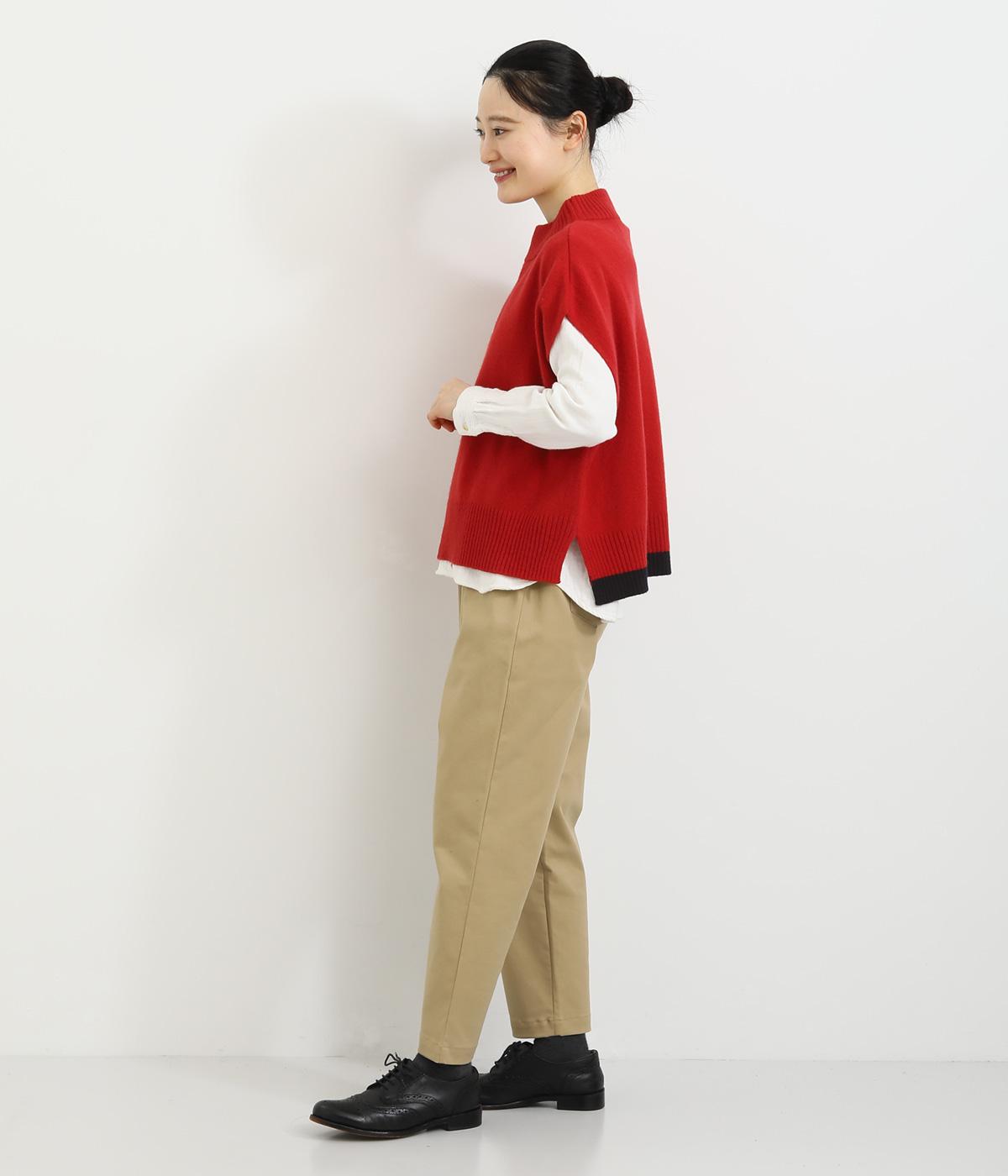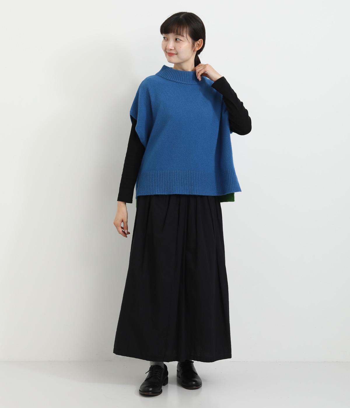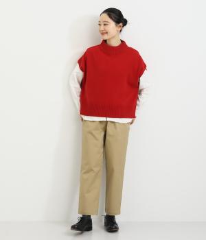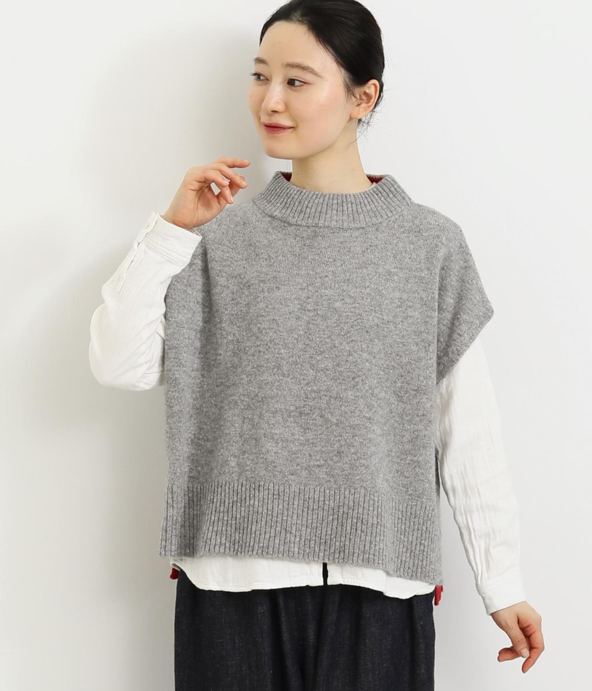 うしろの裾のバイカラーがデザインポイントになっているベスト。高すぎないボトルネックとゆったりした身幅でリラックスした着心地です。秋冬のレイヤードスタイルにパッと華やかさを添えるアイテムです。