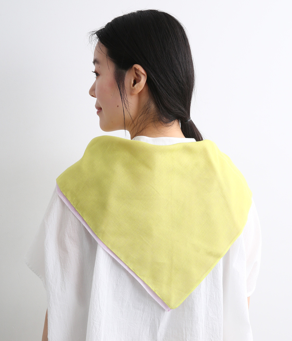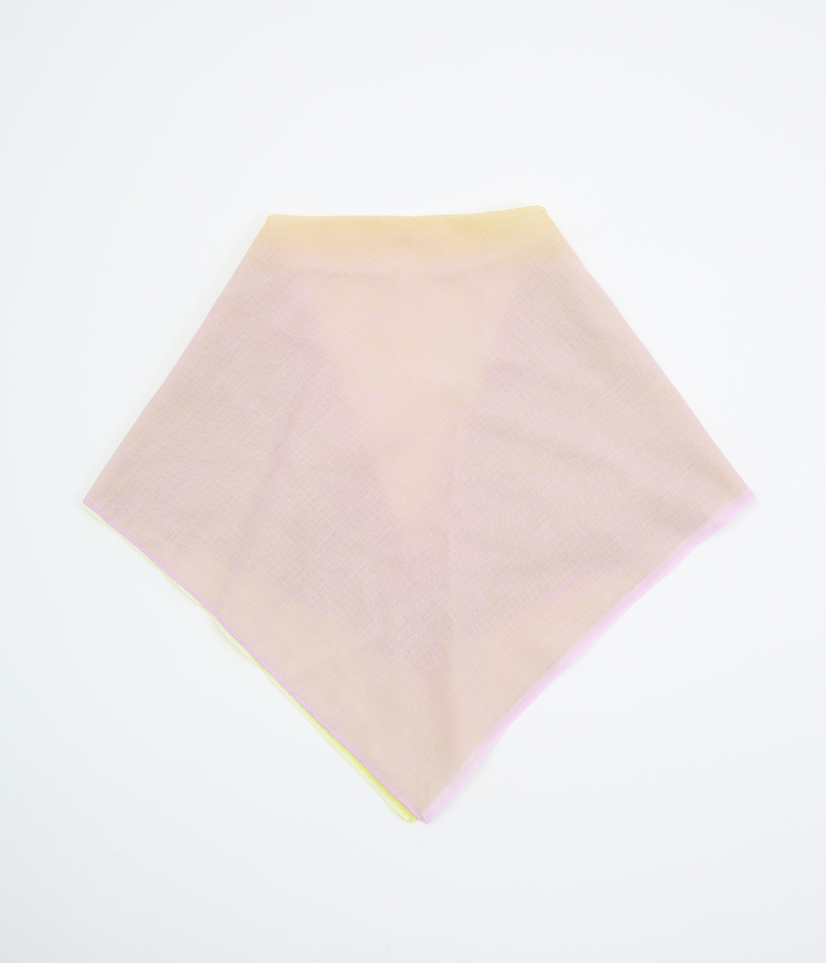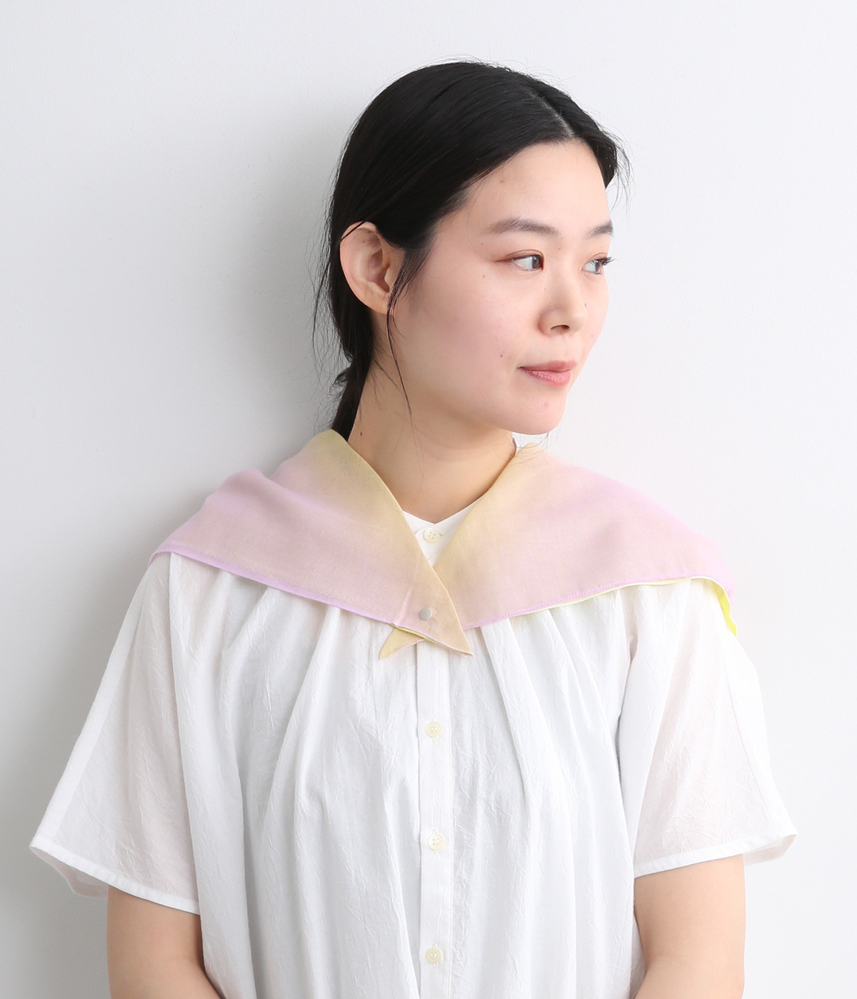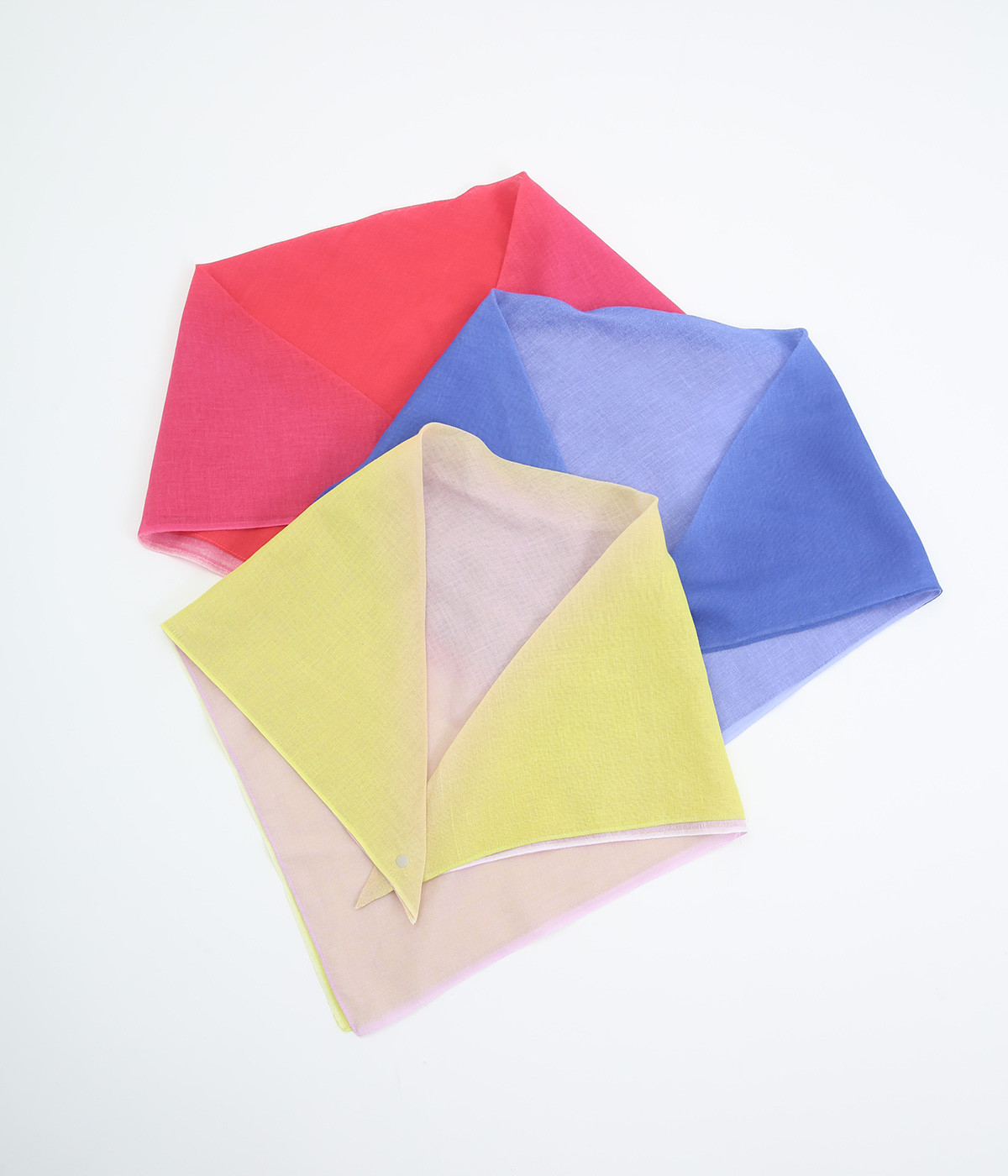 ワンタッチで手軽に装着できる三角スカーフ。美しいグラデーションが生み出すバイカラー仕立てで、気分やコーディネートに合わせて2通りの色を楽しめます。暑い季節の紫外線や冷房対策にも重宝する一枚です。