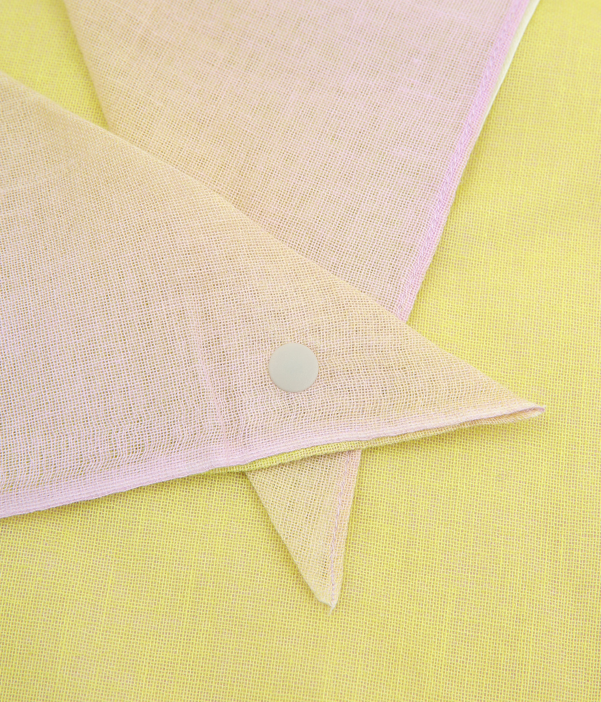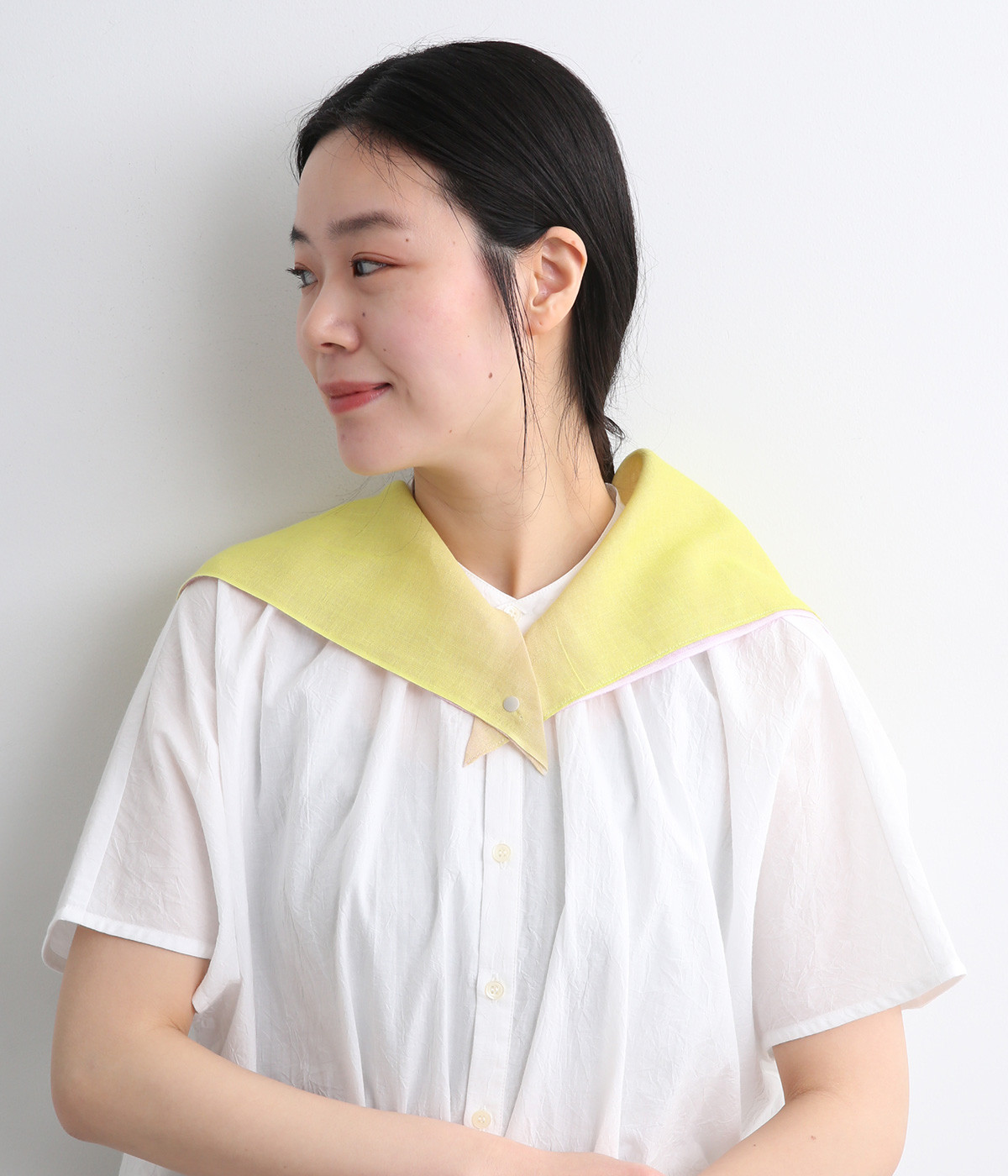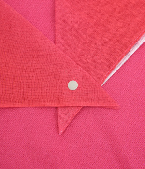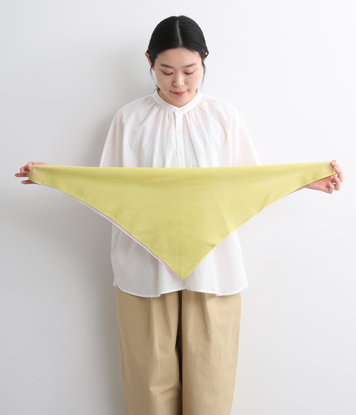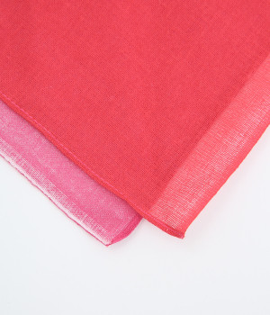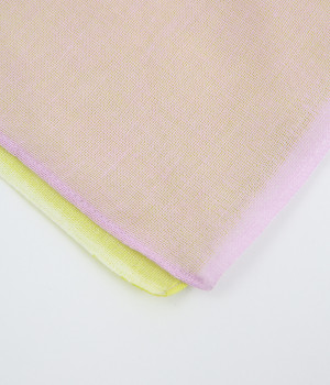 ワンタッチで手軽に装着できる三角スカーフ。美しいグラデーションが生み出すバイカラー仕立てで、気分やコーディネートに合わせて2通りの色を楽しめます。暑い季節の紫外線や冷房対策にも重宝する一枚です。