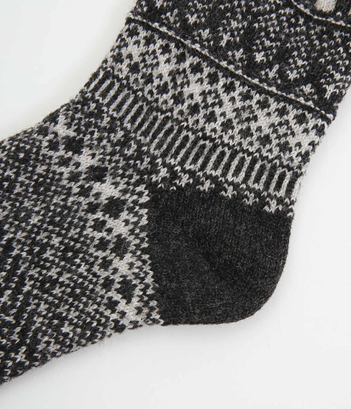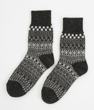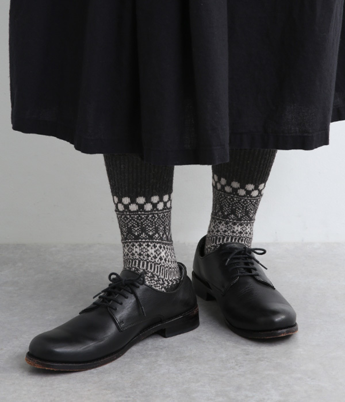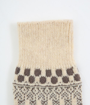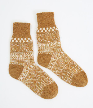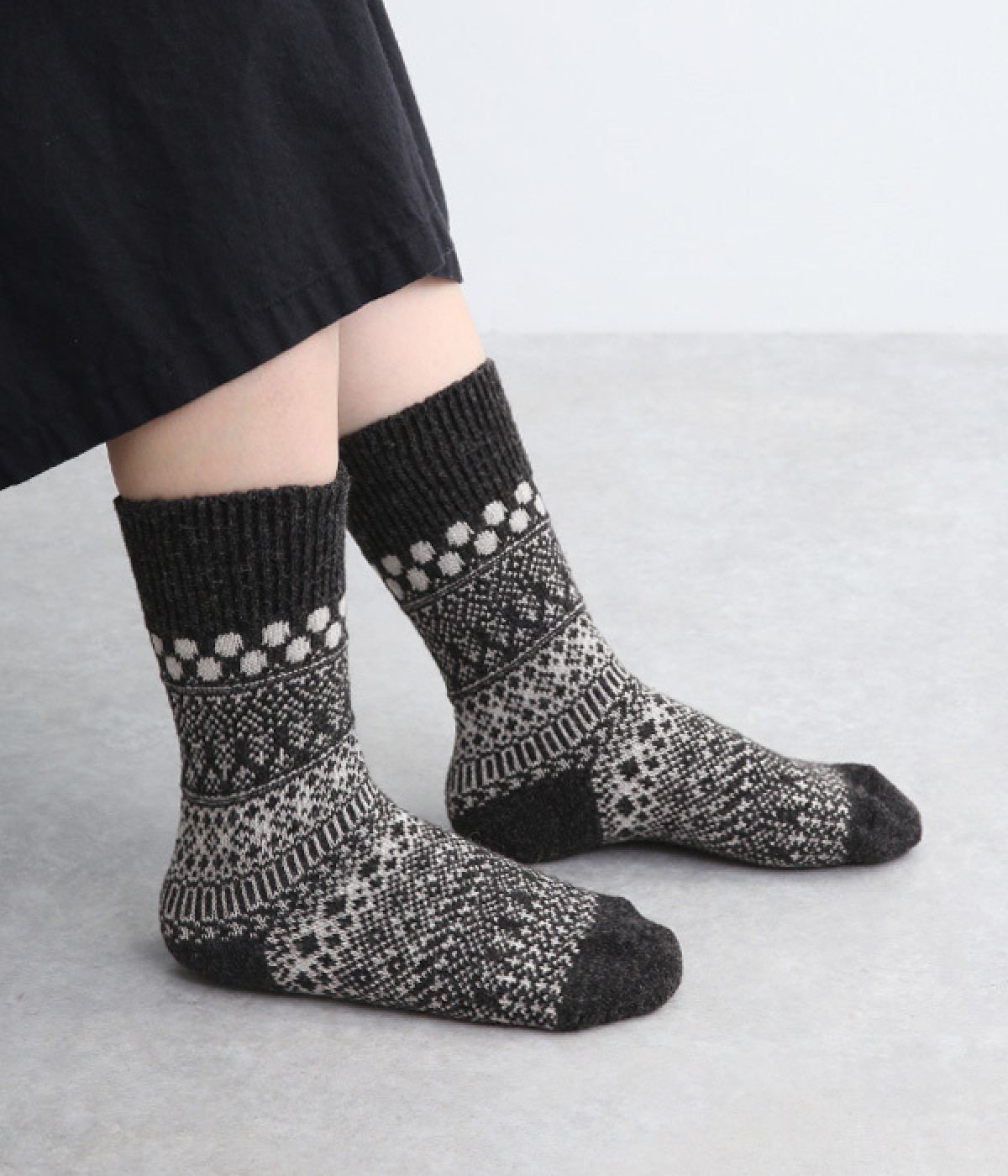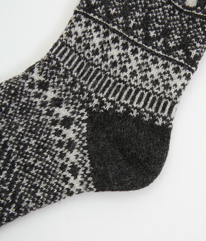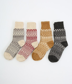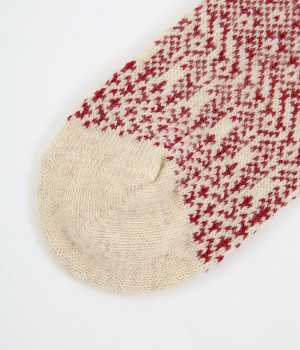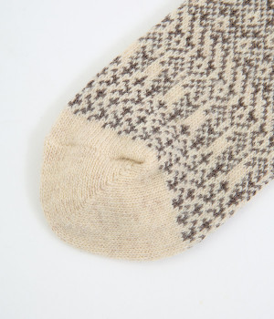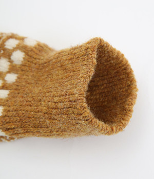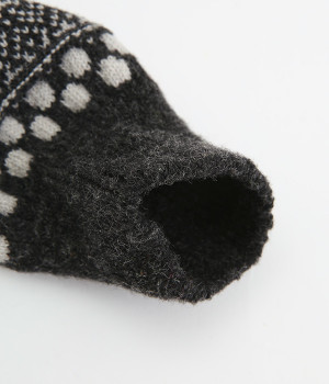 足元にさりげなく季節感を運ぶジャカードソックス。シンプルになりがちな秋冬コーディネートのアクセントにぴったりです。はき口は幅広のリブ仕様で、心地よくフィット。足の甲や裏まで繊細なデザインが施され、ルームソックスとしても気分を高めてくれます。