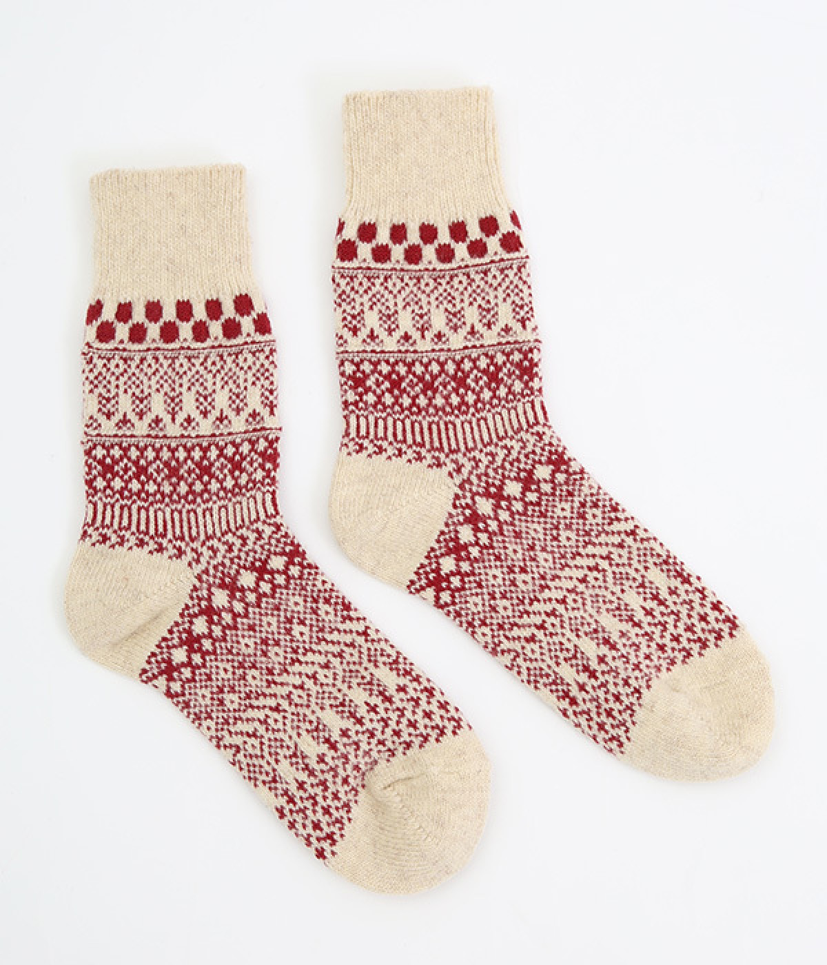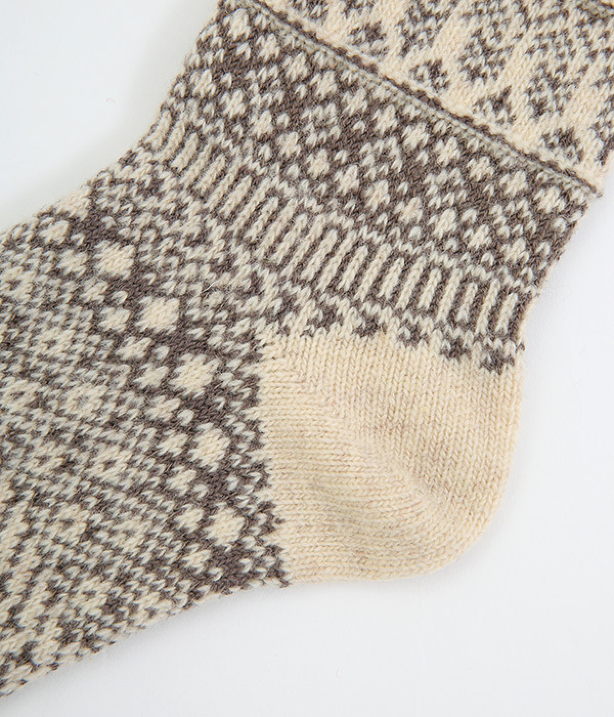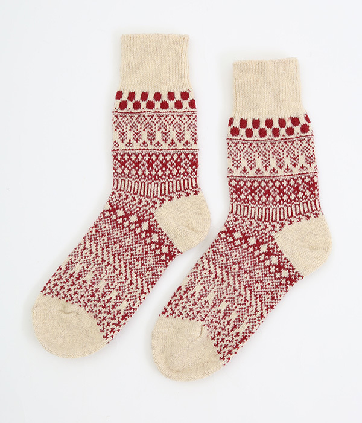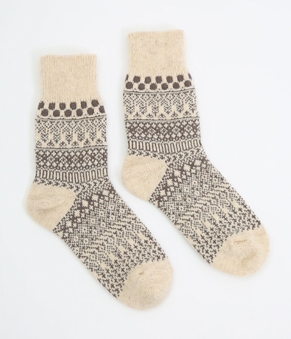 足元にさりげなく季節感を運ぶジャカードソックス。シンプルになりがちな秋冬コーディネートのアクセントにぴったりです。はき口は幅広のリブ仕様で、心地よくフィット。足の甲や裏まで繊細なデザインが施され、ルームソックスとしても気分を高めてくれます。