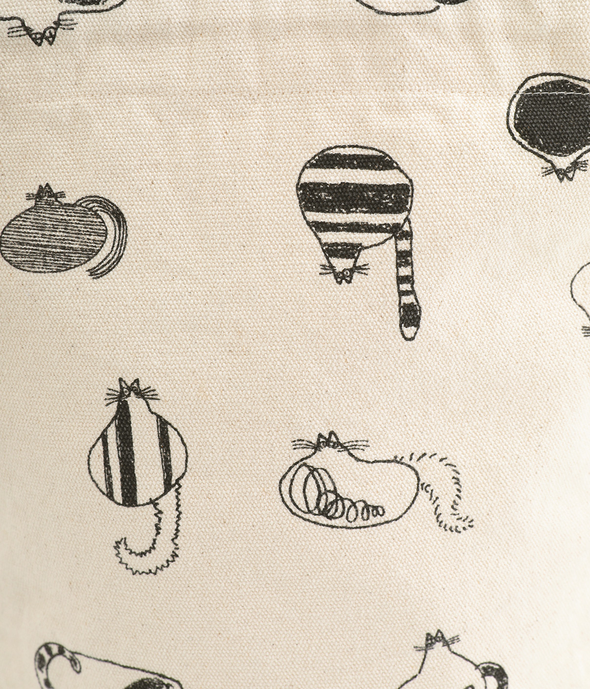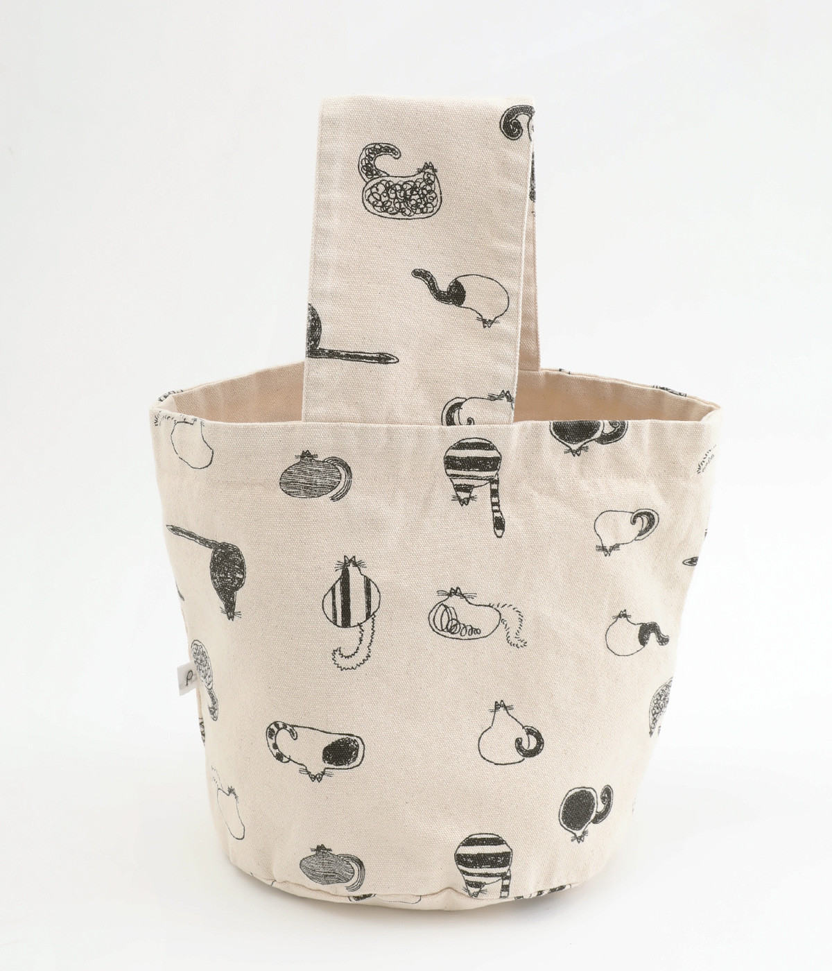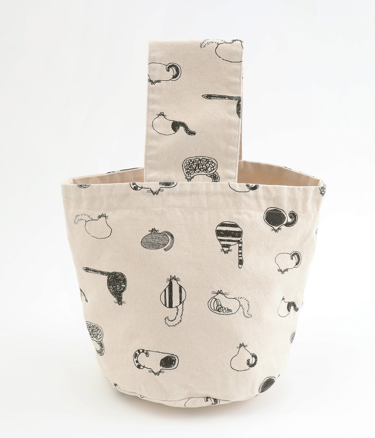 スズキマイコさんとのコラボレーションから誕生したバッグです。個性的な柄をもつたくさんのネコたちをモチーフにした、癒し系のルックスが◎。幅の広いワンハンドル仕様がポイントになったバケットフォルムに仕上がっています。