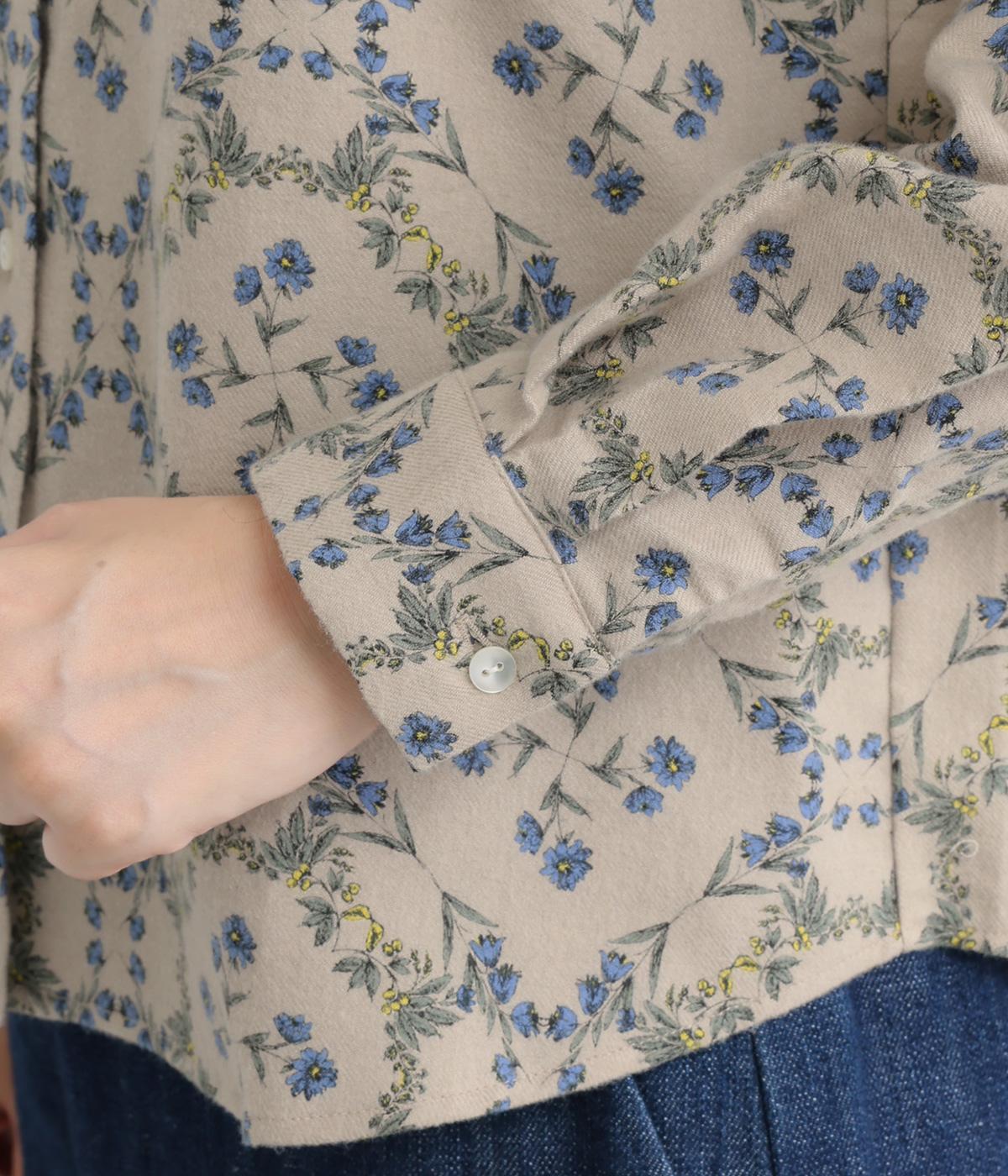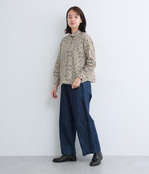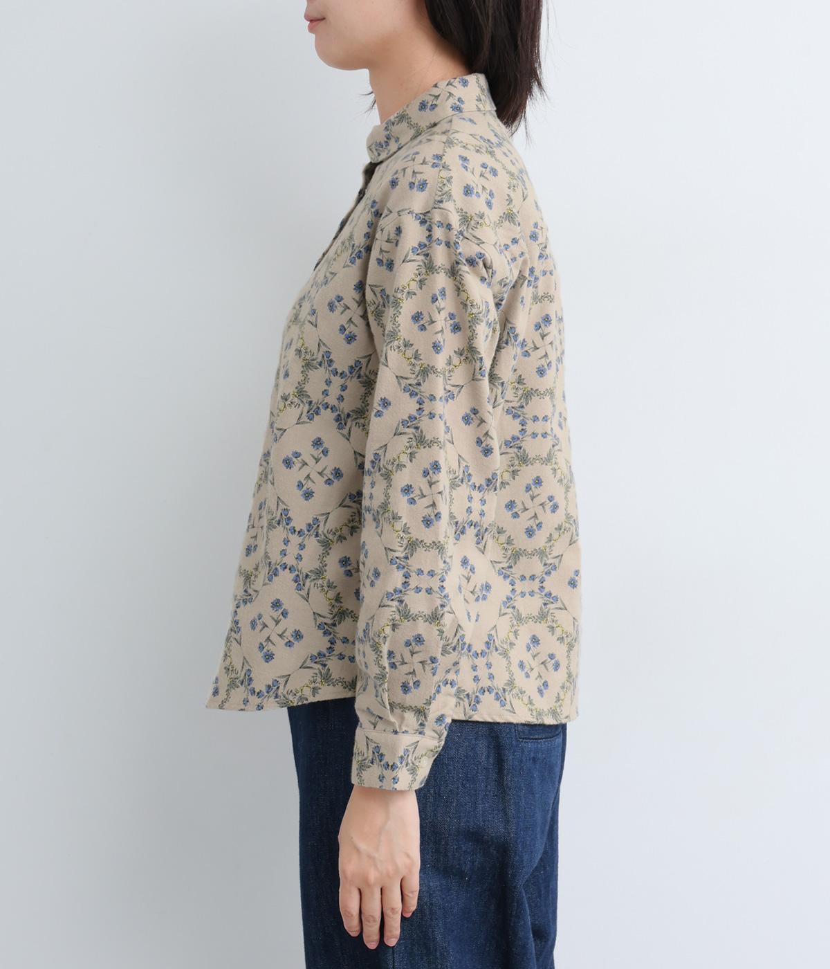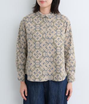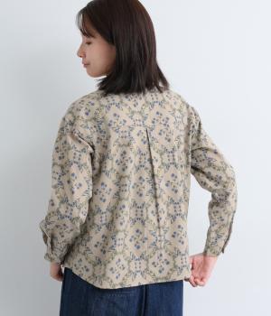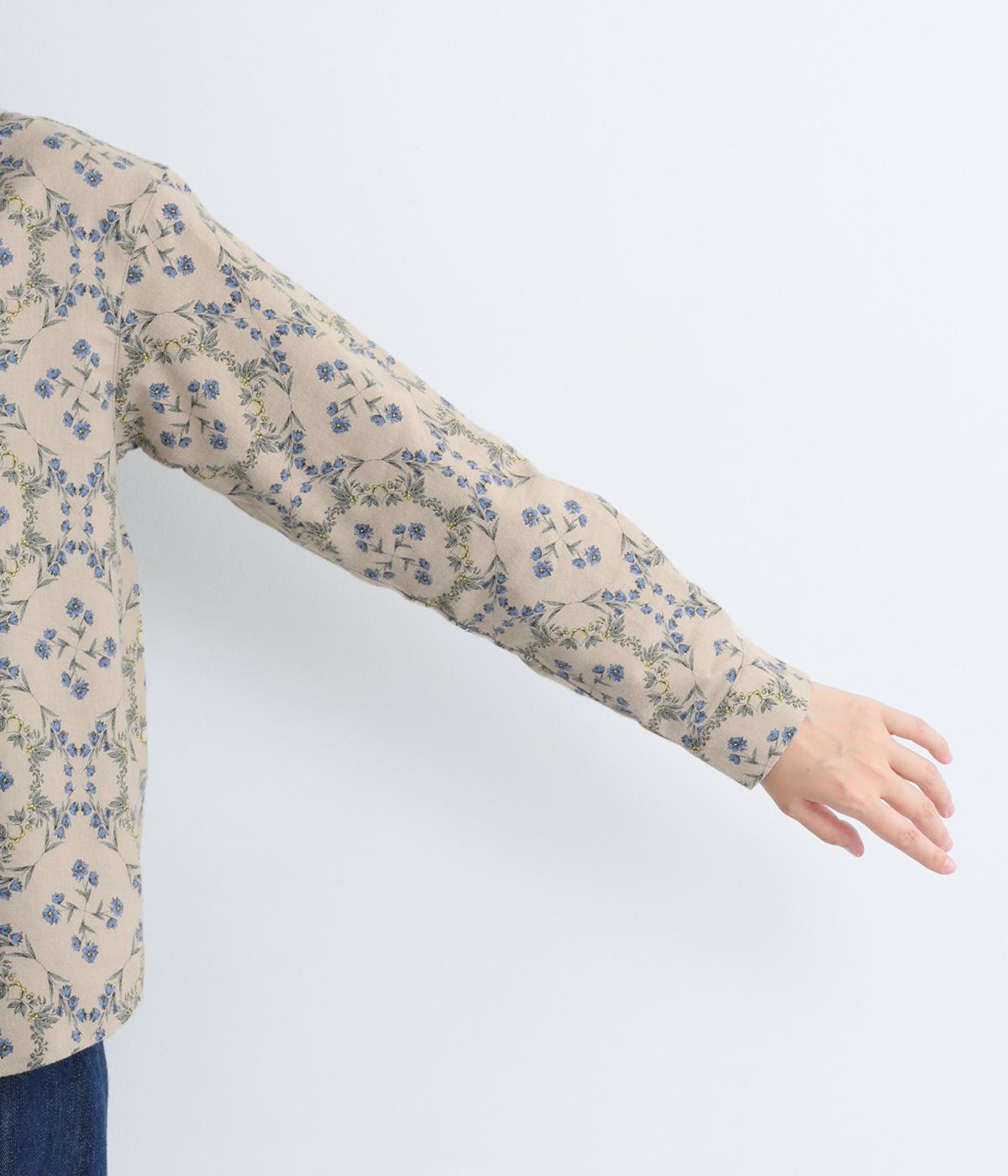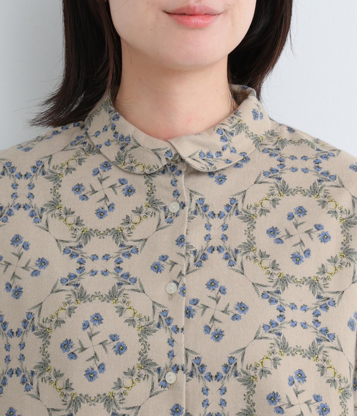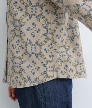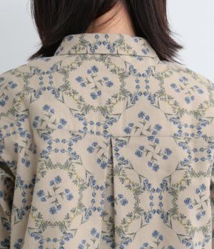 やさしい風合いの素材感にフラワーリース柄でクラシカル&ガーリーに仕上がった一枚。ボタンを留めると重なる襟元がさり気ないこだわりポイント。裾はラウンドさせているのでトップスアウトもきれいにきまります。