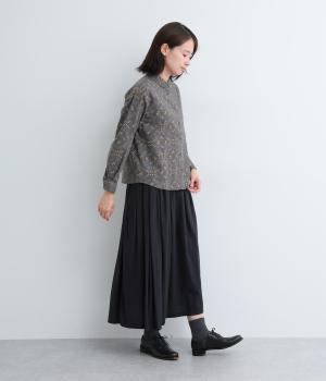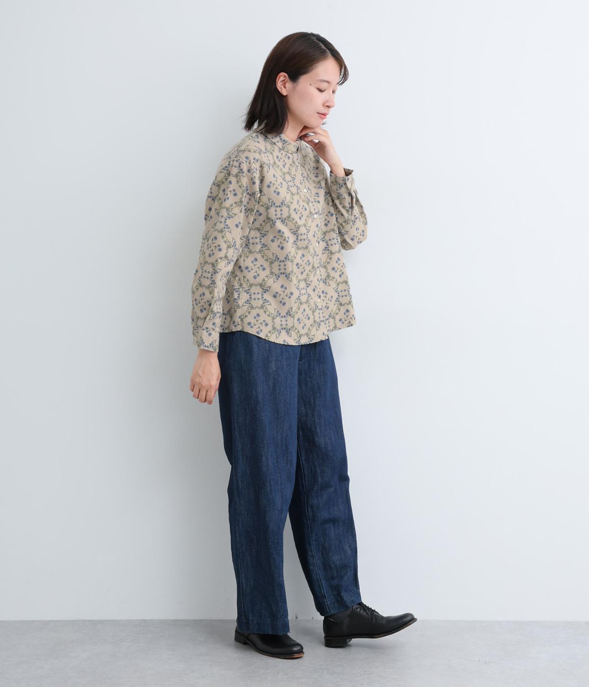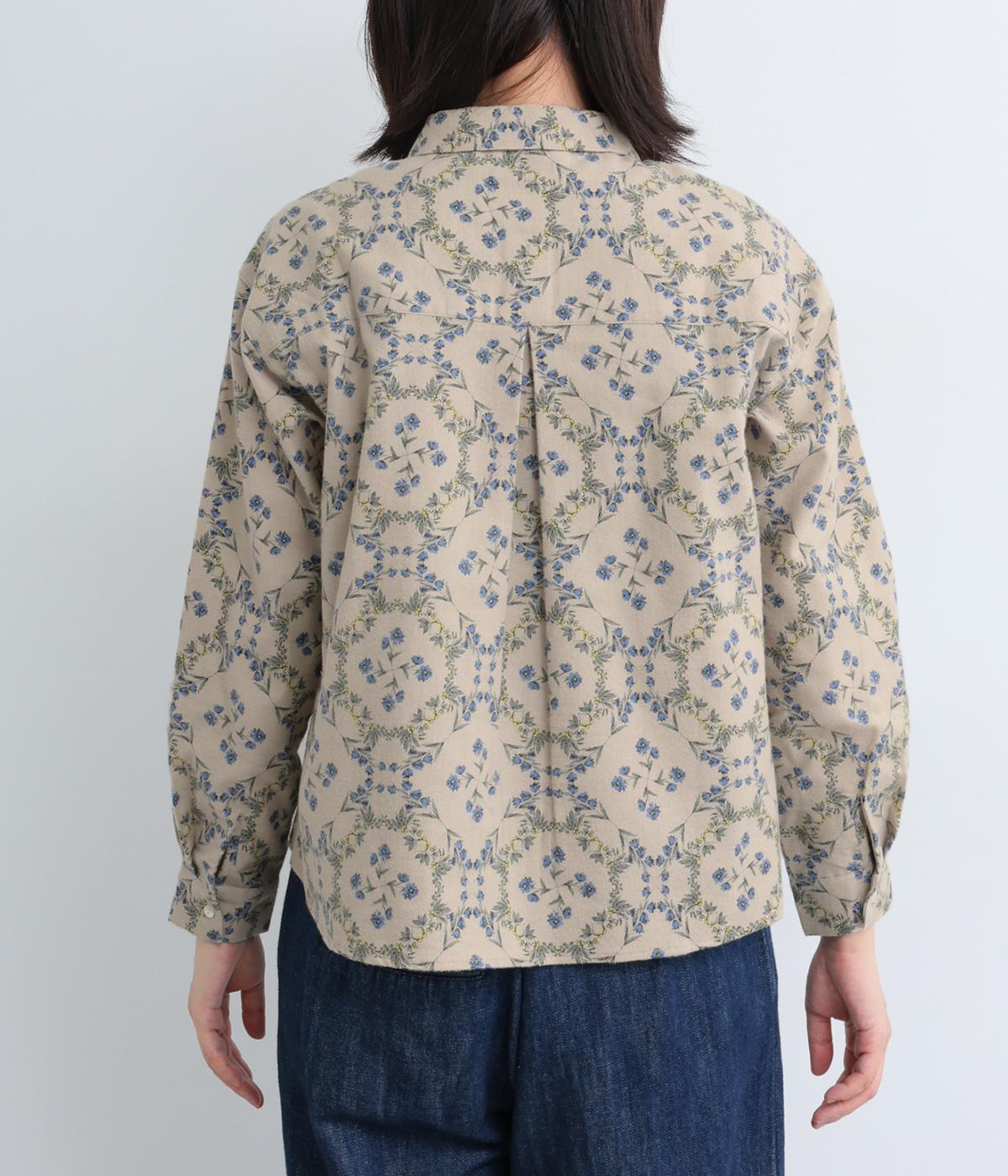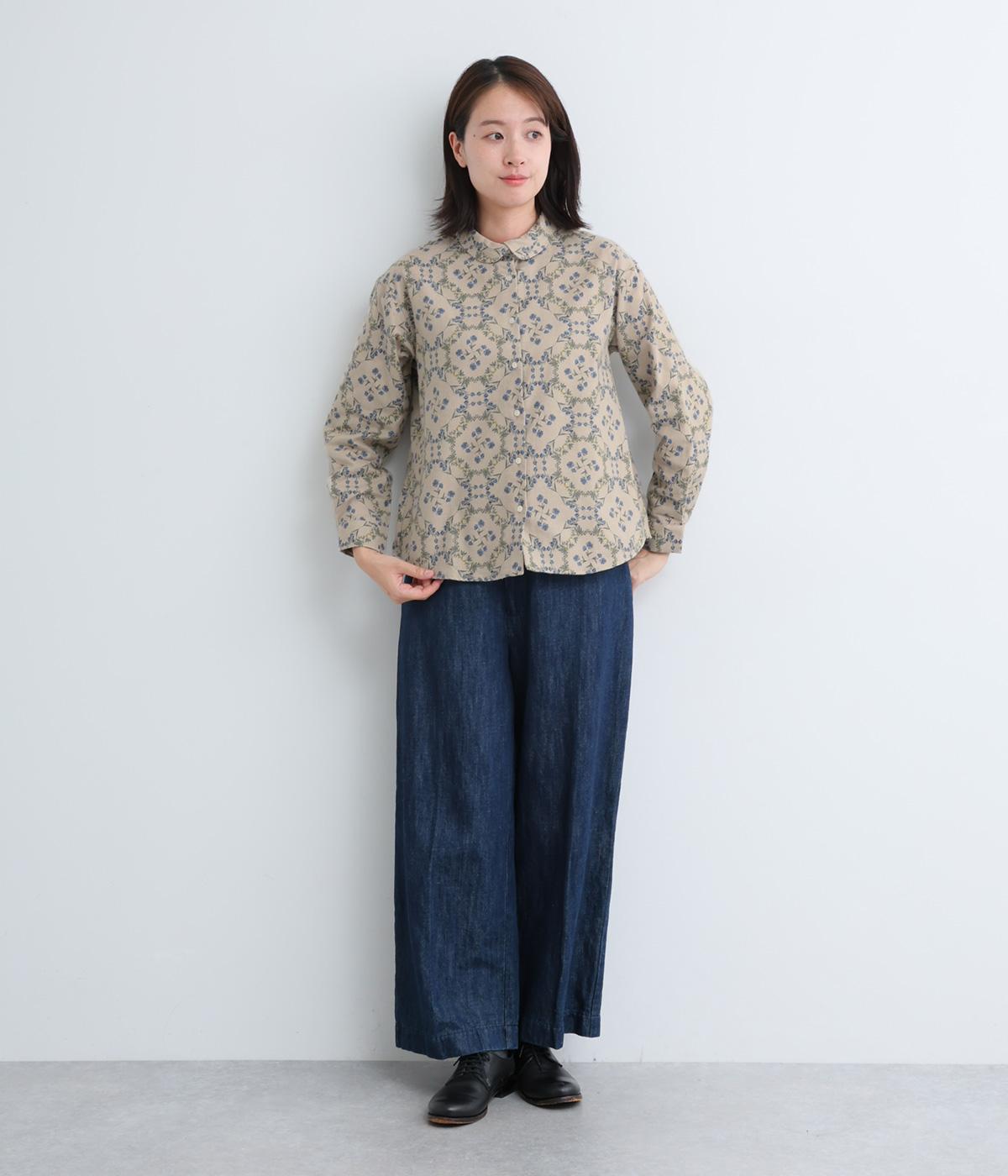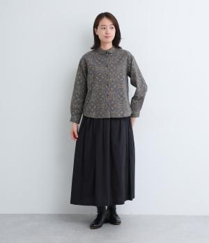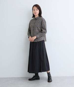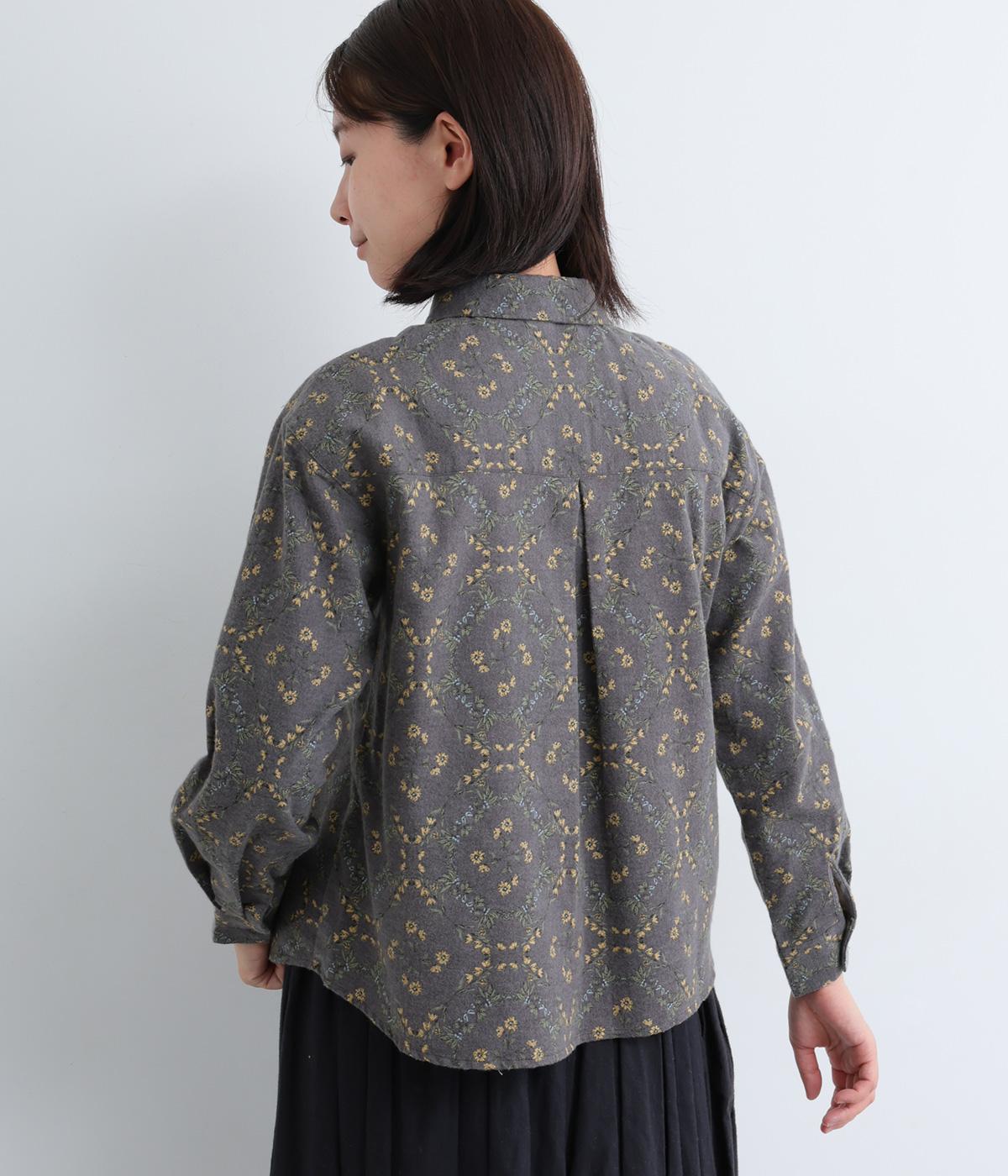 やさしい風合いの素材感にフラワーリース柄でクラシカル&ガーリーに仕上がった一枚。ボタンを留めると重なる襟元がさり気ないこだわりポイント。裾はラウンドさせているのでトップスアウトもきれいにきまります。