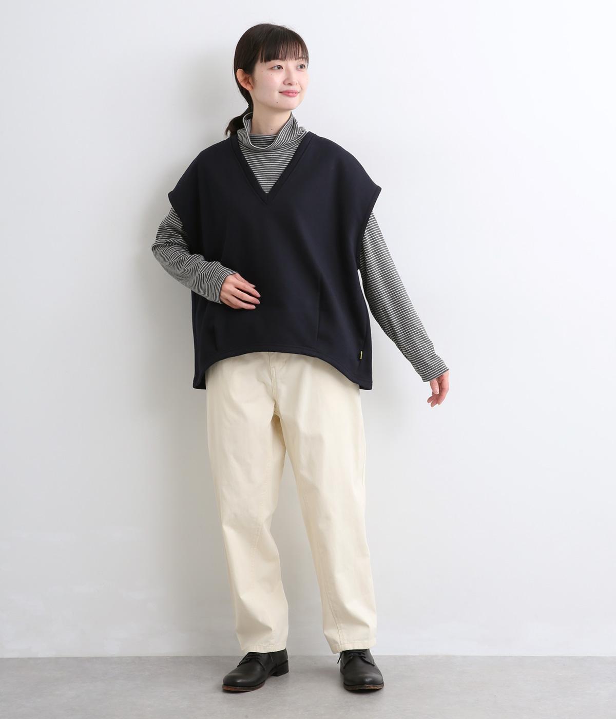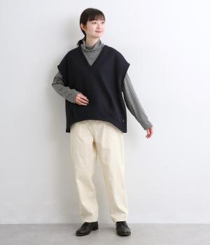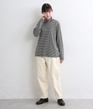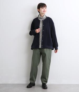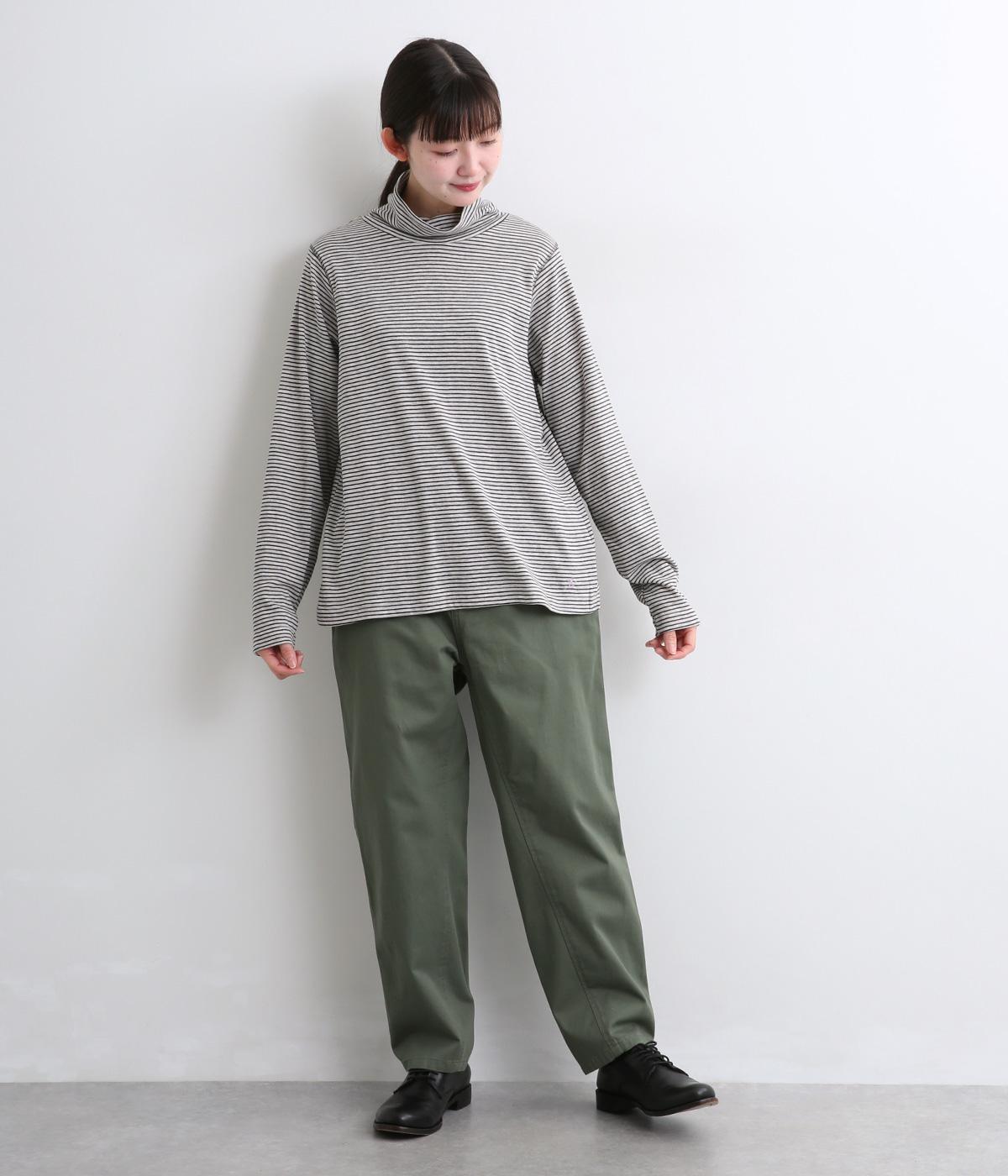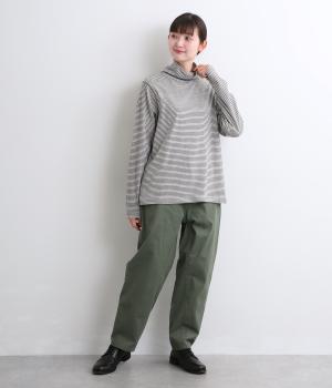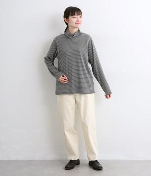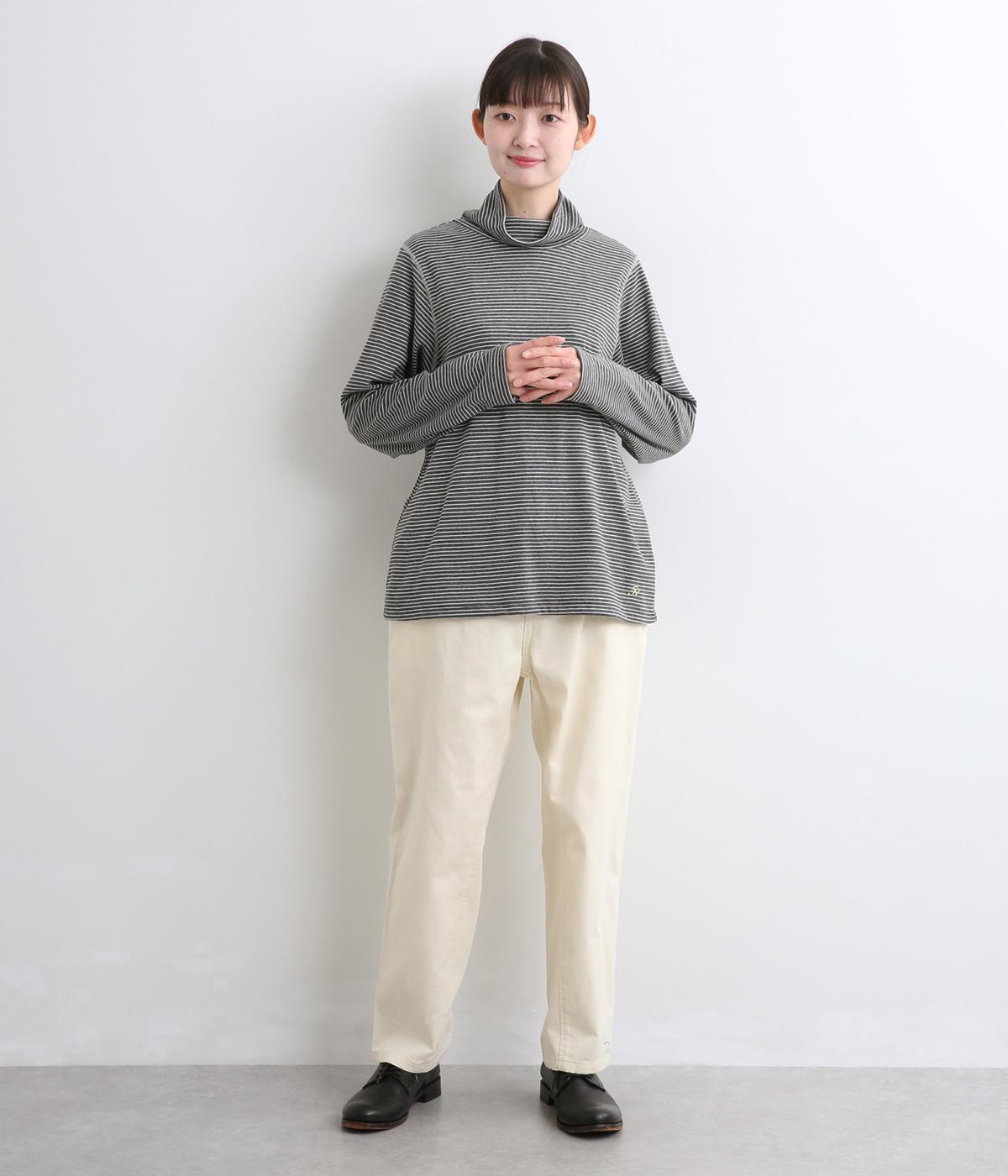 さらりと素肌にやさしい肌ざわりのコットン混のポリエステル生地を使用しました。心地いい伸縮性と、洗いをかけた味わいのある風合いが魅力の素材感です。