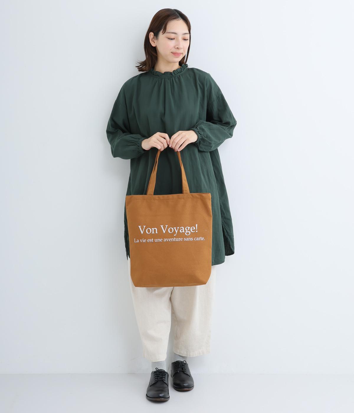 シワになりにくく乾きやすいポリエステルや、肌ざわりのよさを実感できるコットンなどを使用した混紡素材で仕上げました。あたたかさを感じさせてくれる深みのある色みに「Von Voyage!」のロゴがマッチ。