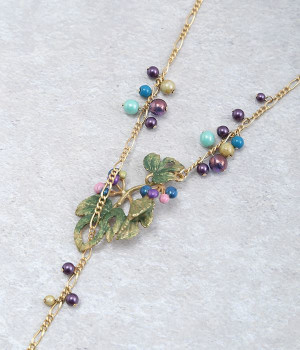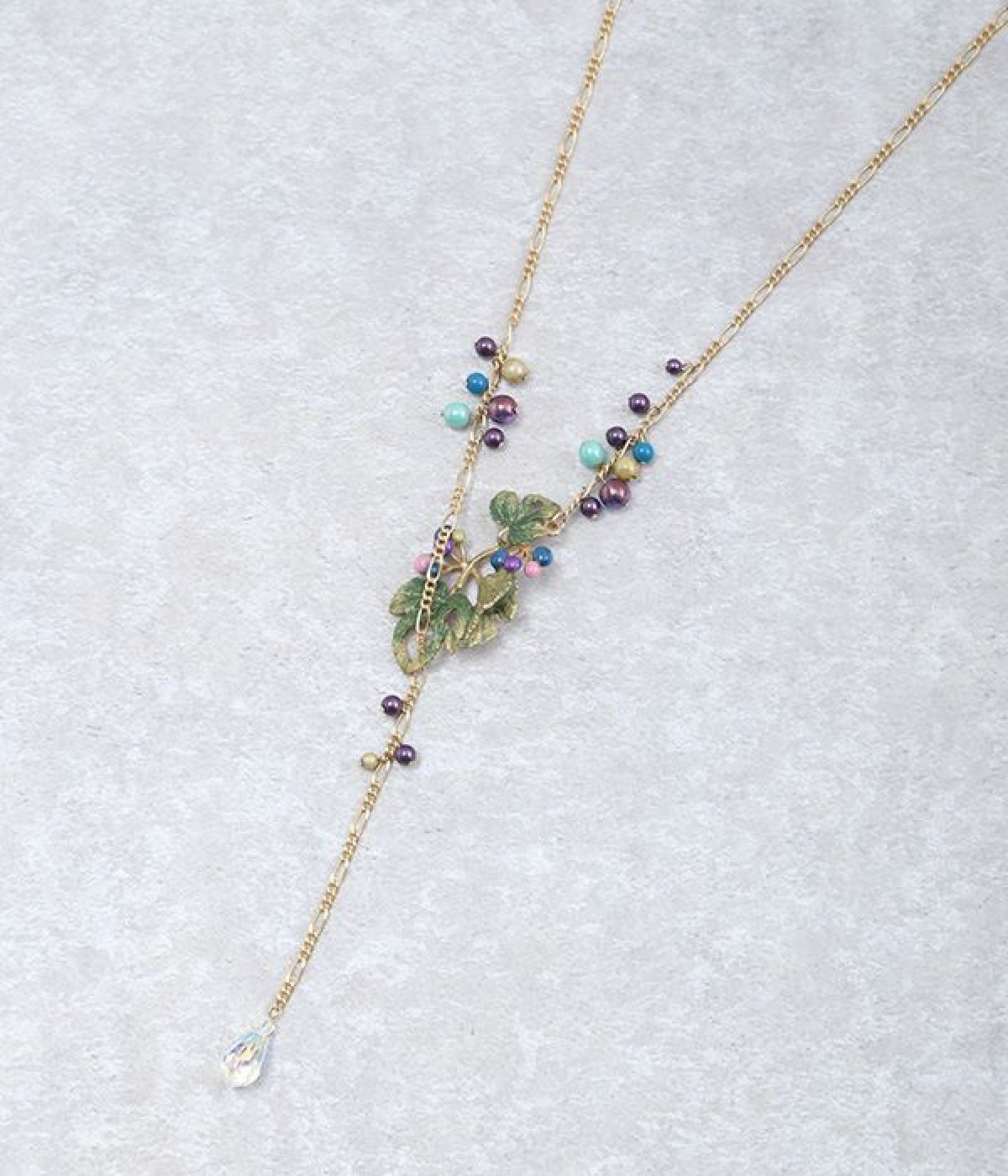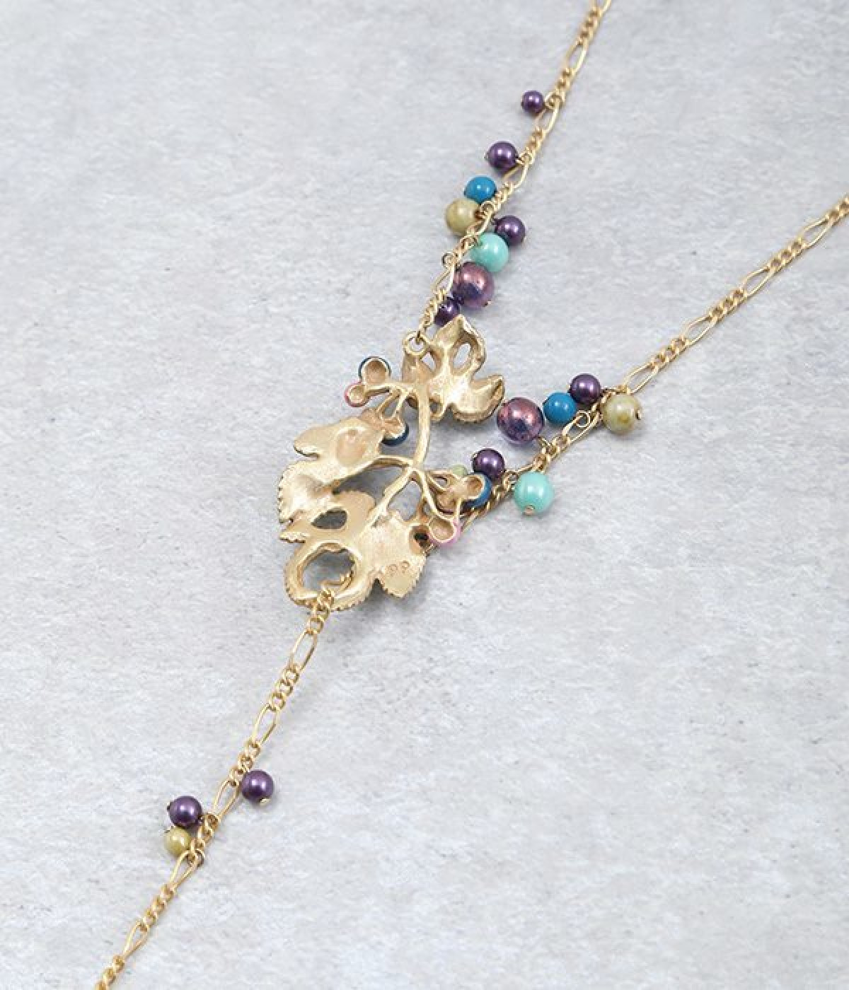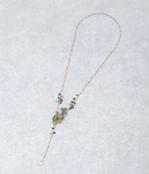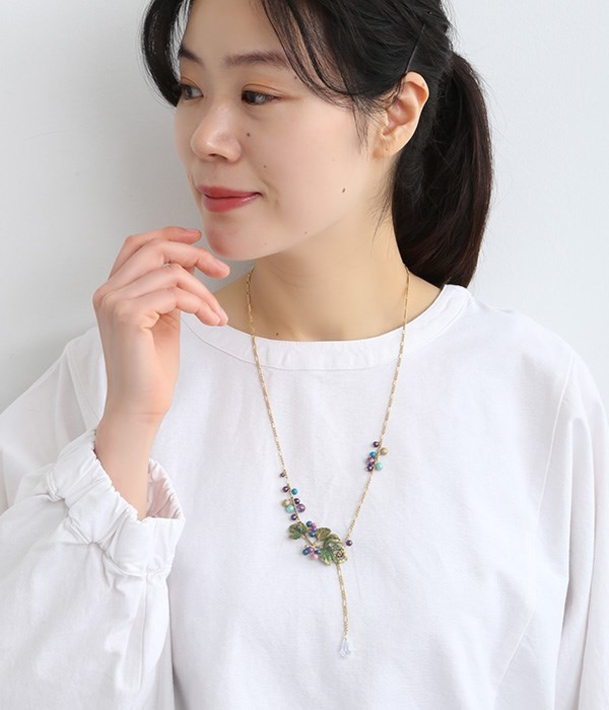 葉脈まで細かく再現されたノブドウの繊細さが魅力のラリエットネックレスです。ノブドウの花言葉は「慈悲」「慈愛」「人間愛」。留め具がないため頭からかぶるように着用し、虫食いの葉に通したチェーンで長さの調節が可能です。ブドウの実をイメージしたビーズが所々にあしらわれ、ボリュームのあるデザインは存在感も抜群。先端でゆらゆらと揺らめくカットガラスで、さらに印象を残します。