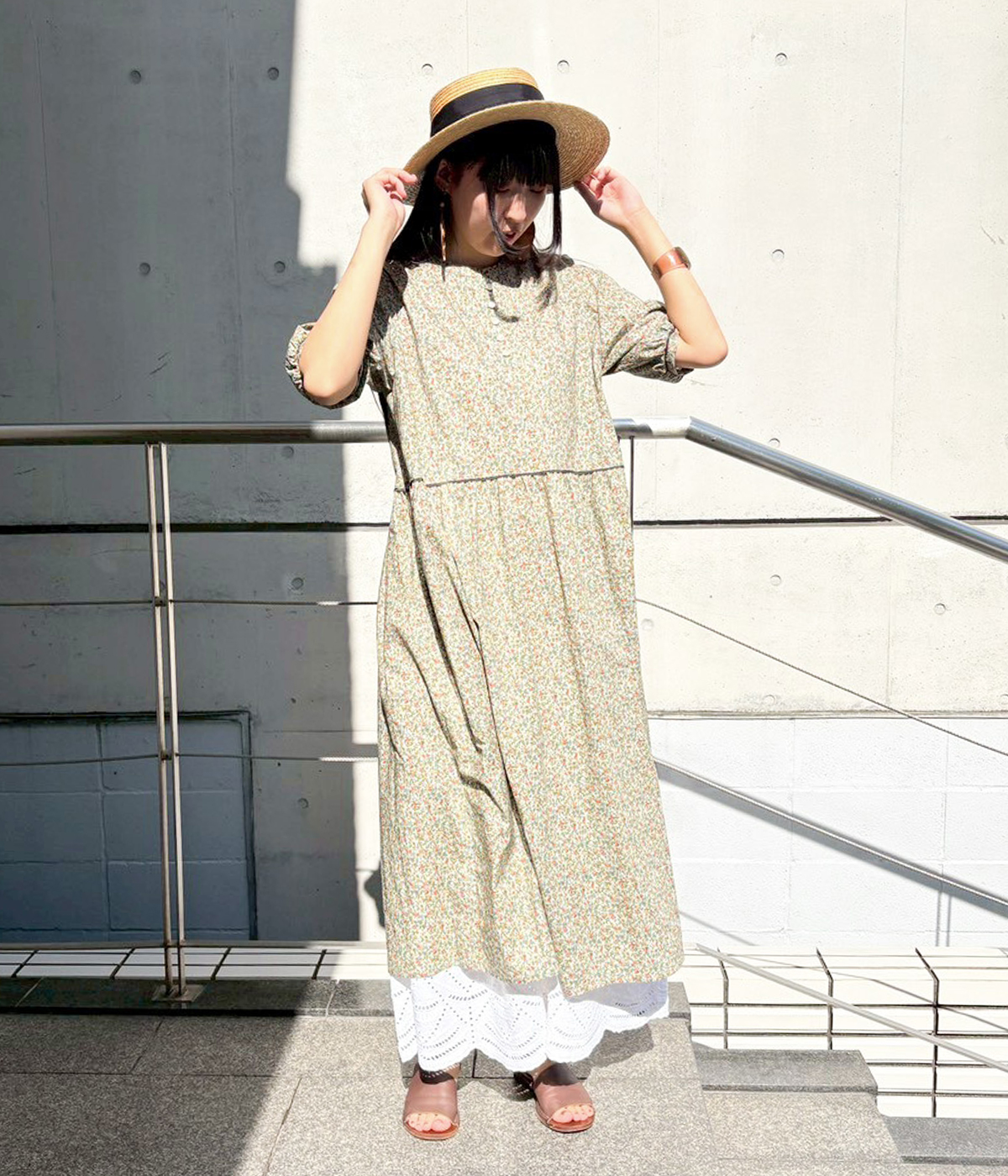 一枚でもおしゃれが完成するワンピースですが、裾からレースを覗かせるとセンスアップ。