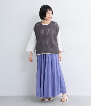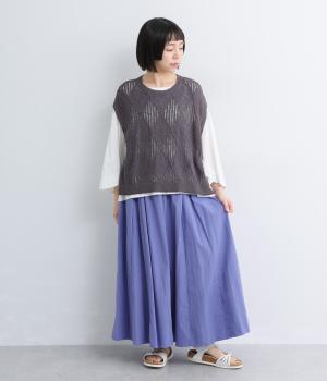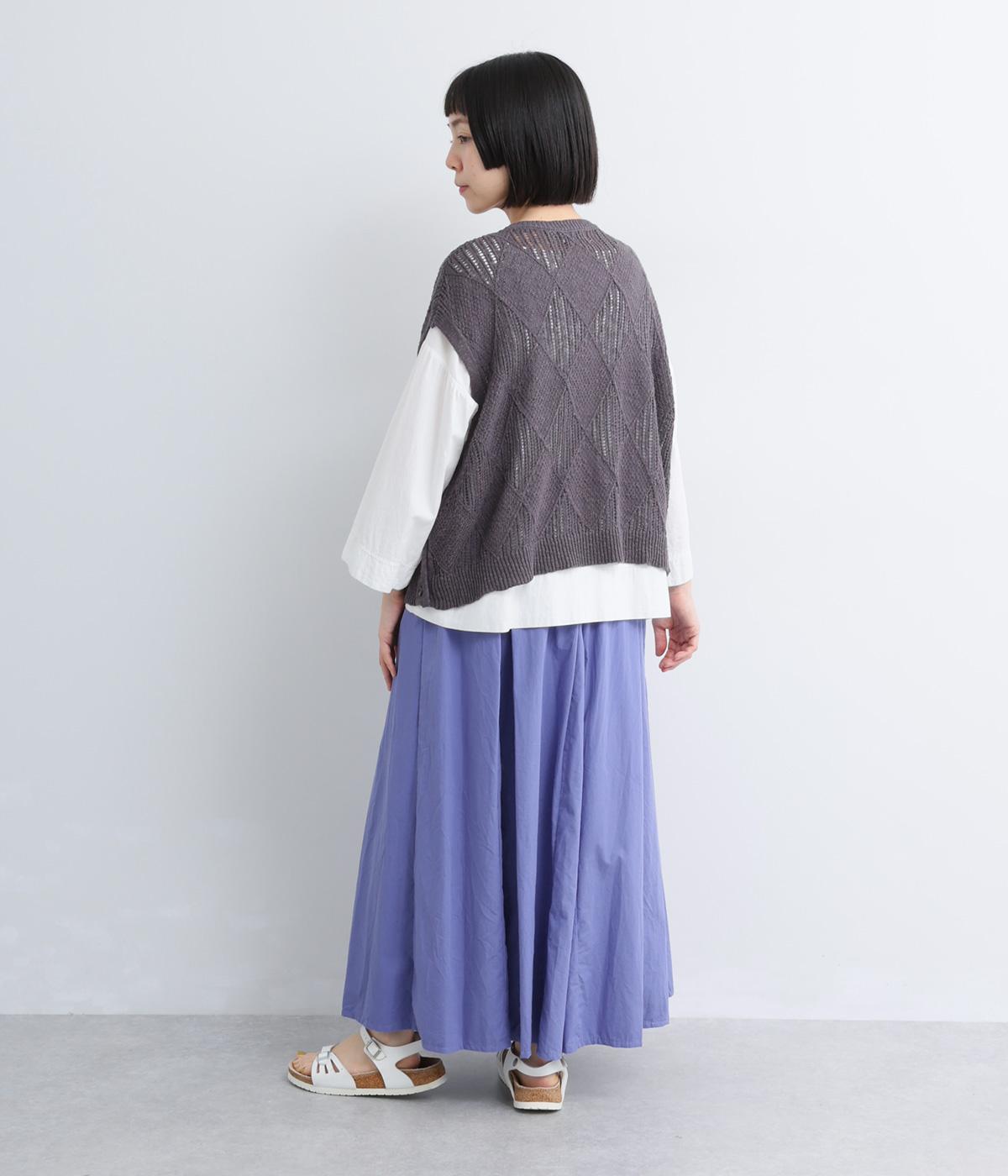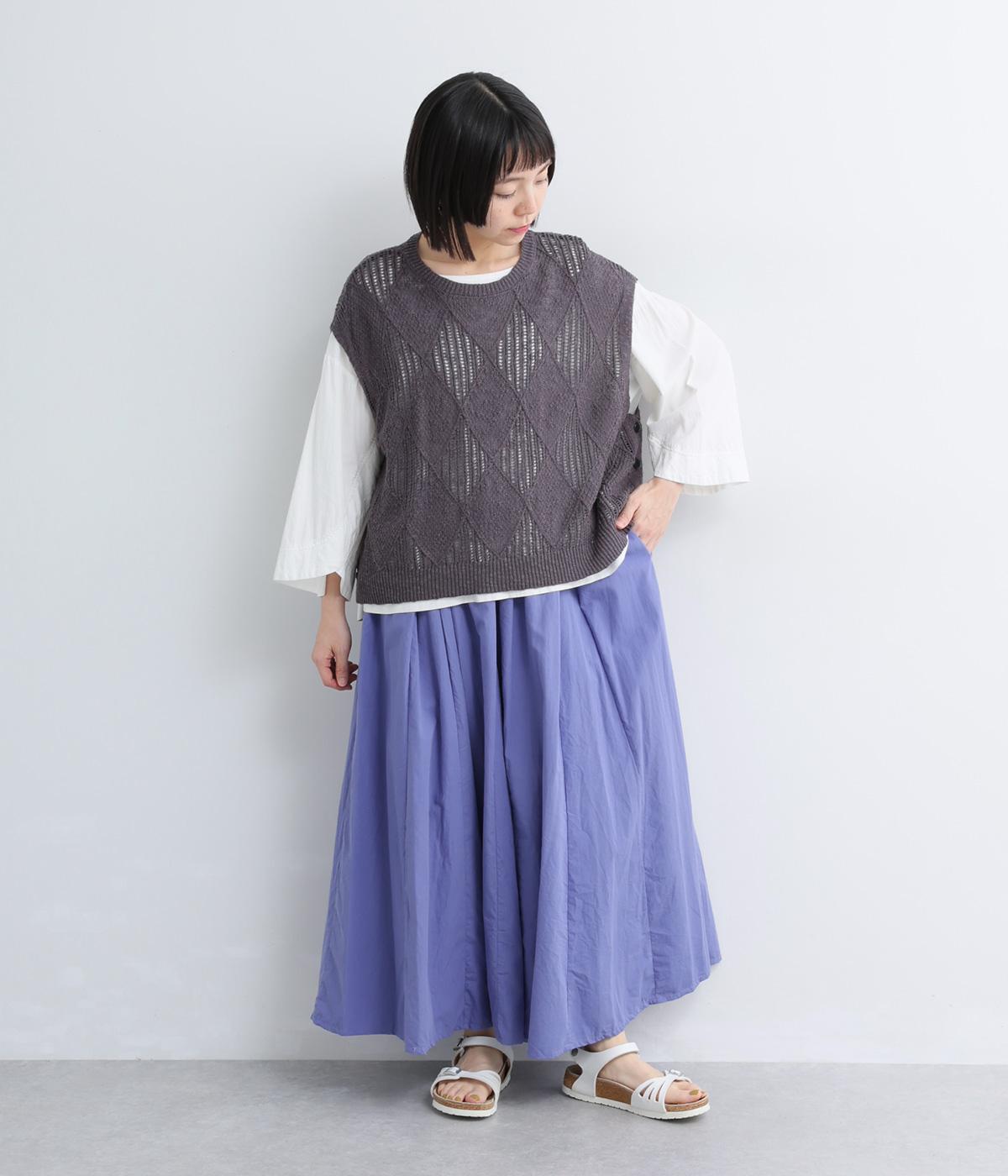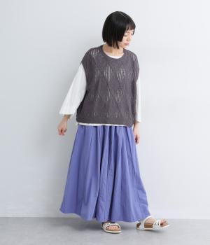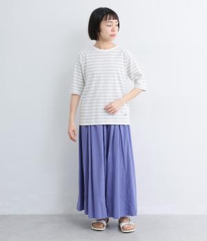 ウエストにたっぷりと施したギャザーが、やわらかな立体感を生み出すロングスカートです。三角マチを入れることで、動きに合わせて裾がふわりと広がり、軽やかなシルエットを描きます。ウエストは総ゴム仕様で快適なはき心地に。カジュアルにもフェミニンスタイルにも合わせやすい、万能な一枚です。