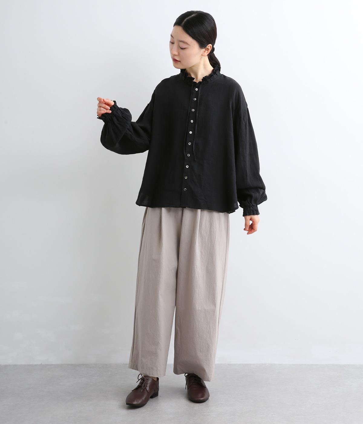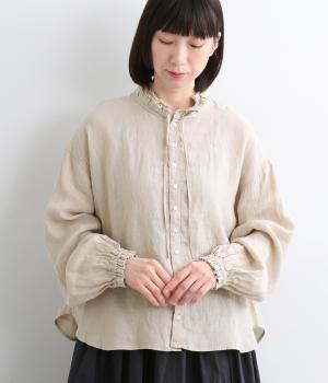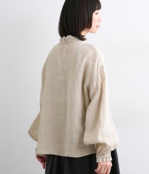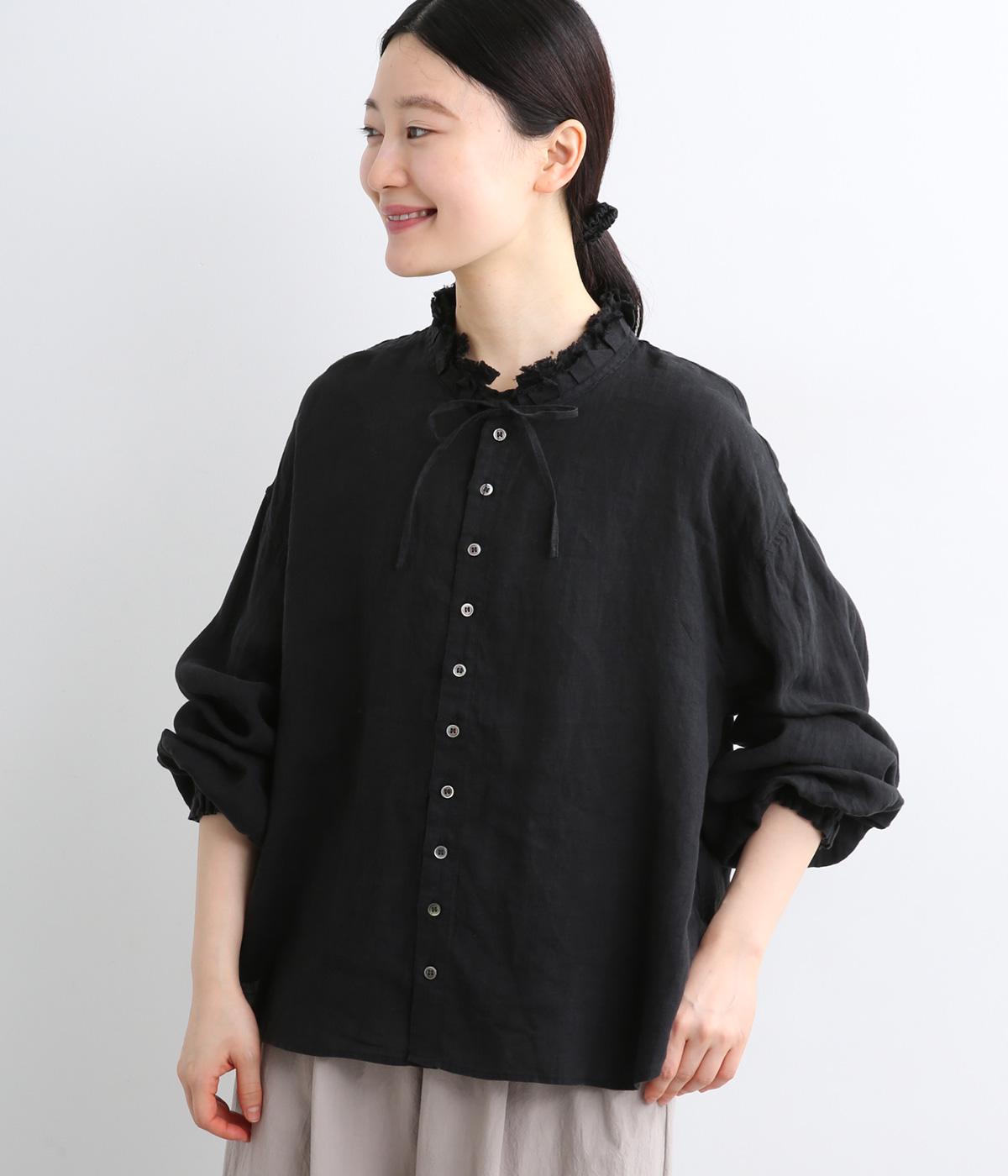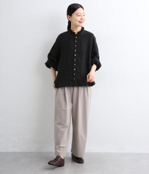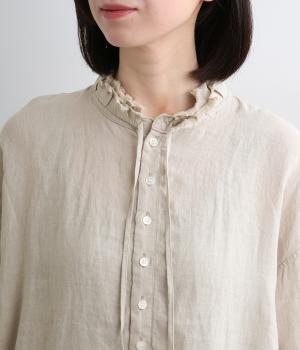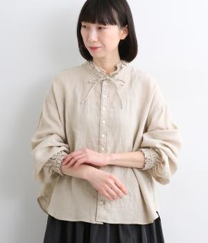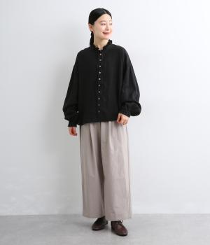 首元の二重フリルに表情をつけられる細リボン、ふわりとした袖がナチュラルな中にも可愛らしさを運ぶ一枚。袖口はゴムギャザーなのでたくし上げるとボリューム感アップ。間隔せまく多めに配したボタンが上品な印象を与えます。