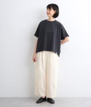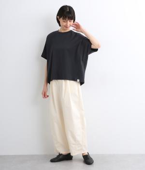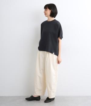 少しハリがありツヤ感がきれいめな印象をもたらすコットンポンチ素材を使用しています。やわらかで弾力性があり、シルエットをきれいに見せてくれる生地感です。