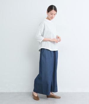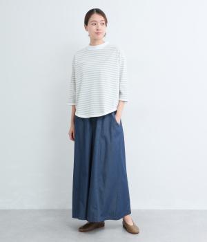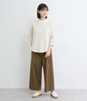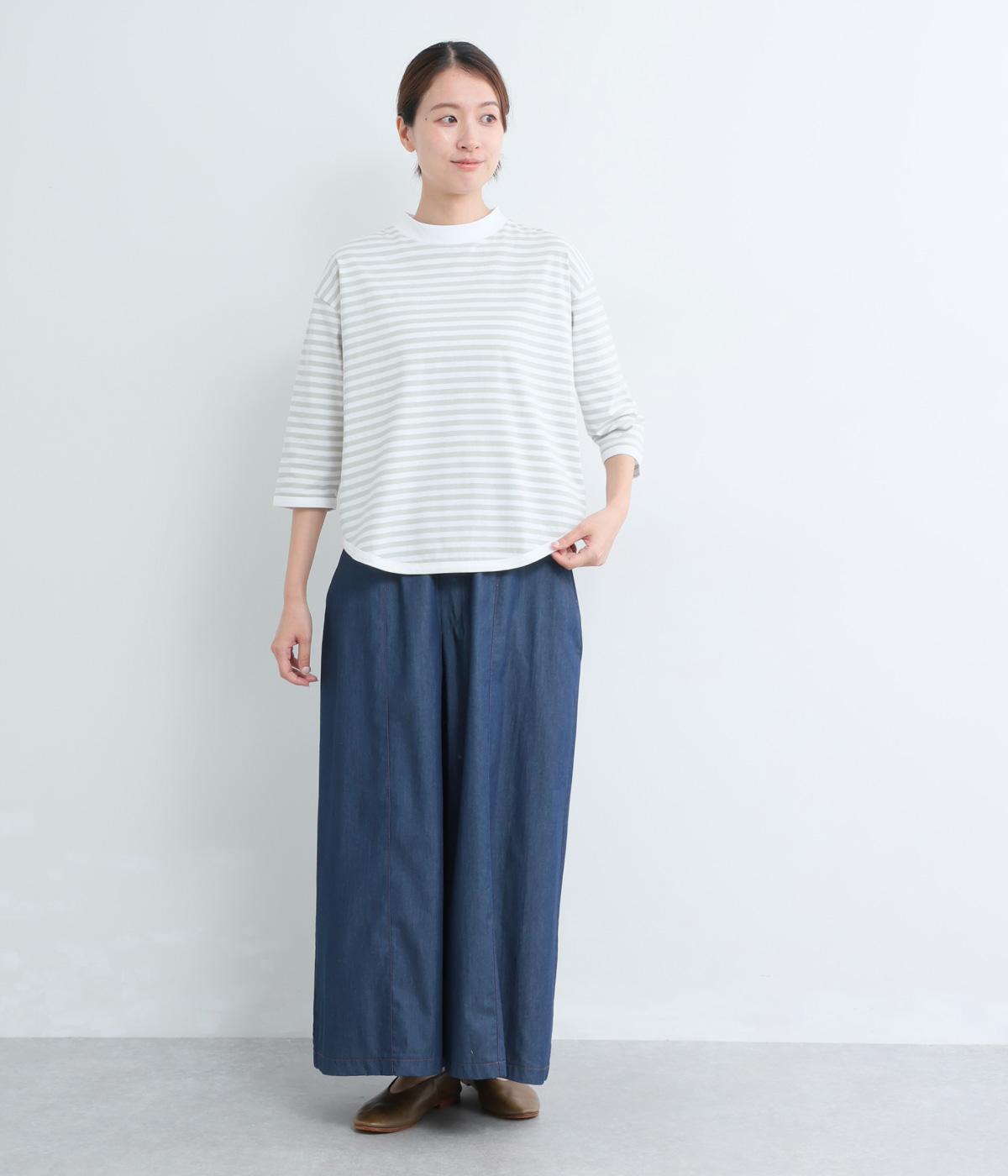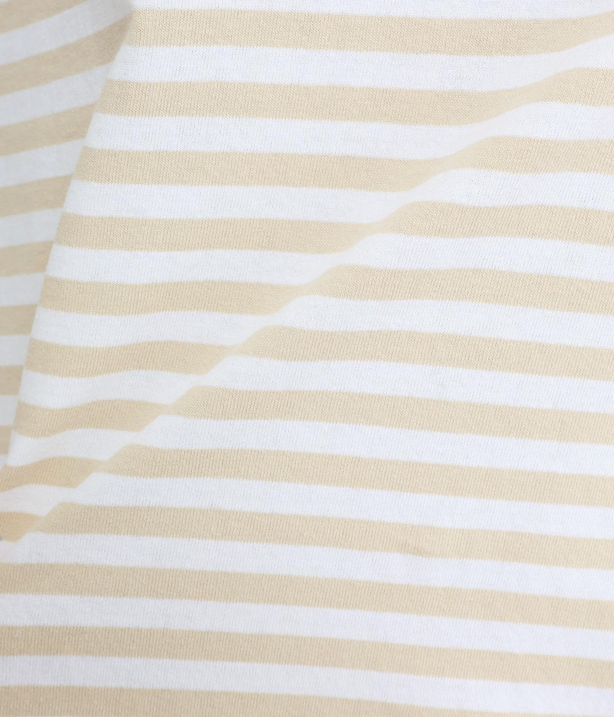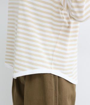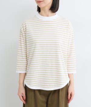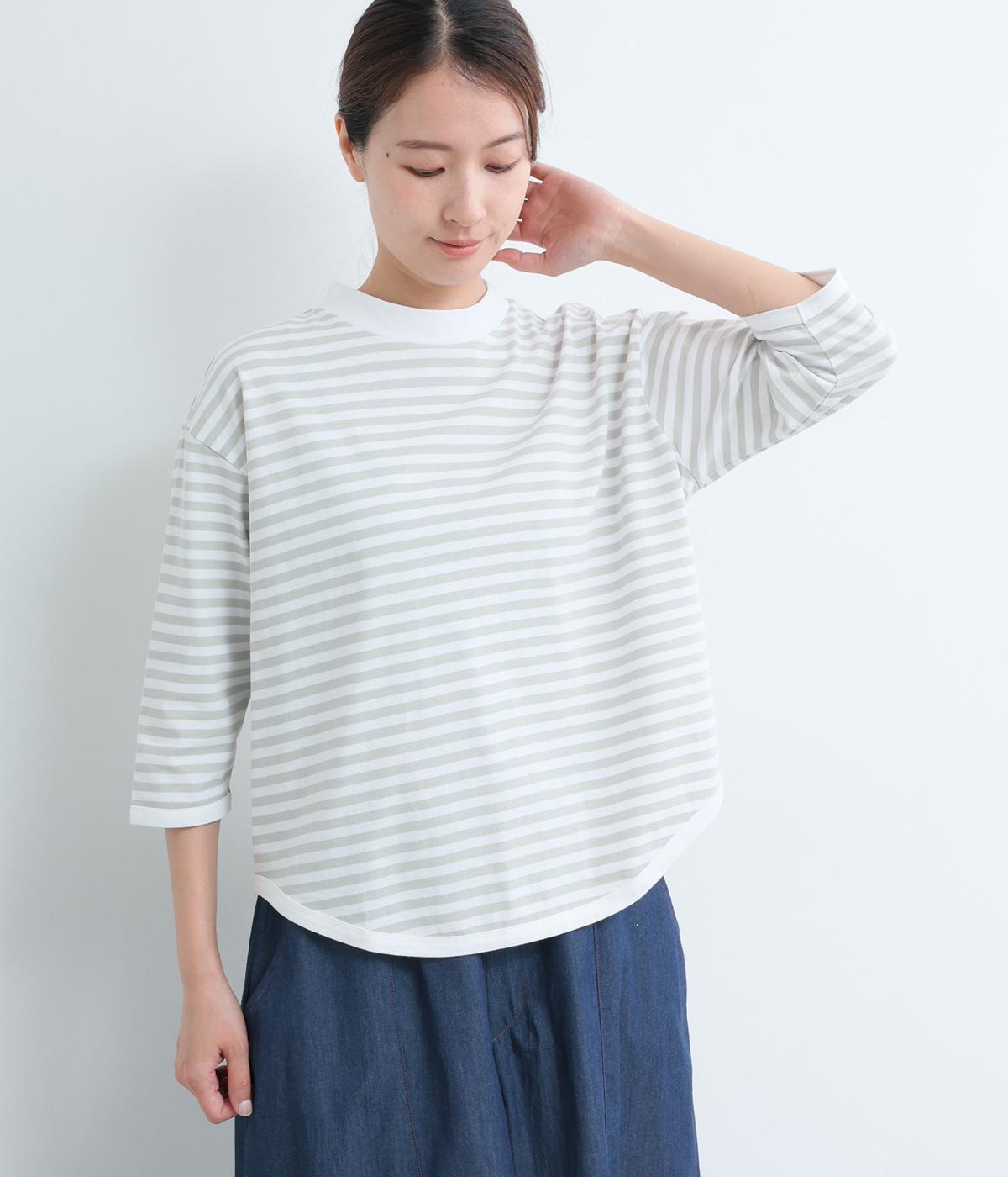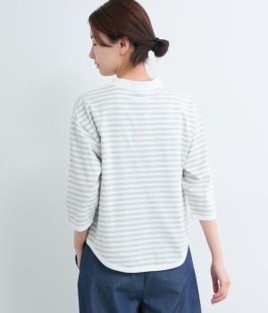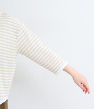 淡い色あいのボーダー柄がデイリースタイルになじむ一枚。クレリックタイプの切り替えがさわやかな風を運び、七分袖が手元の抜け感をプラス。ラウンドヘムラインでボトム合わせしやすく、トップスアウトもお洒落見え。