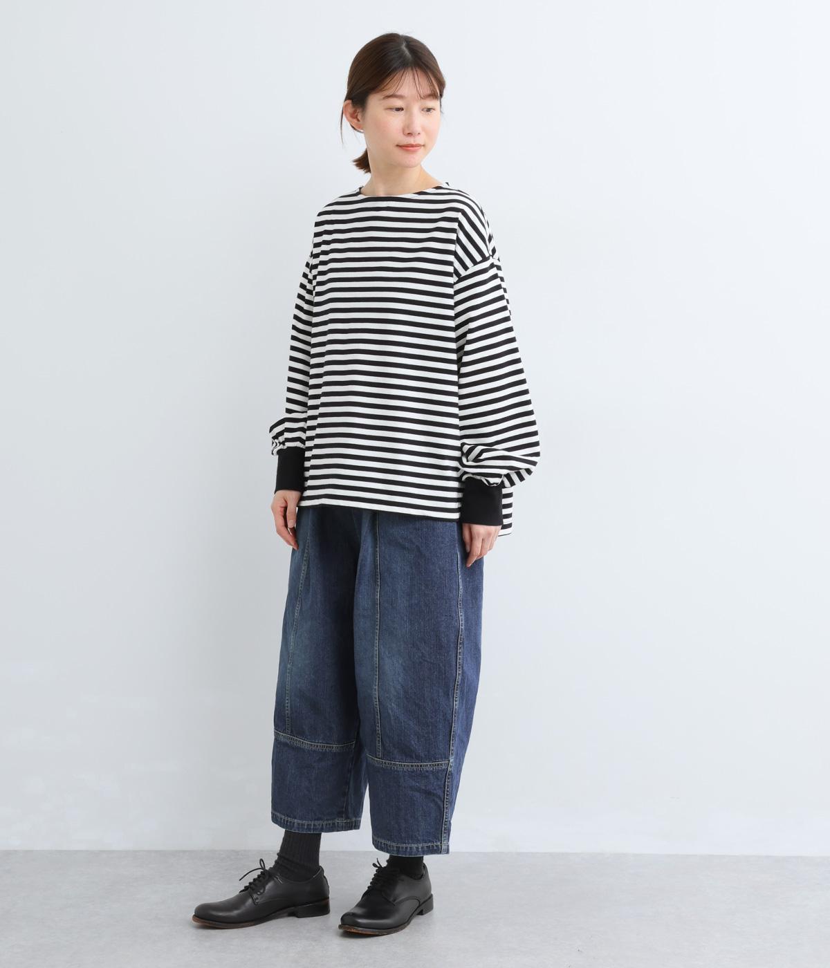樽のようなコクーンシルエットのトヌーパンツ。前面の切り替えがシルエットを引き立たせます。ウエストは前はすっきりフラットに、うしろにはゴムを配して穿き心地を高めました。内紐で調節可能です。