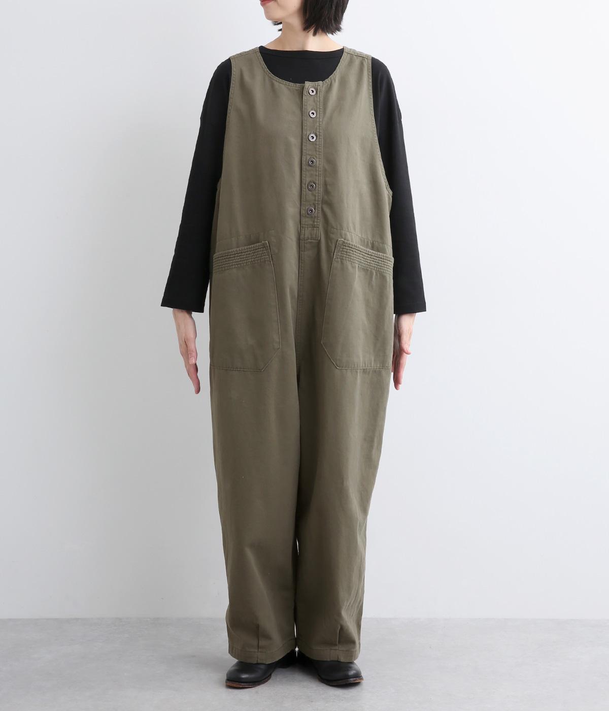 作業用のつなぎのような、ワークテイストのサロペットパンツです。ステッチワークがポイントになった大きなポケットがかわいらしさをプラス。前ボタンは金属の打ちボタンで、着脱のしやすさも◎。