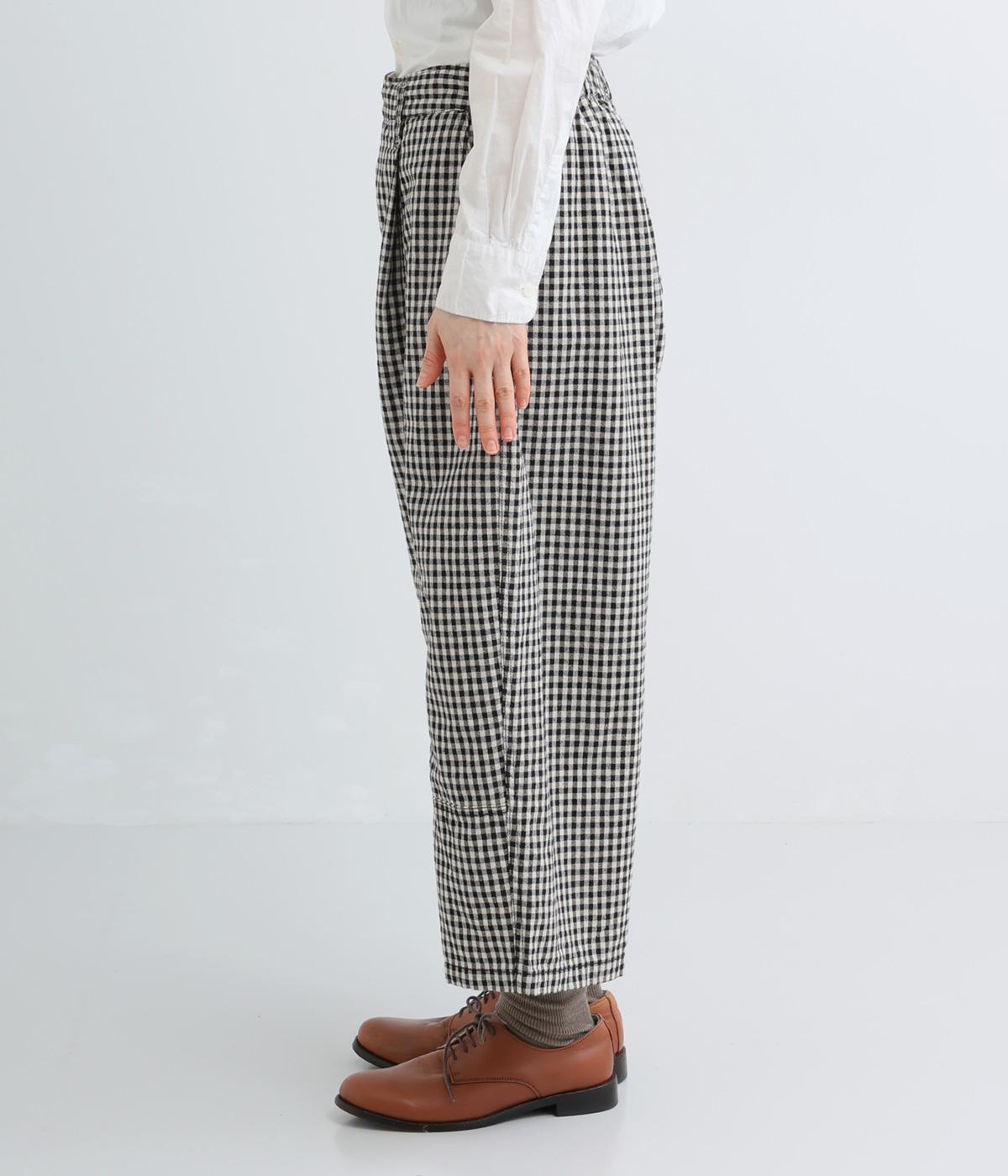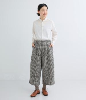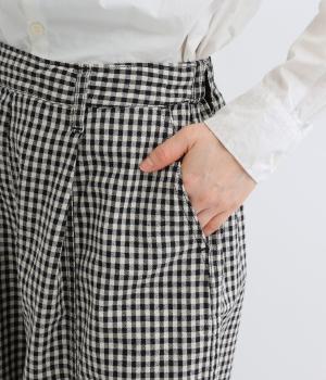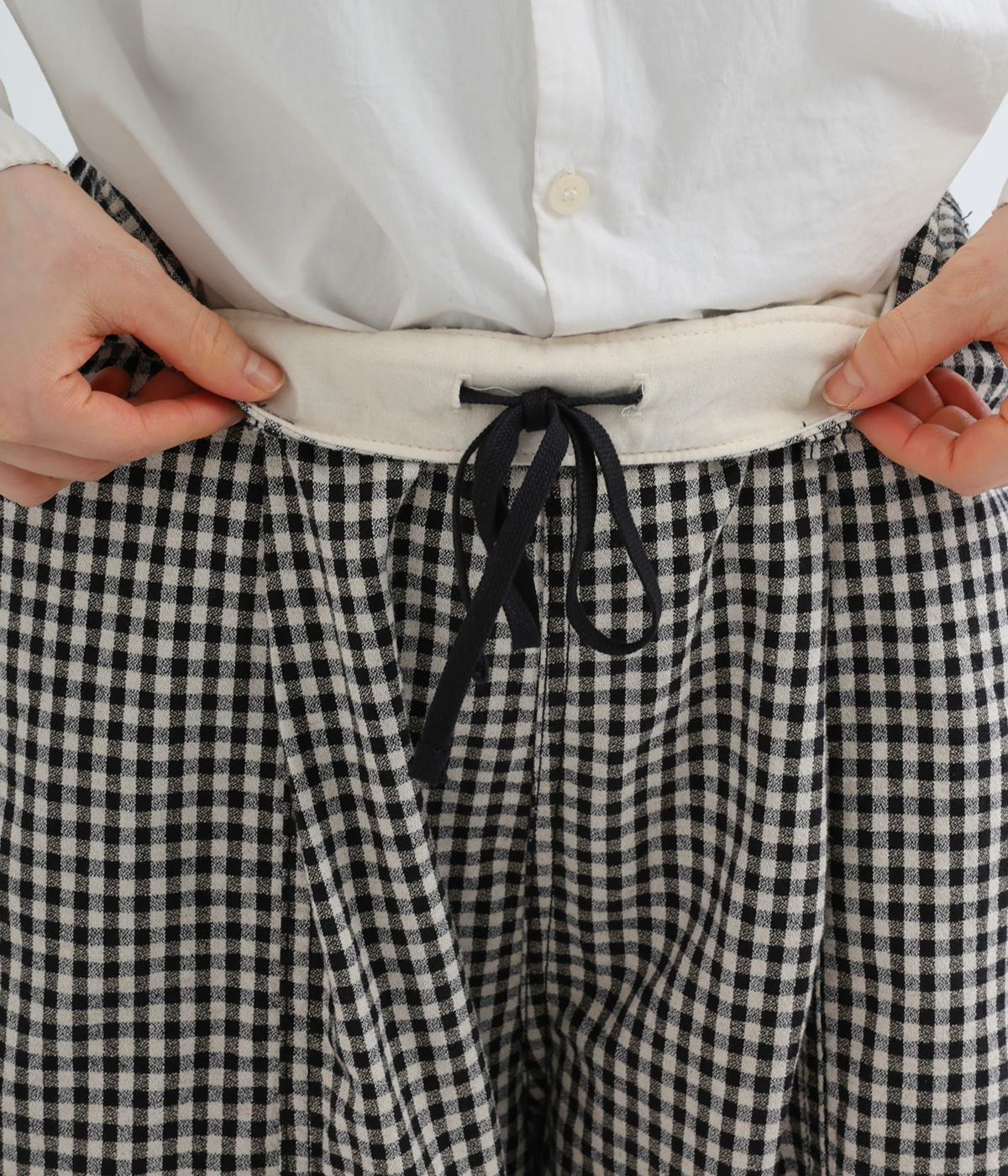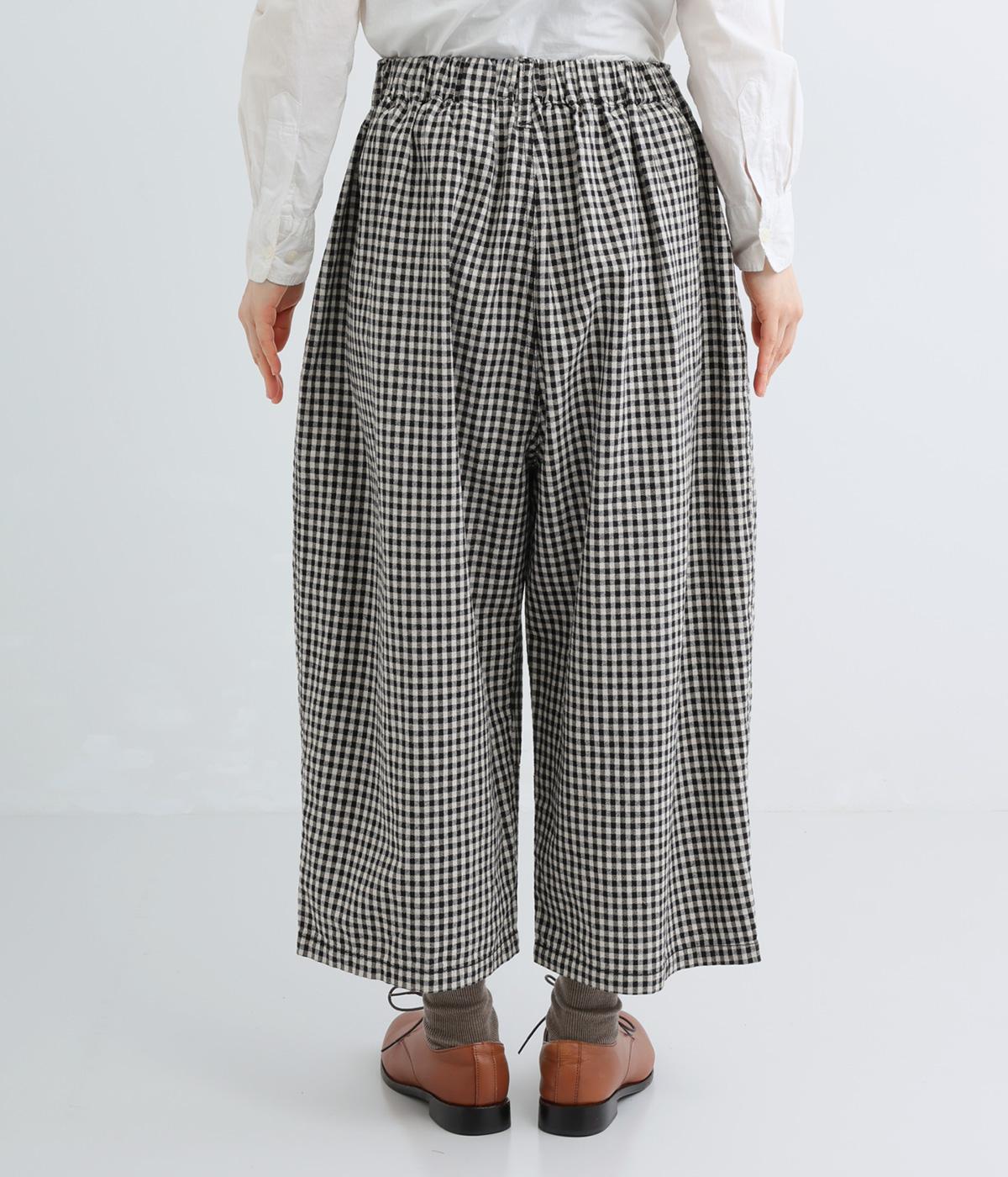脚のラインを拾いにくいワイドストレートシルエットを足首が出る丈感に仕立てました。ウエスト前面はフラットに、うしろにはゴムを配し、内紐でサイズ調節ができます。ベルトループ付きでトップスインのスタイリングもおすすめです。