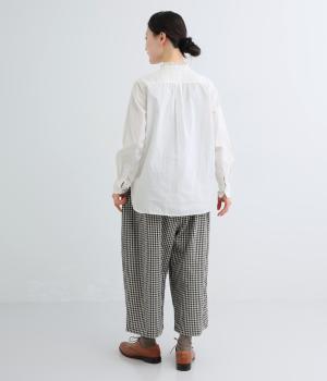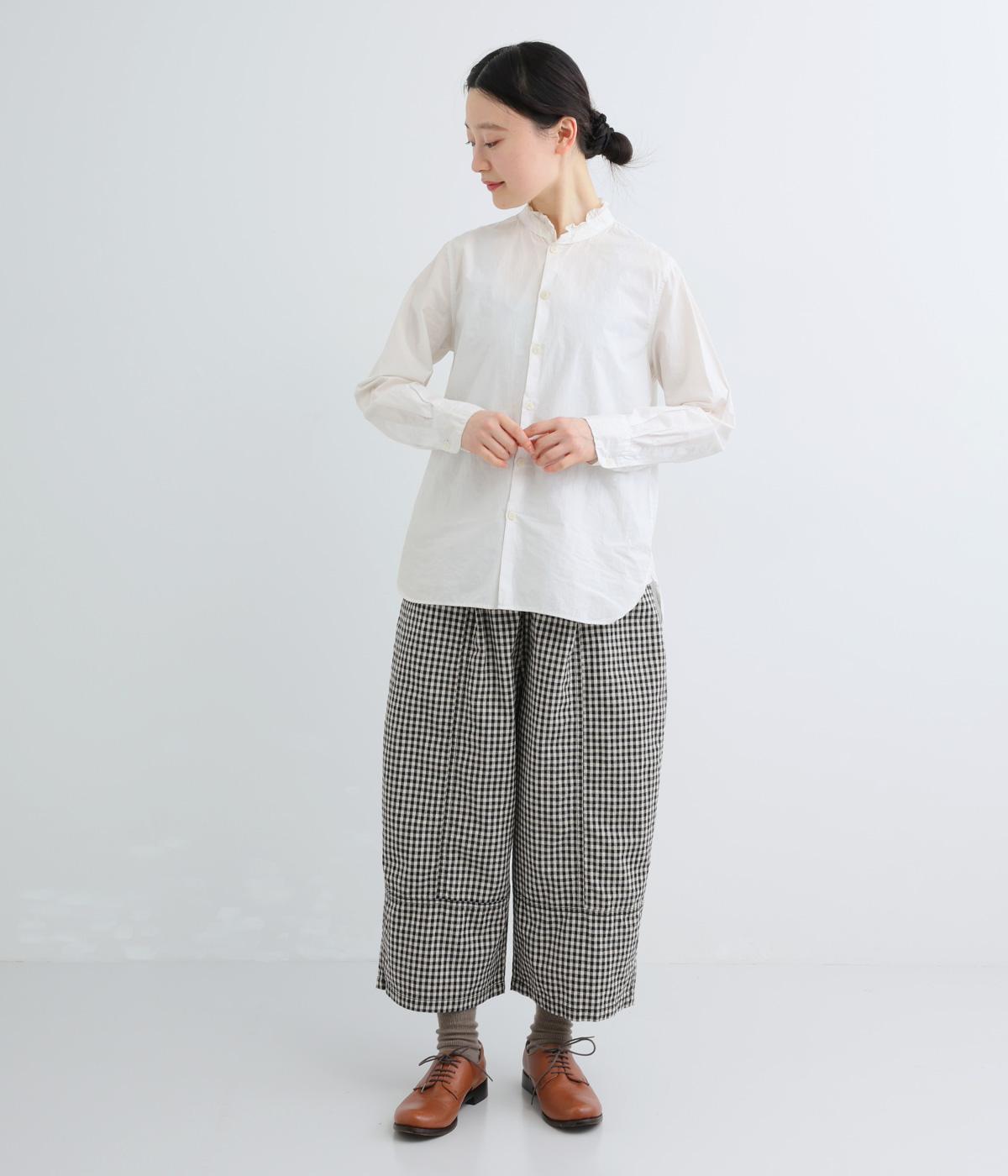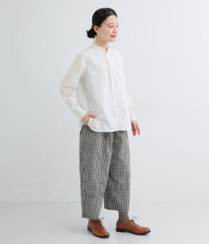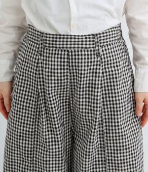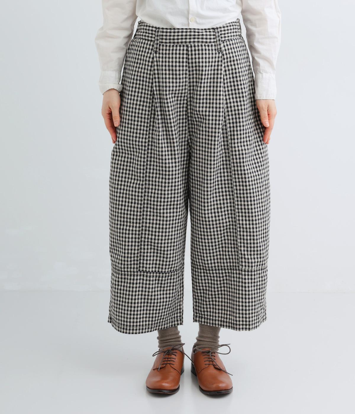 脚のラインを拾いにくいワイドストレートシルエットを足首が出る丈感に仕立てました。ウエスト前面はフラットに、うしろにはゴムを配し、内紐でサイズ調節ができます。ベルトループ付きでトップスインのスタイリングもおすすめです。