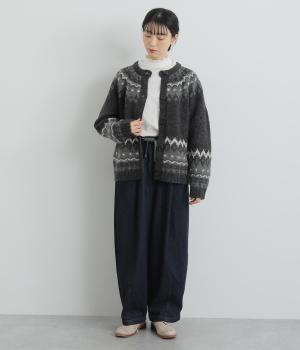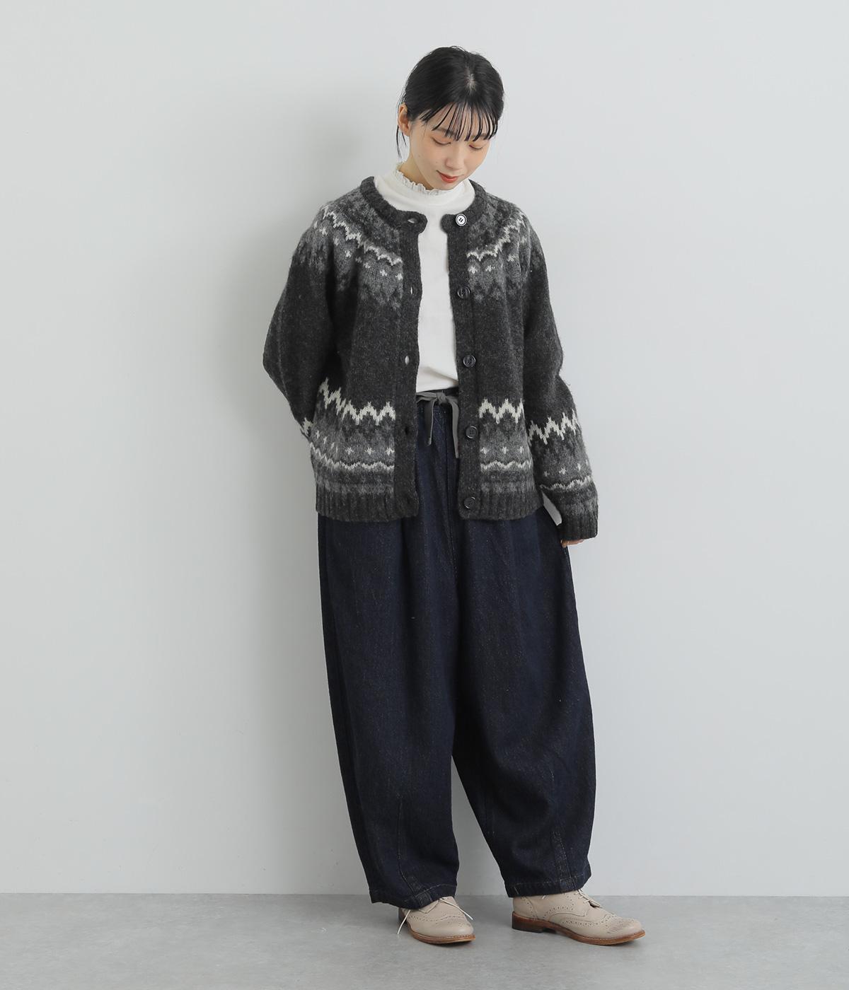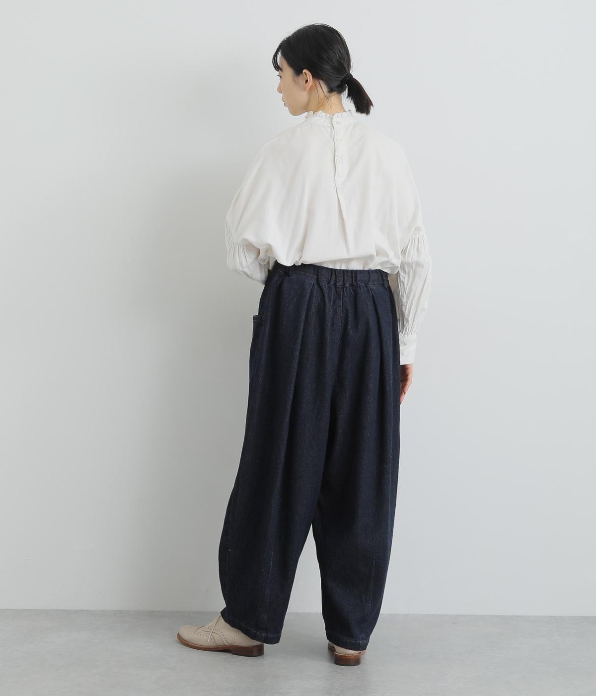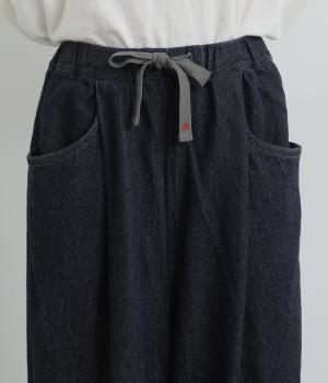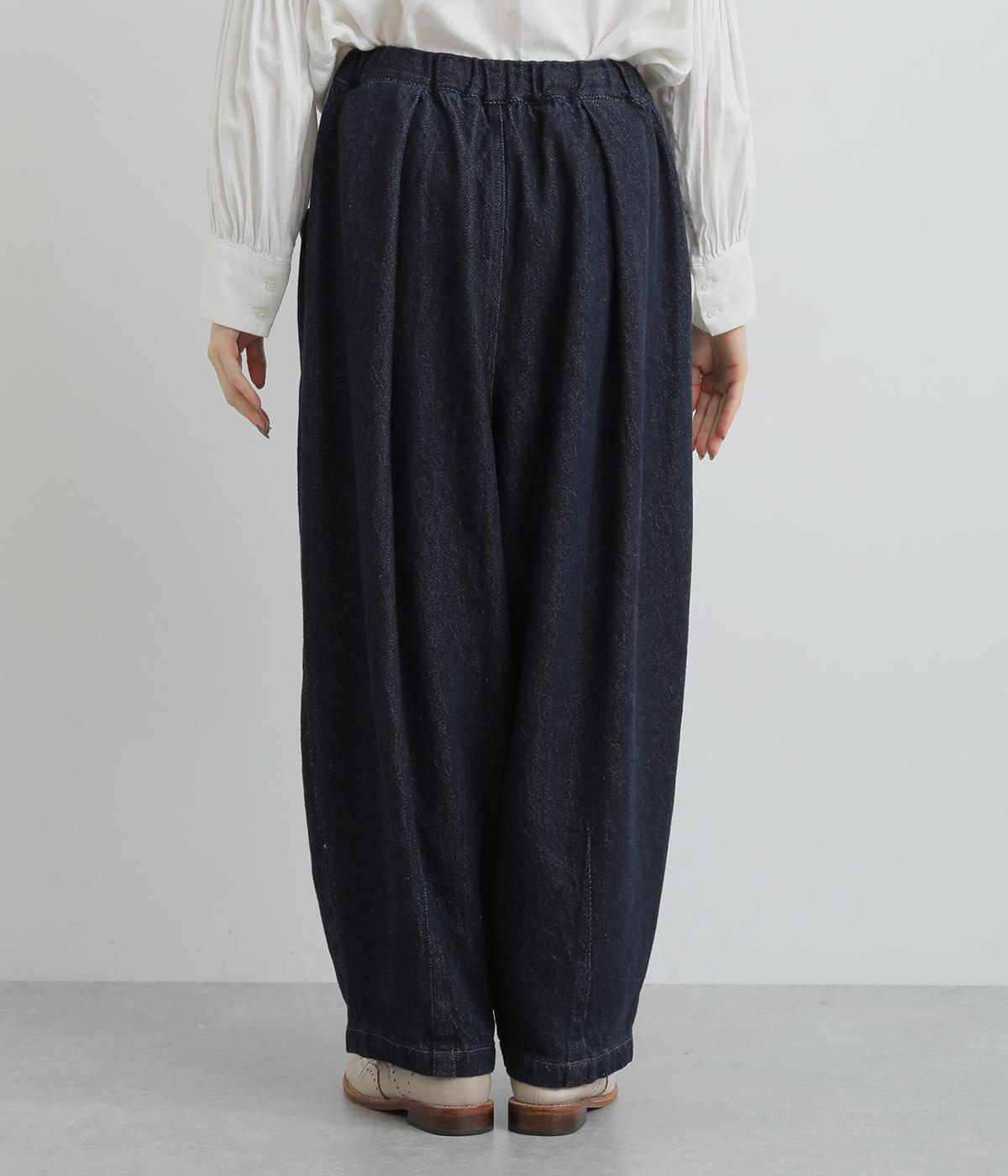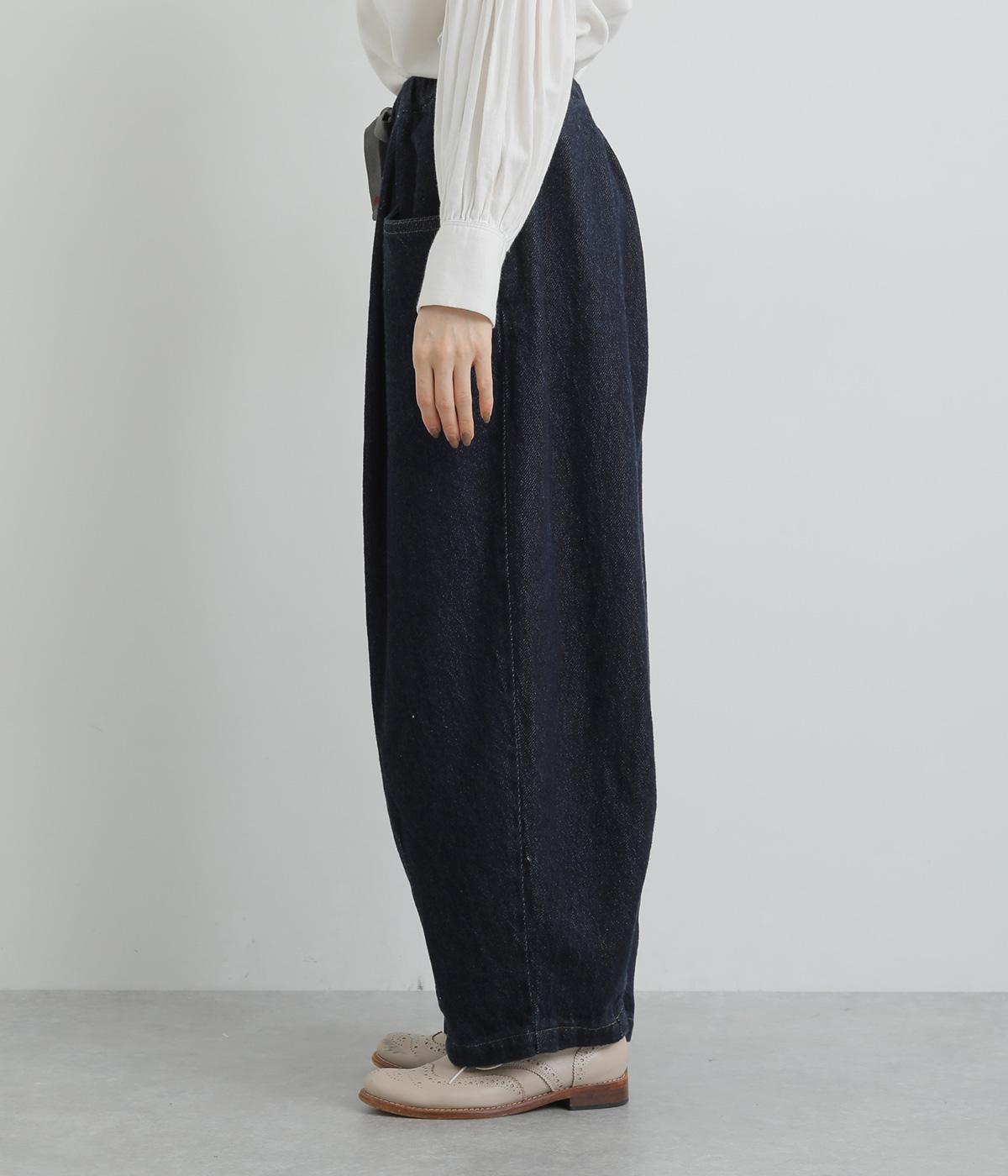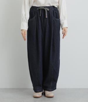 風船のように膨らんだシルエットが特徴的なバロンパンツ。裾に大きなダーツを入れて細くし、シルエットにメリハリをつけています。立体感のあるサイドポケットが気になる体のラインをカモフラージュ。ウエストは総ゴム仕様で、外側にフィット感を調整できる紐を通しました。
