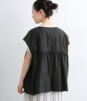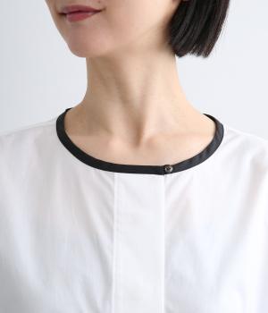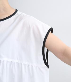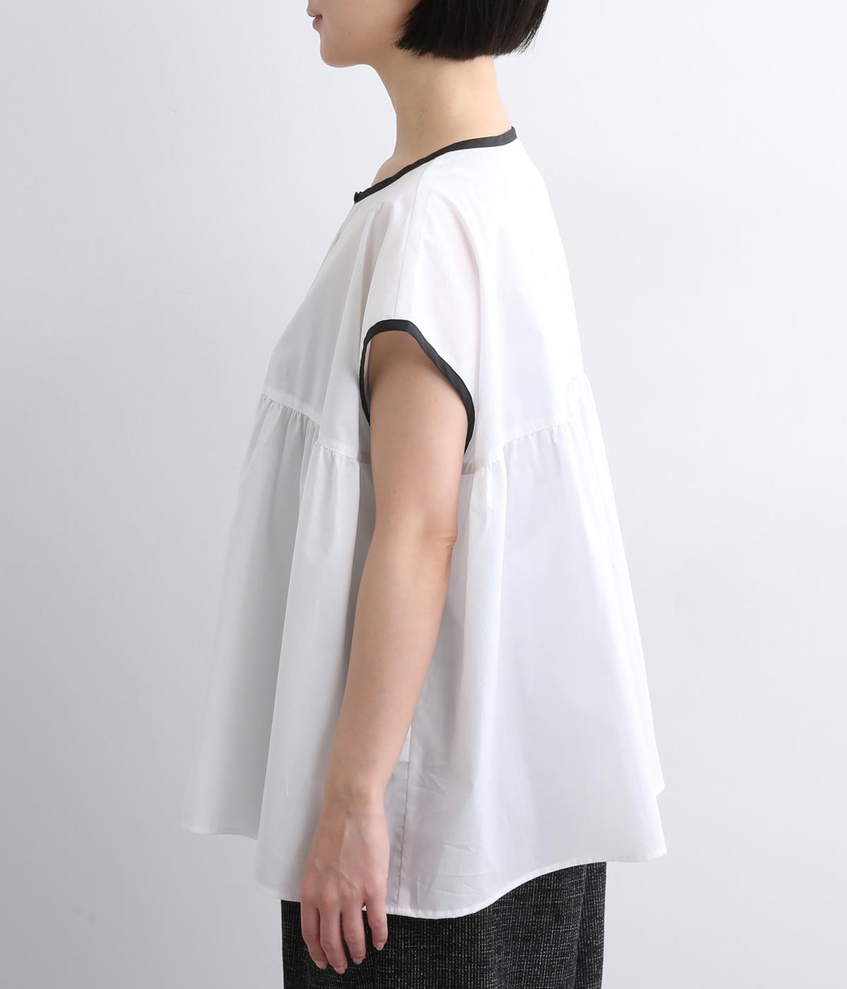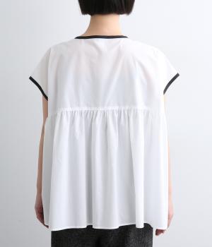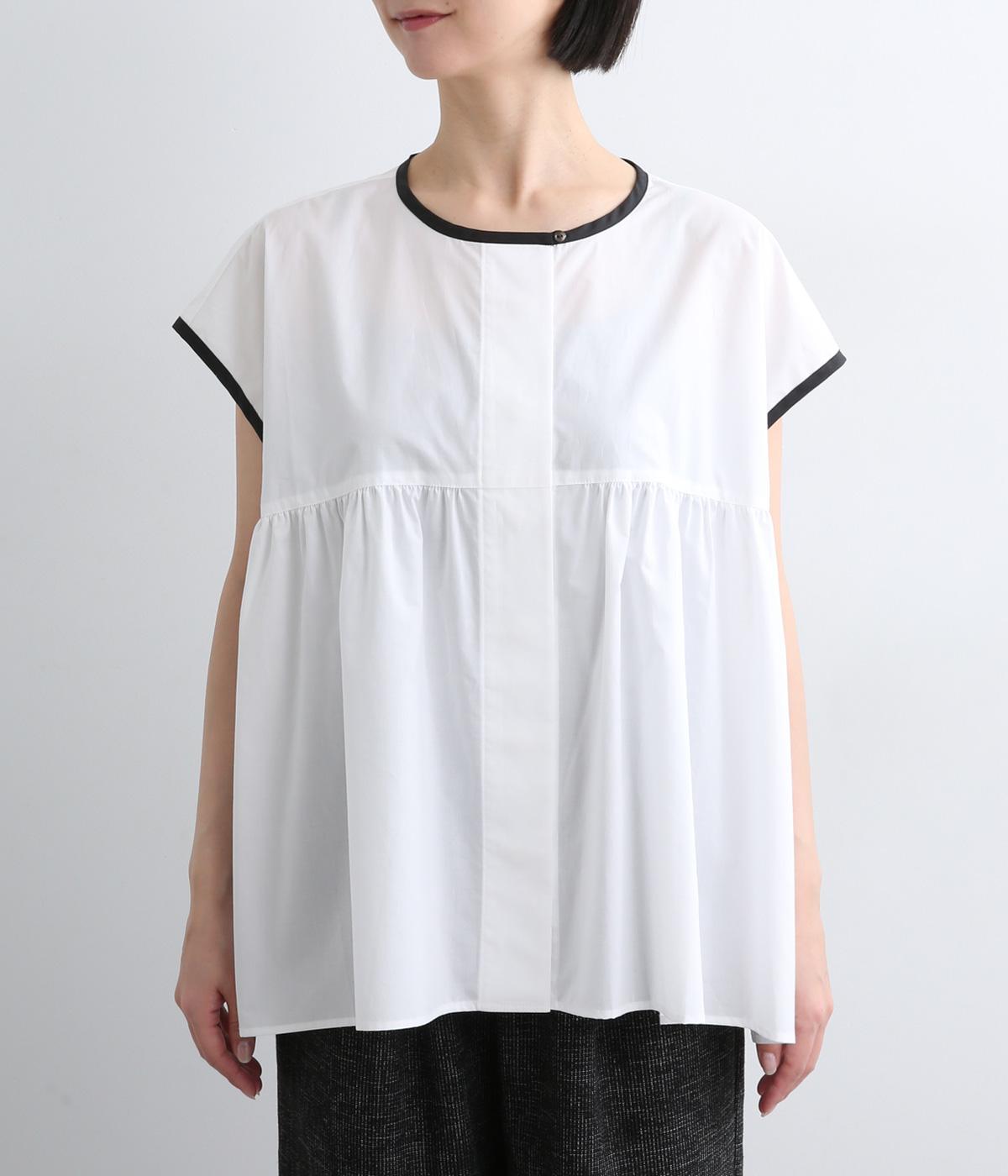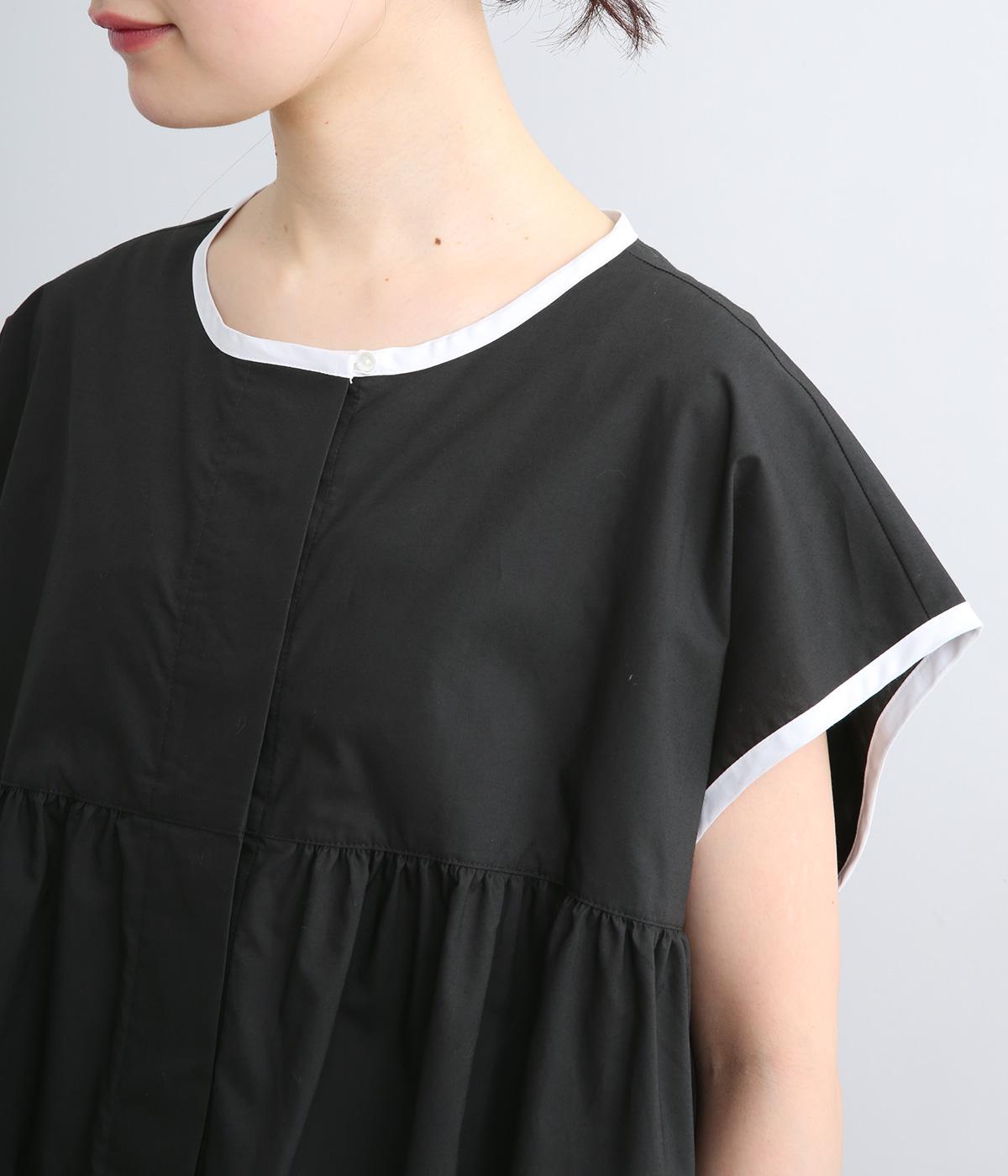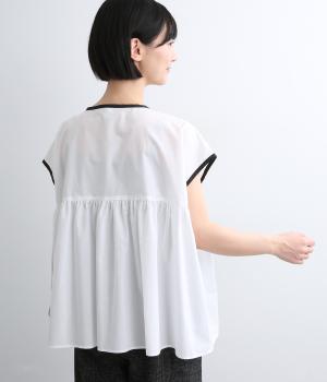 高めの位置に切り替えギャザーを寄せてふわりと軽やかなシルエットを描いた一枚。襟と袖のバイカラーパイピングが、シンプルながらも洗練された印象に。ミニマムな比翼デザインで脱ぎ着もイージー。肌見せをおさえたフレンチスリーブも上品なポイント。