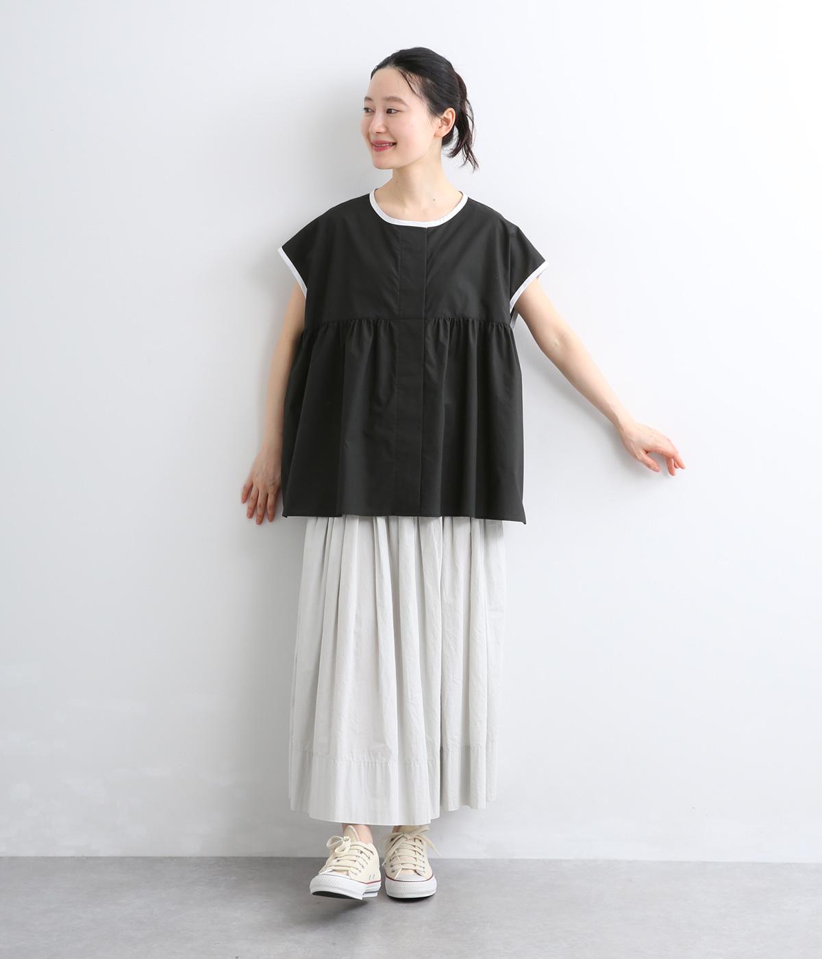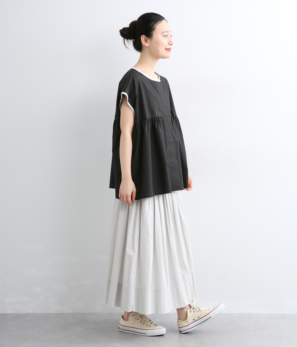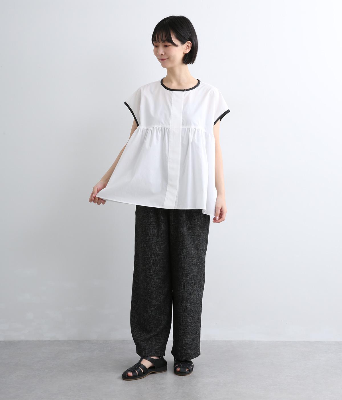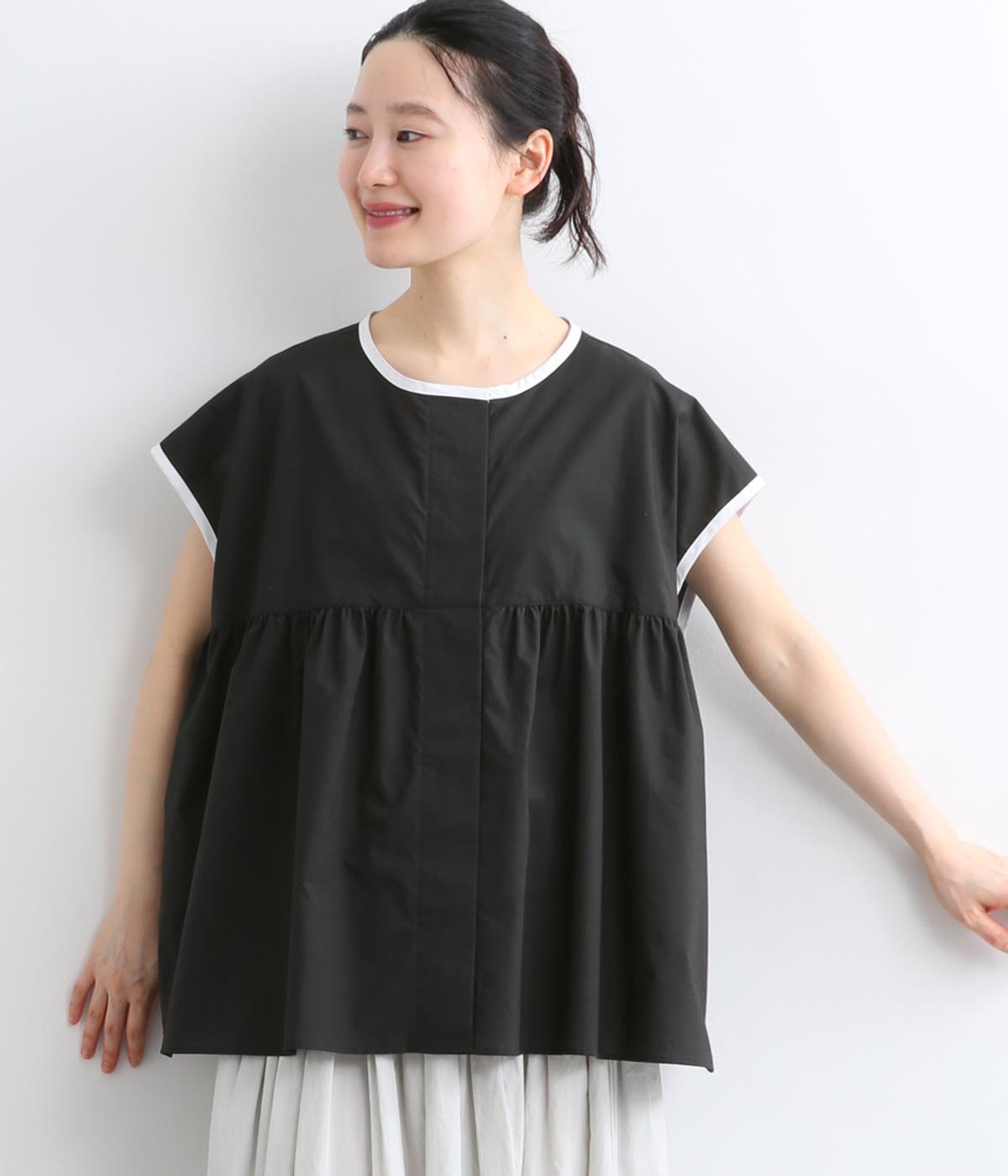 高めの位置に切り替えギャザーを寄せてふわりと軽やかなシルエットを描いた一枚。襟と袖のバイカラーパイピングが、シンプルながらも洗練された印象に。ミニマムな比翼デザインで脱ぎ着もイージー。肌見せをおさえたフレンチスリーブも上品なポイント。