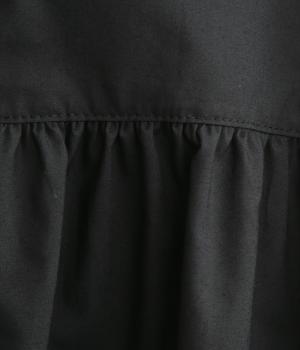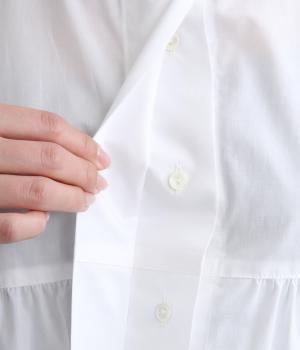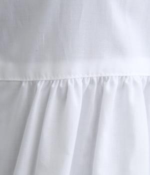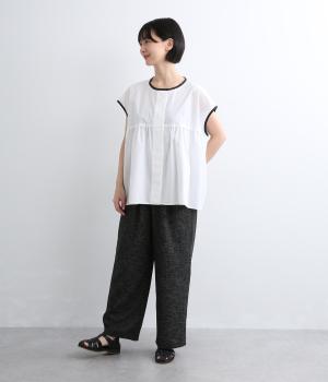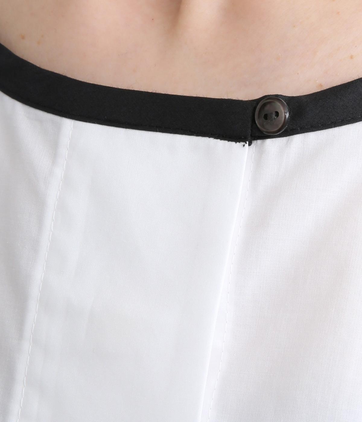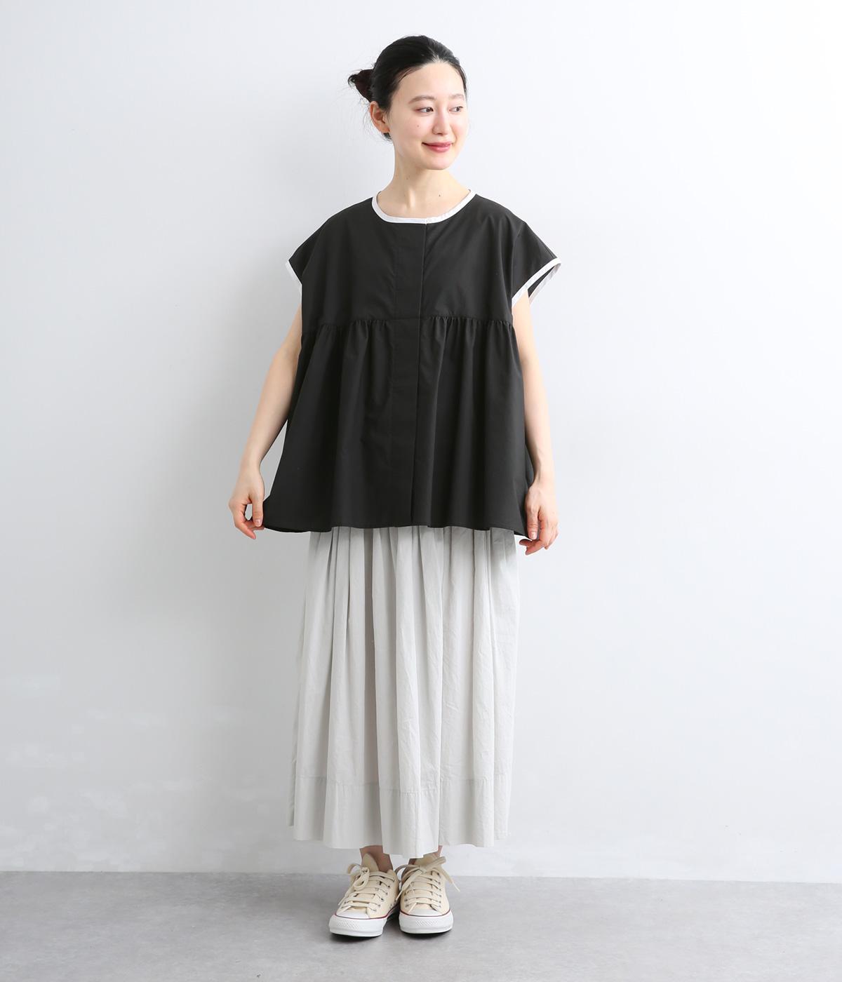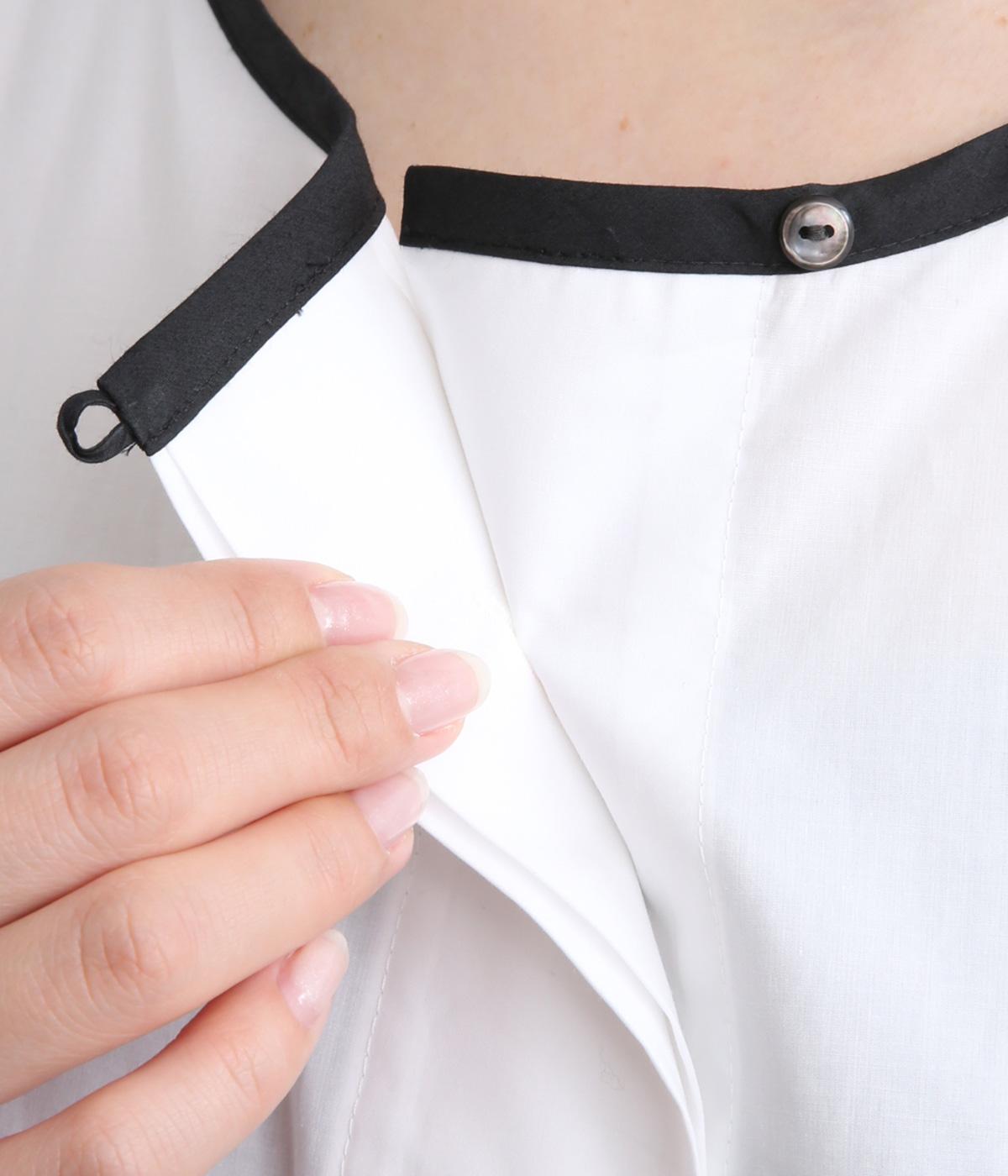 高めの位置に切り替えギャザーを寄せてふわりと軽やかなシルエットを描いた一枚。襟と袖のバイカラーパイピングが、シンプルながらも洗練された印象に。ミニマムな比翼デザインで脱ぎ着もイージー。肌見せをおさえたフレンチスリーブも上品なポイント。