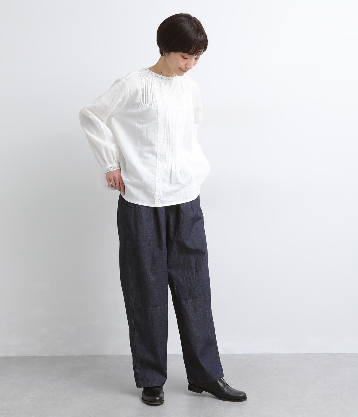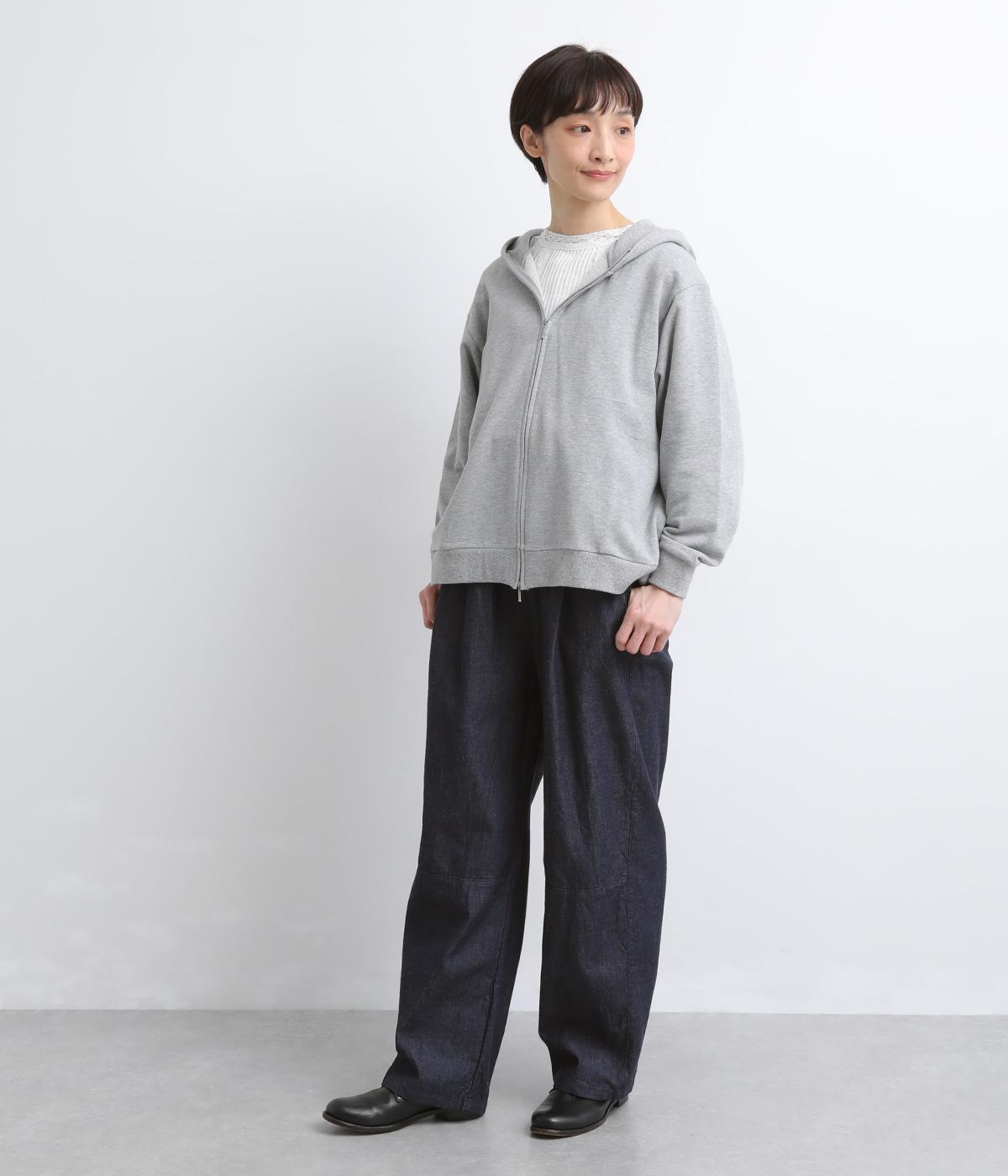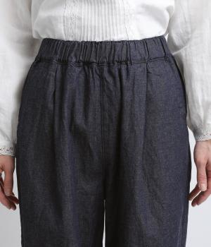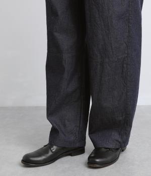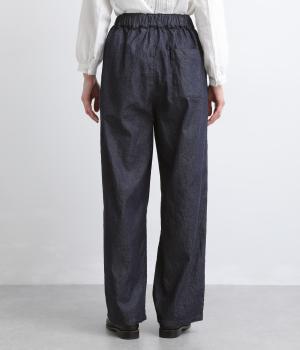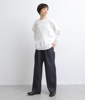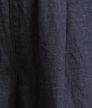 やや薄手で軽やかなコットンデニム生地で仕立てました。ほどよいハリを持ちながらもしなやかさがあり、動きにやさしくなじむのが魅力です。さらりとした肌ざわりと洗いざらしのような自然なシワが、こなれた表情を引き立てます。