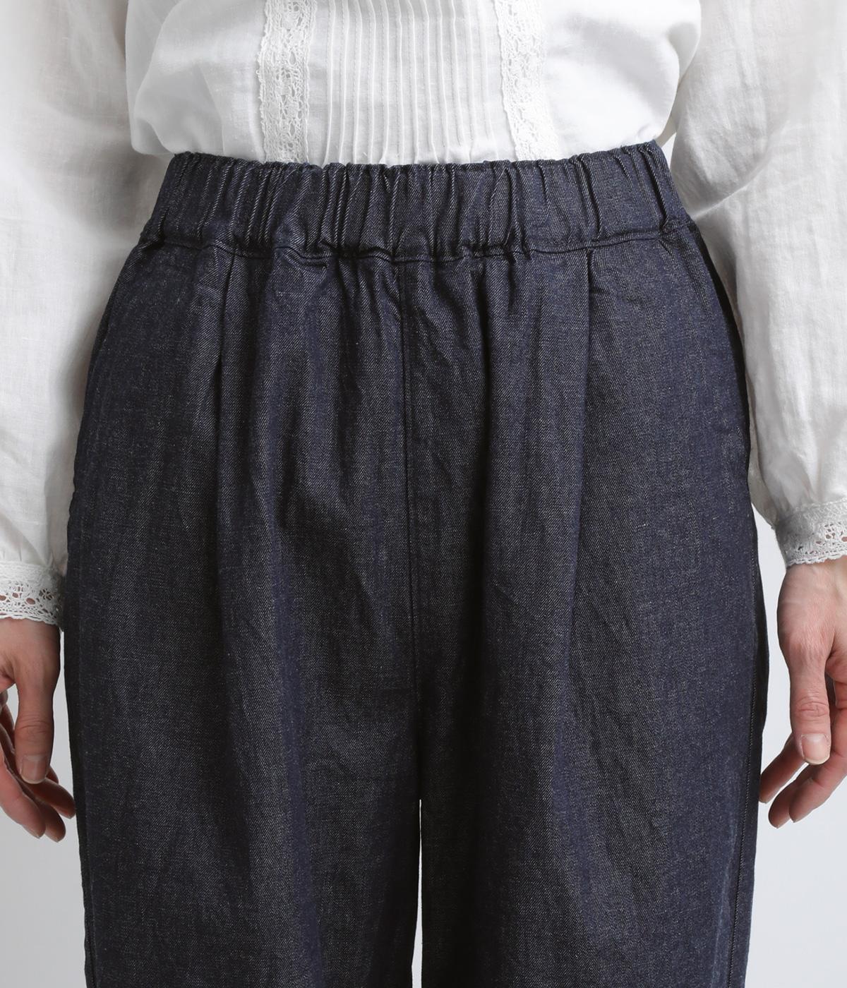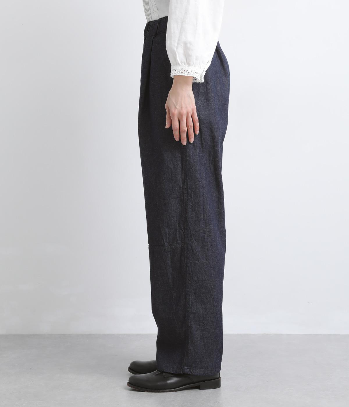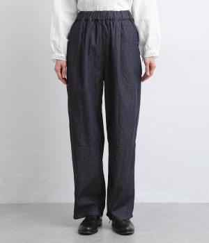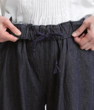 リラックス感のあるルーズシルエットに、落ち感のきれいなストレートラインを組み合わせました。ひざの切り替えがひかえめなアクセントとなり、装いにさりげない表情を添えます。総ゴム仕様のウエストは内紐つきなので、調整のしやすさも◎