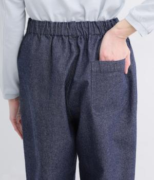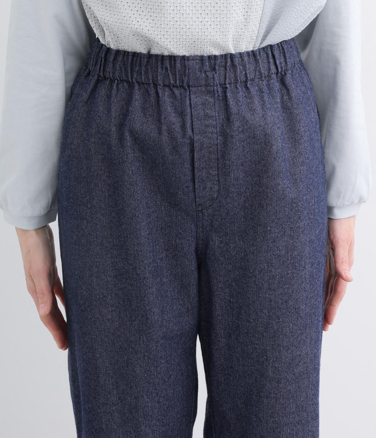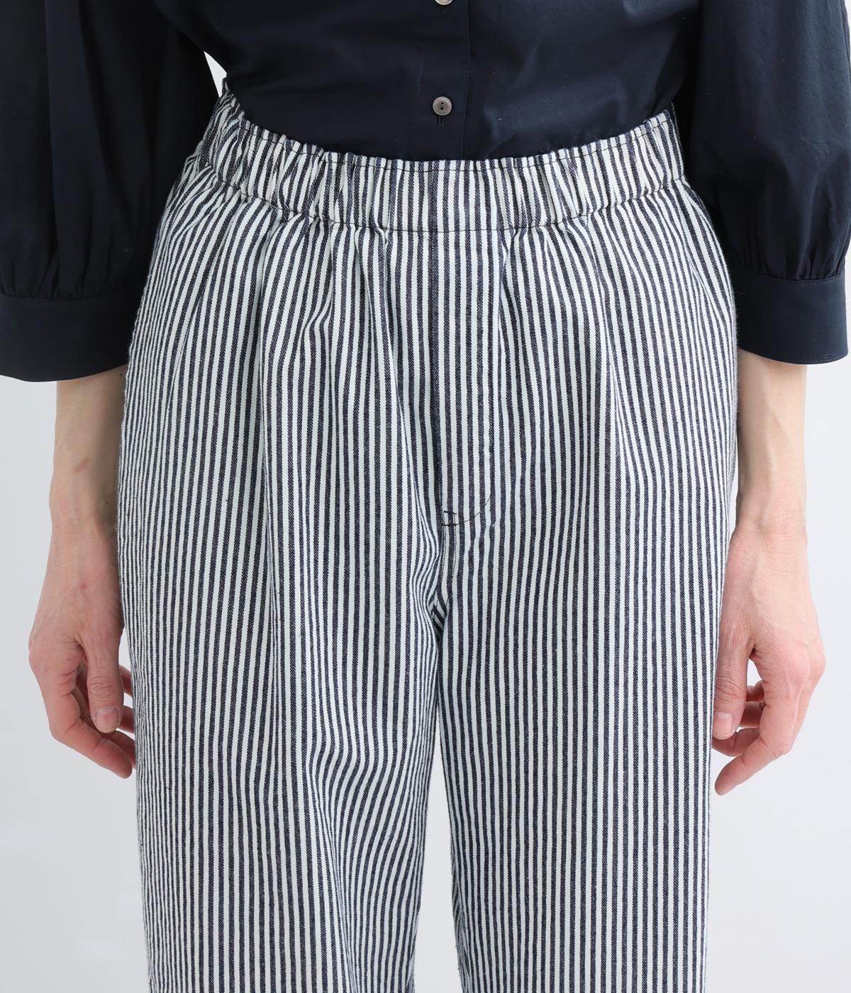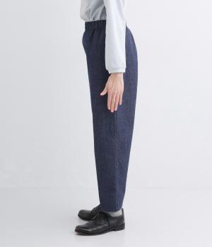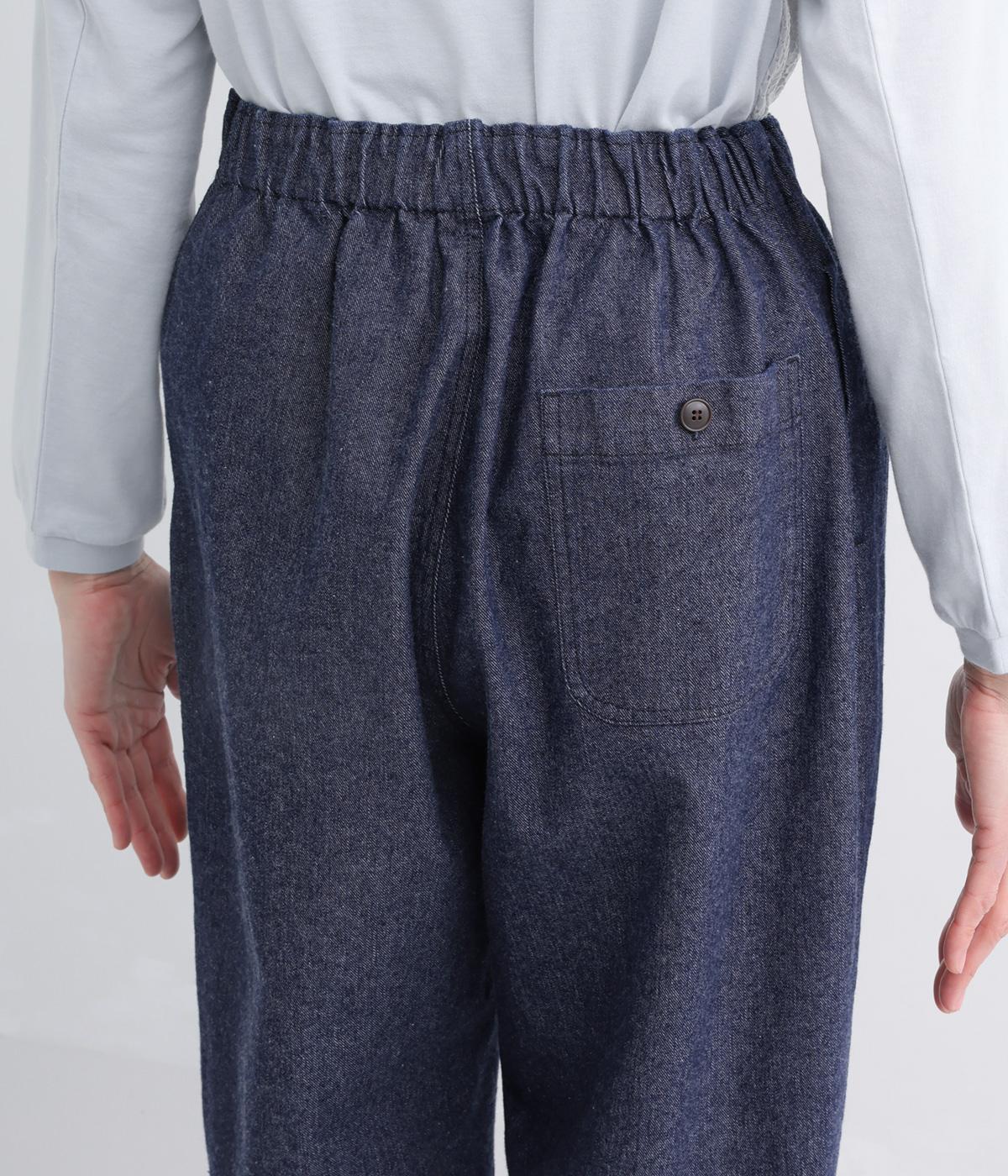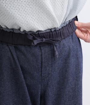 ゆるやかなテーパードシルエットで脚のラインを拾いにくく、たっぷりとほどこしたタックが腰まわりをカバーします。ウエストは総ゴムでリラックス感のある穿き心地。内紐でサイズ調節も可能です。
