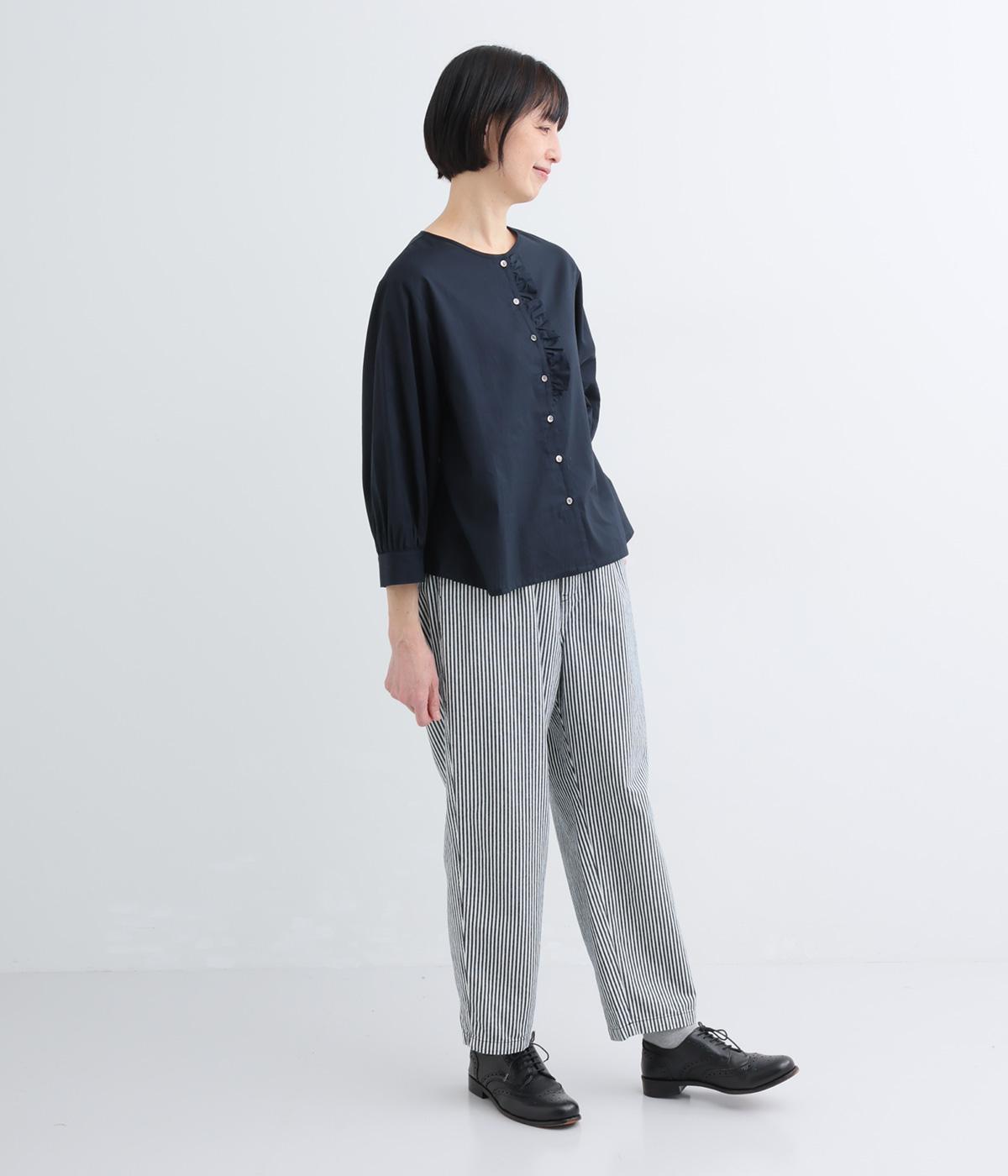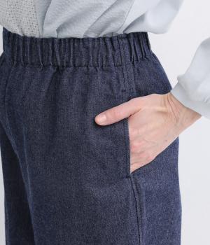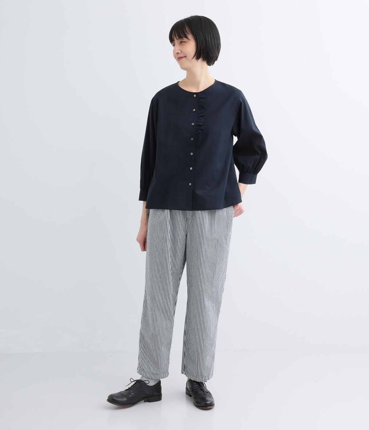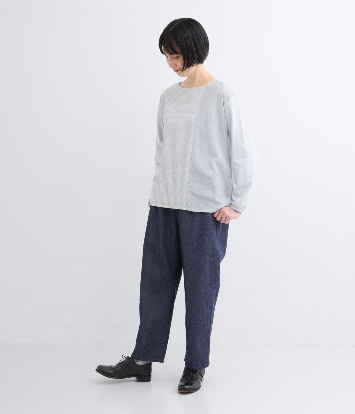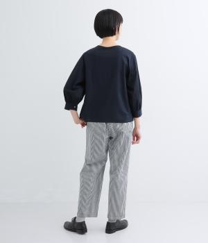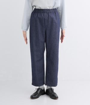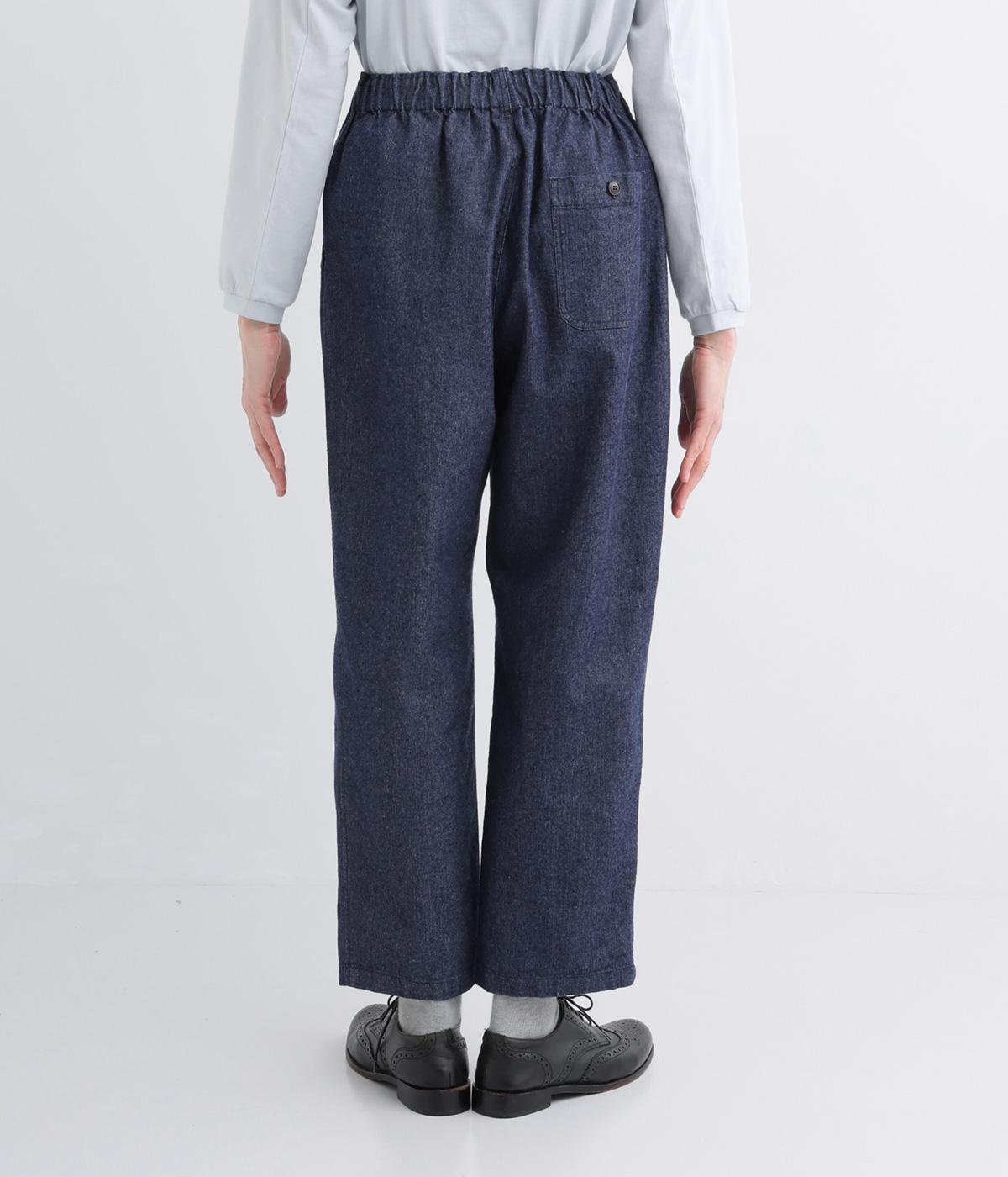 ゆるやかなテーパードシルエットで脚のラインを拾いにくく、たっぷりとほどこしたタックが腰まわりをカバーします。ウエストは総ゴムでリラックス感のある穿き心地。内紐でサイズ調節も可能です。