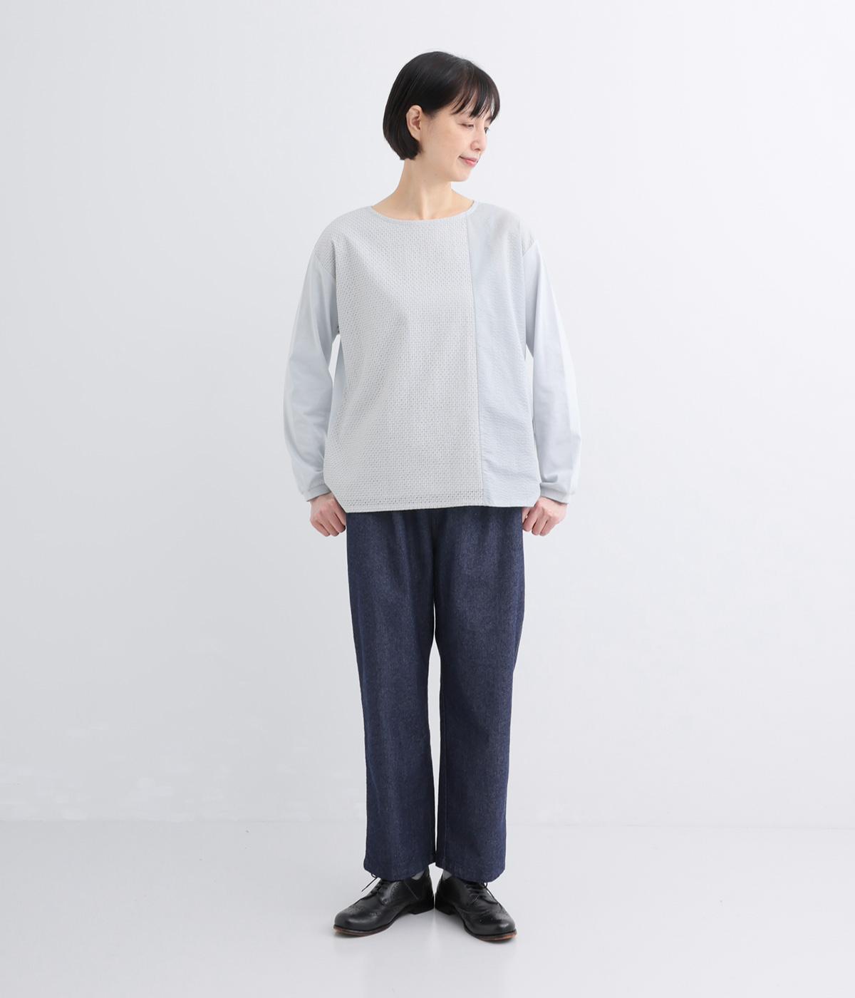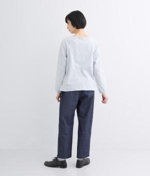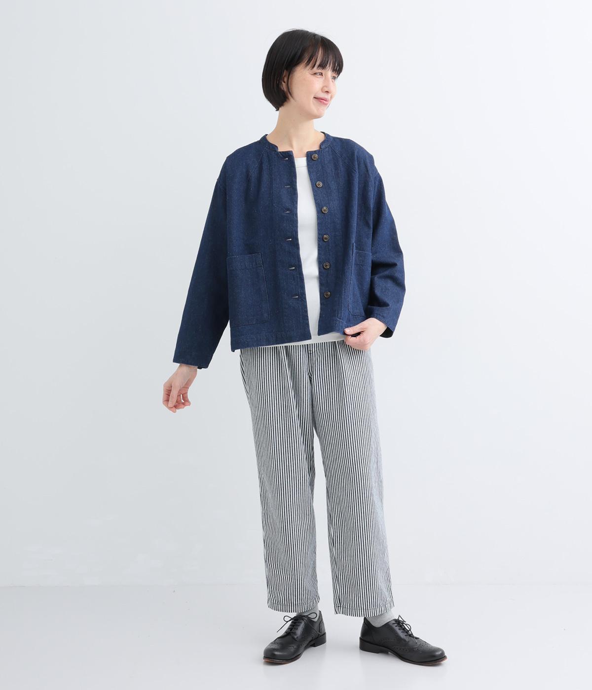 ほどよい厚さでかたさの少ないコットンデニムです。洗いざらしのようなナチュラルな風合いがこなれた雰囲気を醸します。やわらかなハリでやさしい肌ざわりの素材感です。