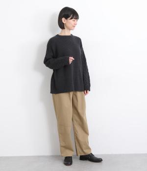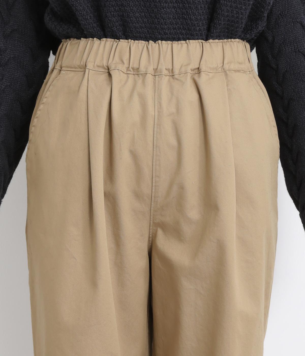 着こなしにこなれ感を与える、全体にゆとりを持たせたタックパンツ。フロントのひざ位置に入れた切り替えがアクセントになっています。両サイドのほか、右ヒップにポケットを配してカジュアルさをアップ。ウエストは総ゴム仕様で、フィット感を調整できる内紐つきです。