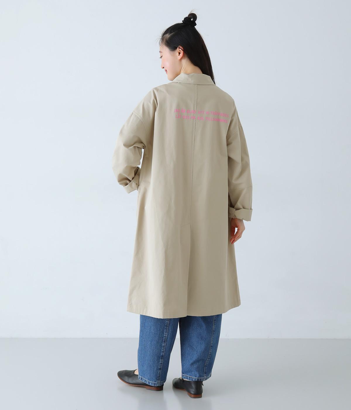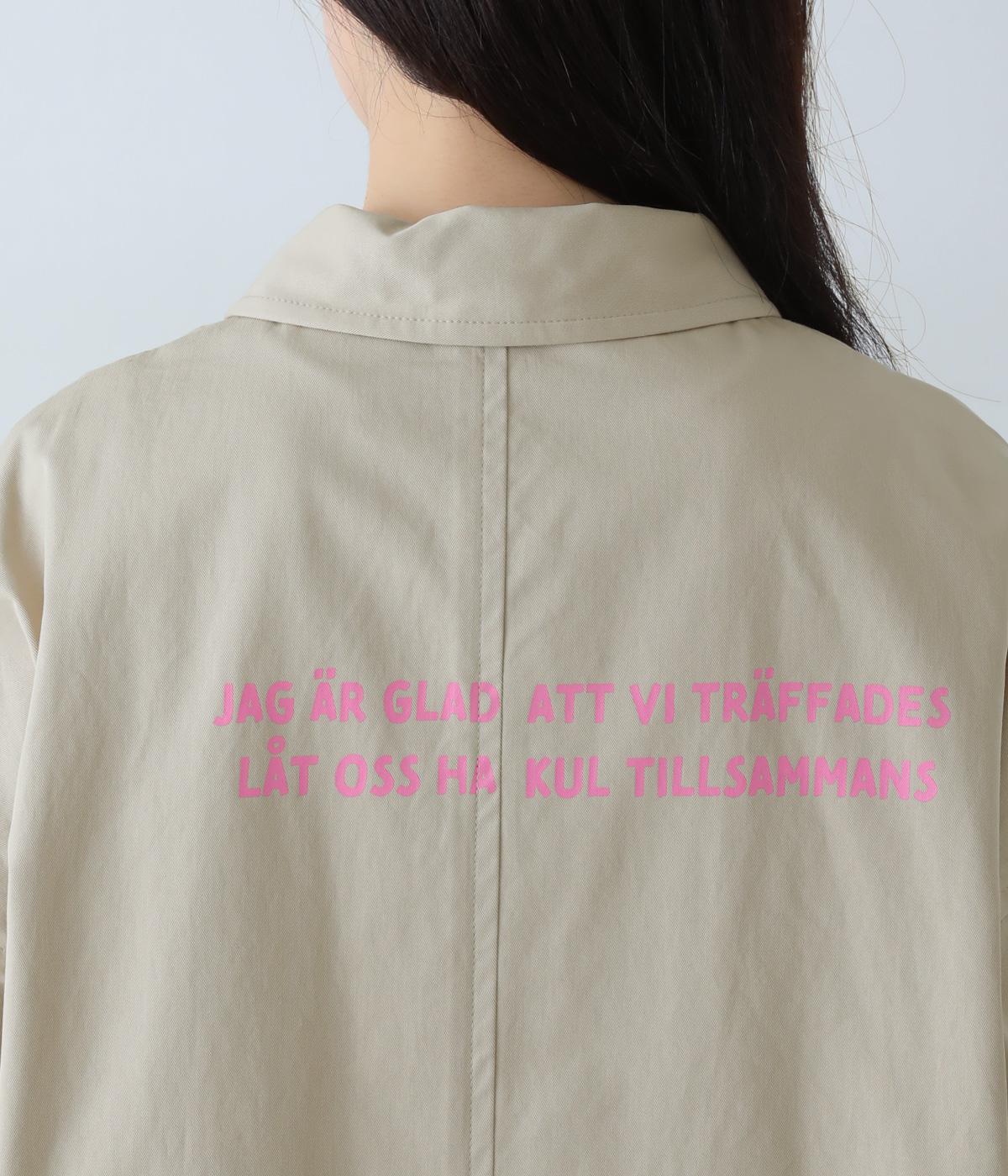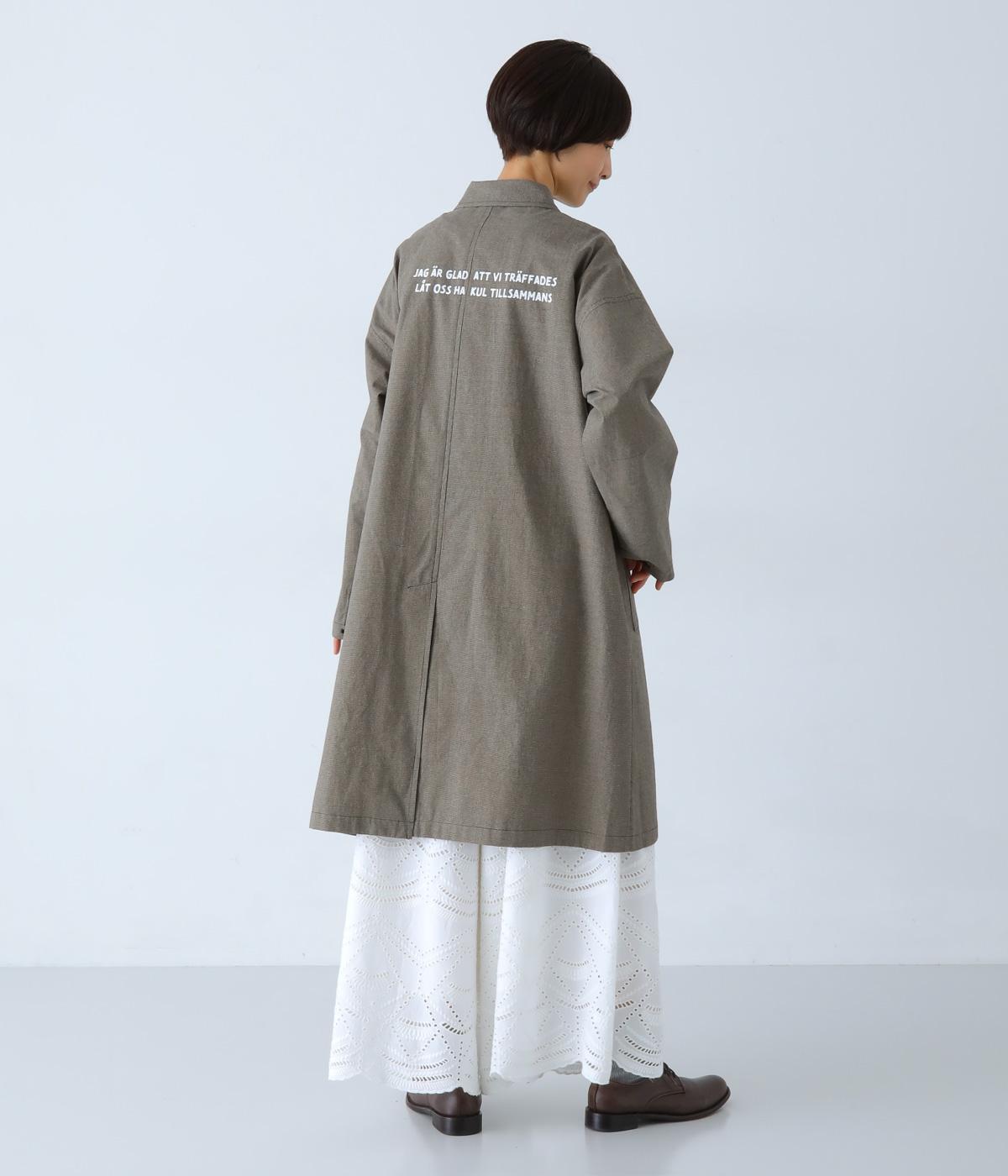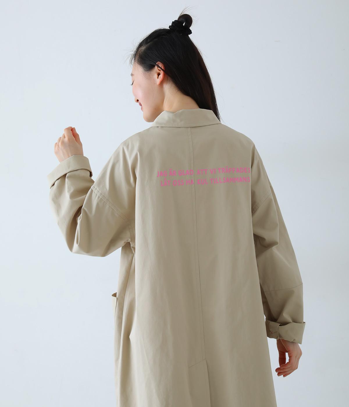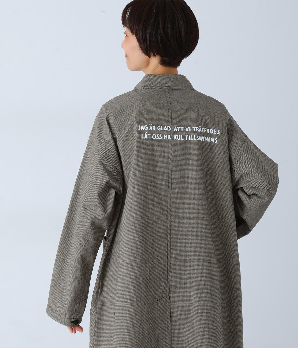バックのロゴプリントが印象的なラボコートです。軽やかに羽織れるワークテイストのデザインで、デイリー使いにもなじみます。前の左ポケットにもプリントを入れ、さりげないアクセントに。長めの袖丈がラフな雰囲気をつくり、内ポケットつきで実用性も◎です。