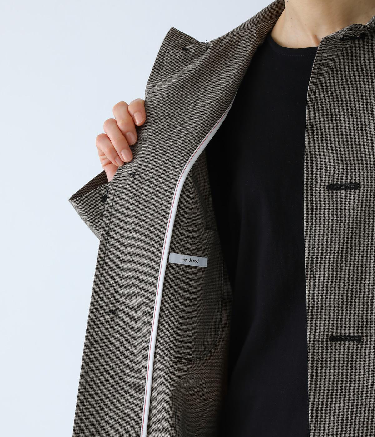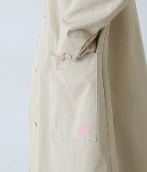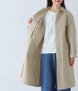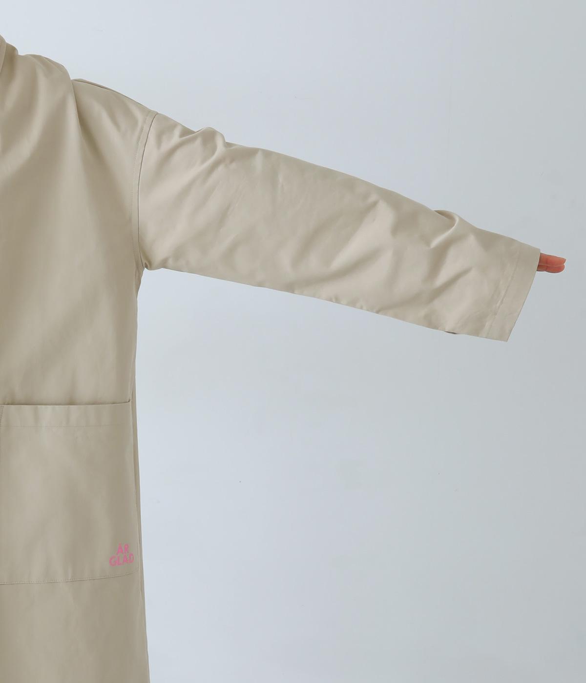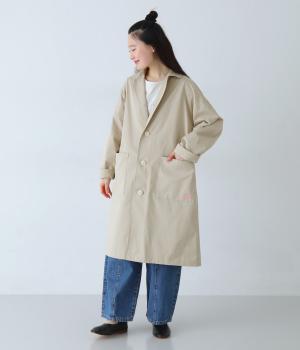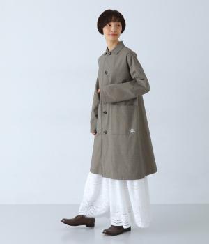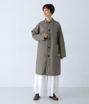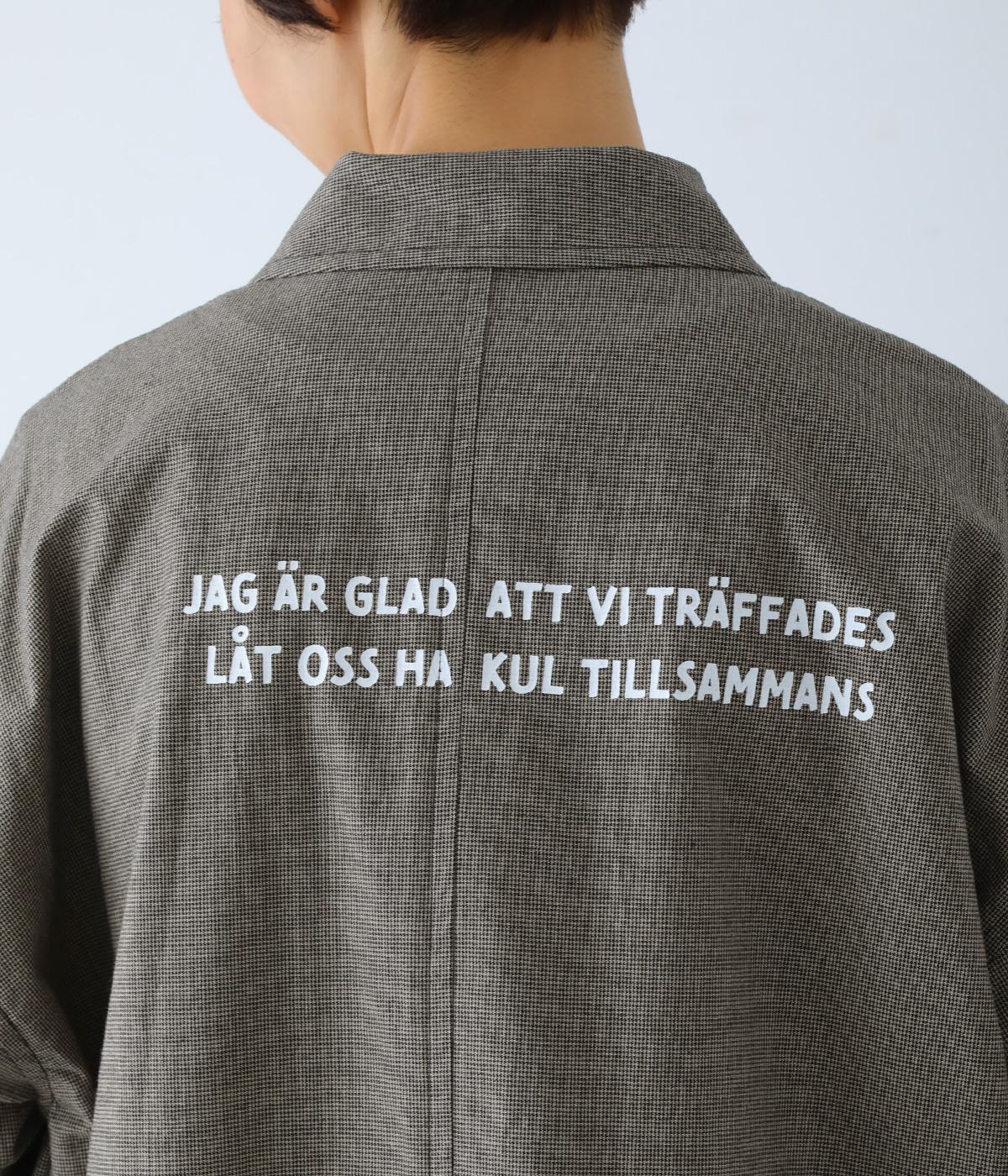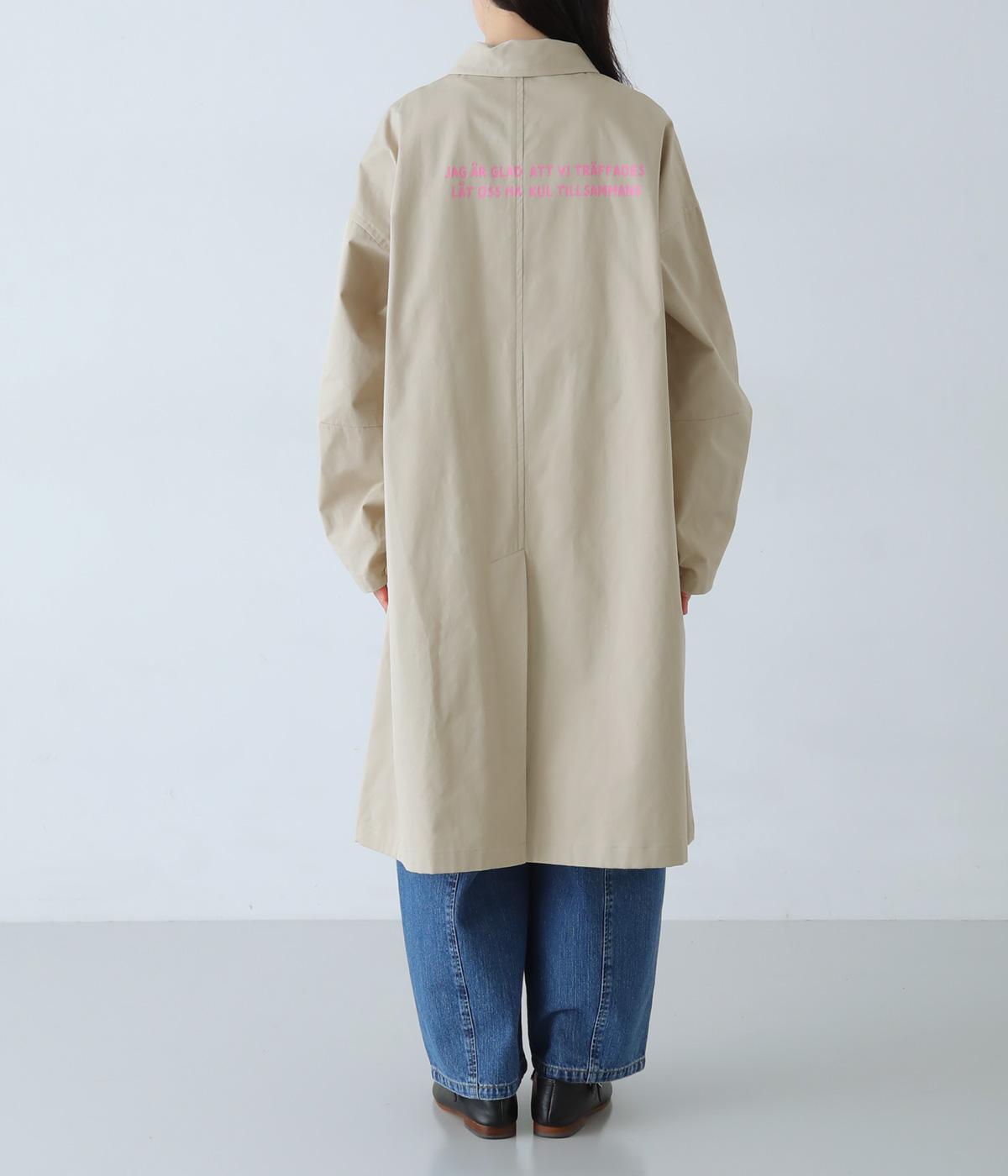 バックのロゴプリントが印象的なラボコートです。軽やかに羽織れるワークテイストのデザインで、デイリー使いにもなじみます。前の左ポケットにもプリントを入れ、さりげないアクセントに。長めの袖丈がラフな雰囲気をつくり、内ポケットつきで実用性も◎です。