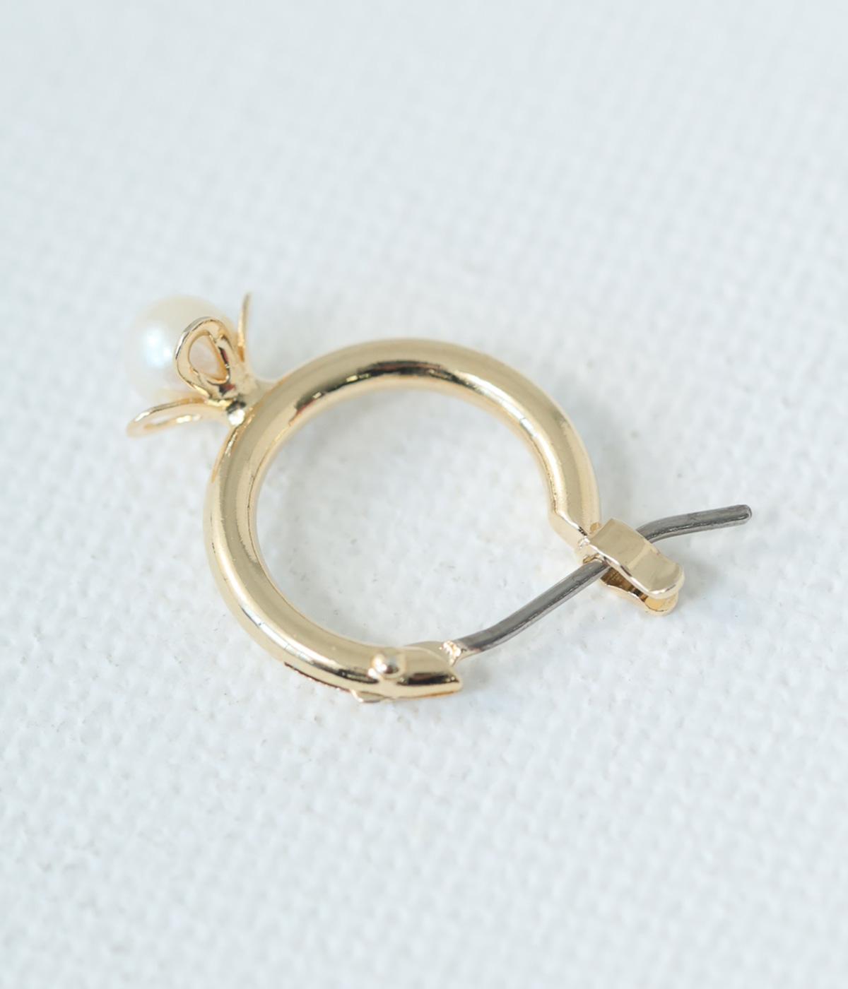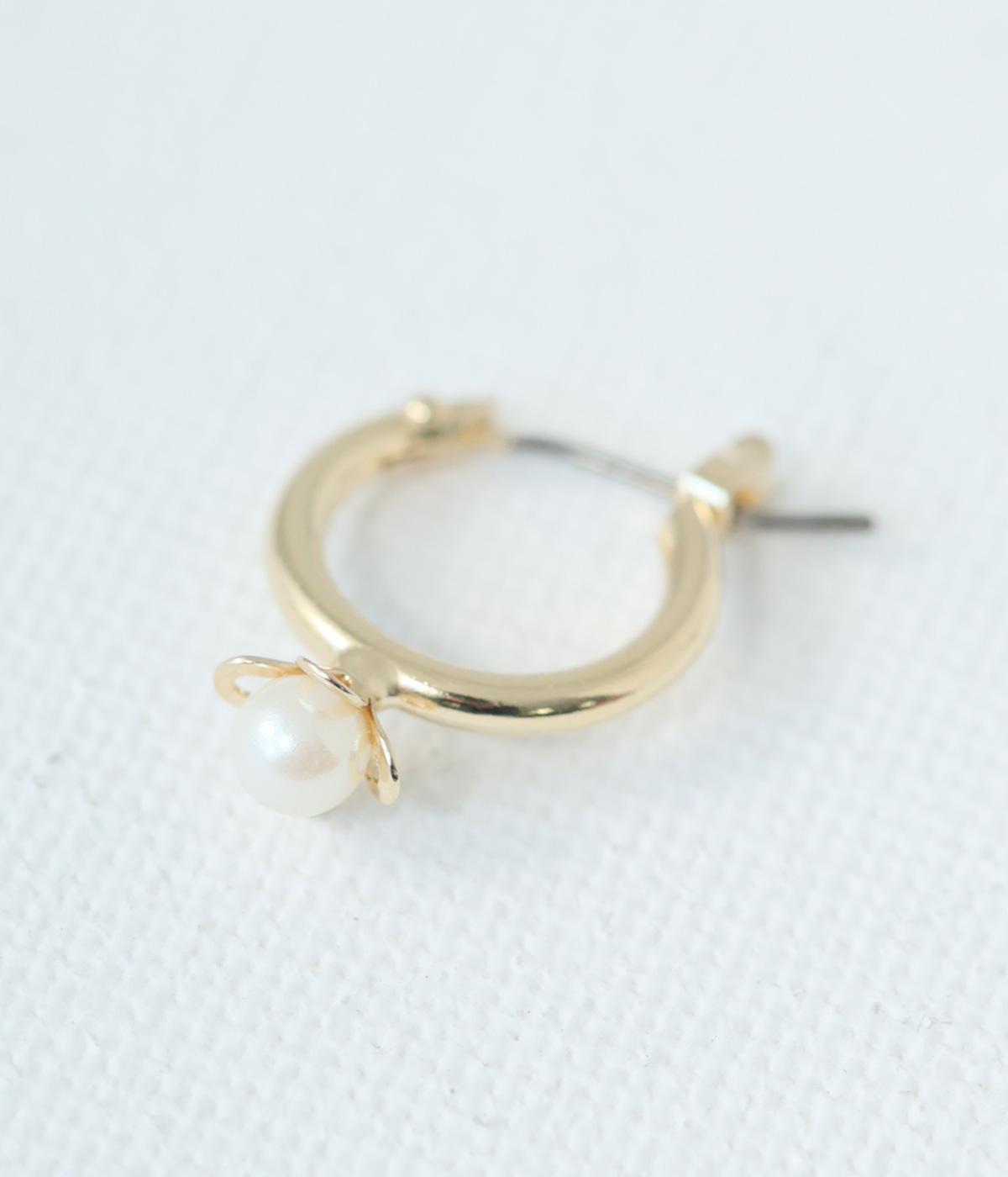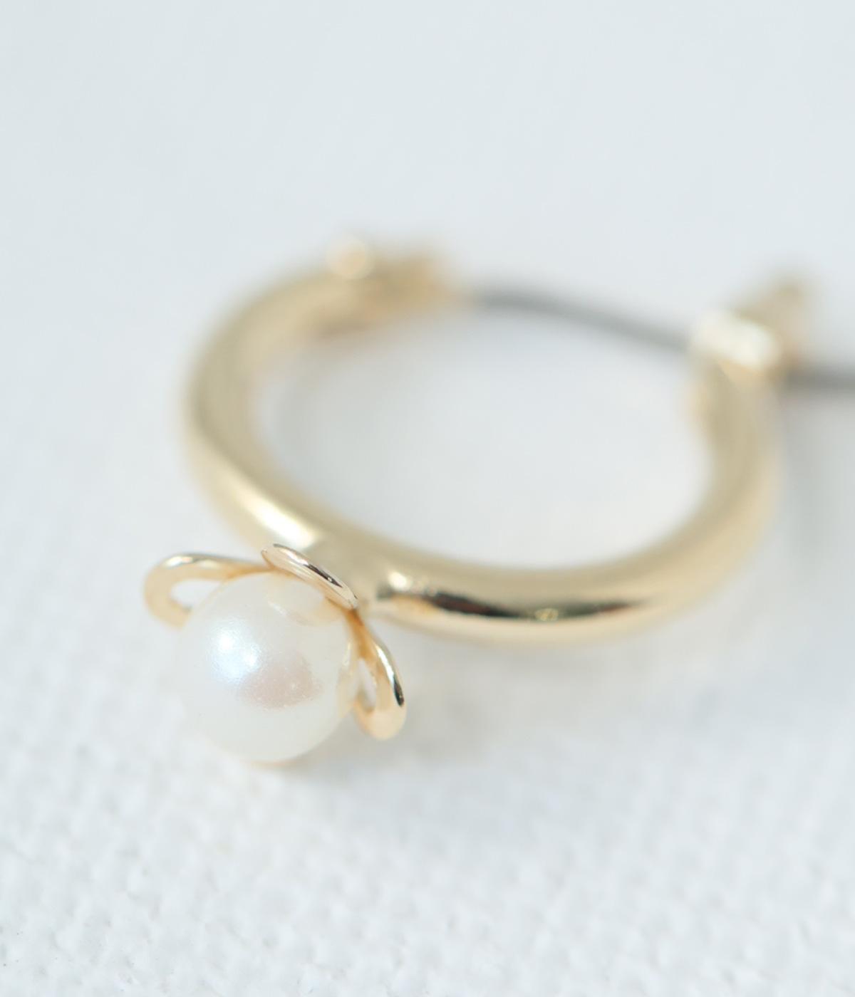 小粒のパールをあしらった、可憐な印象のリングピアス。控えめなサイズ感が耳もとにさりげない華やぎを添えます。やわらかな光沢が上品な雰囲気をつくり、日常の装いにはもちろん、オケージョンにもなじむデザインです。