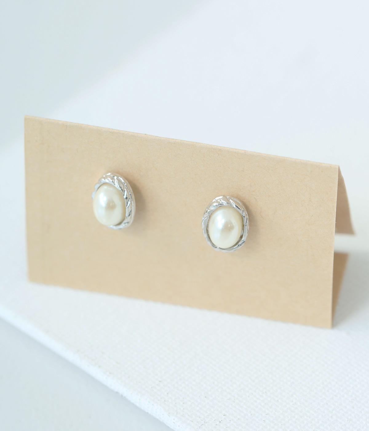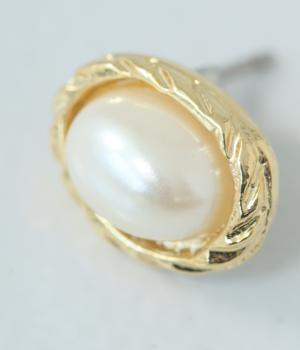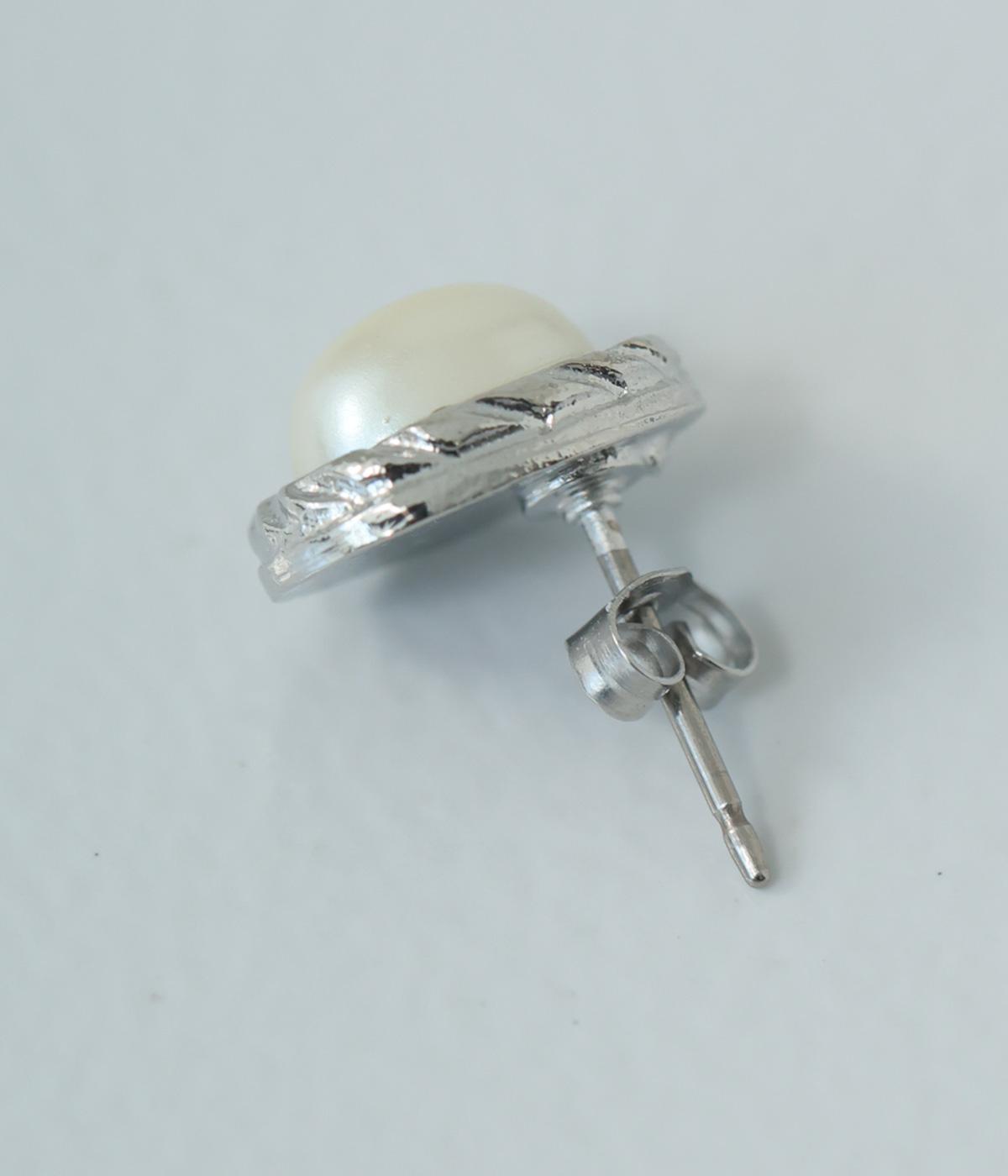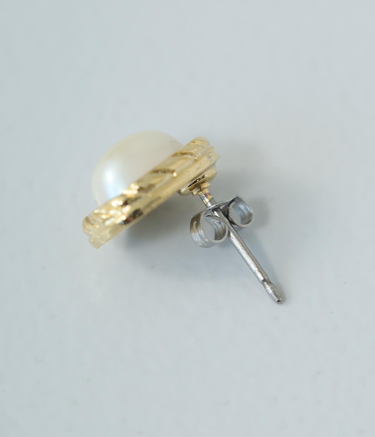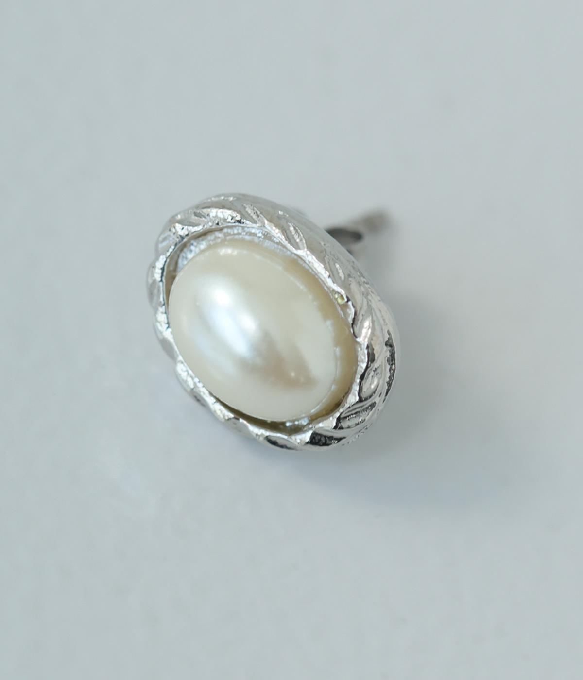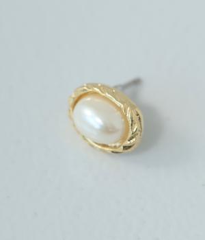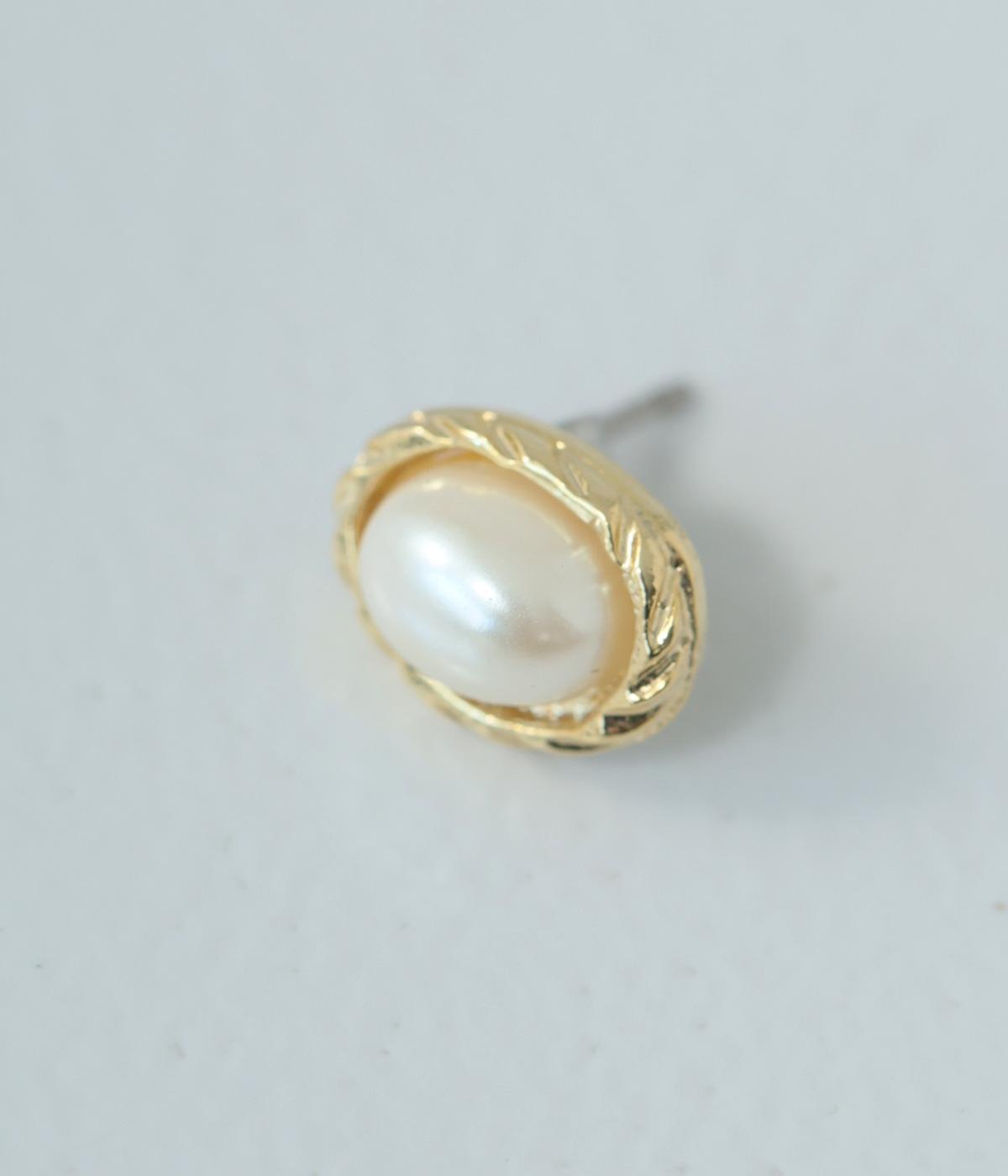 ラウンド型のメタルフレームにパールモチーフを埋め込んだデザイン。やわらかな光沢とすっきりとしたフォルムが、耳もとに上品なニュアンスを添えます。ほどよい存在感で、日常の装いからきれいめなスタイルまで幅広くなじむピアスです。