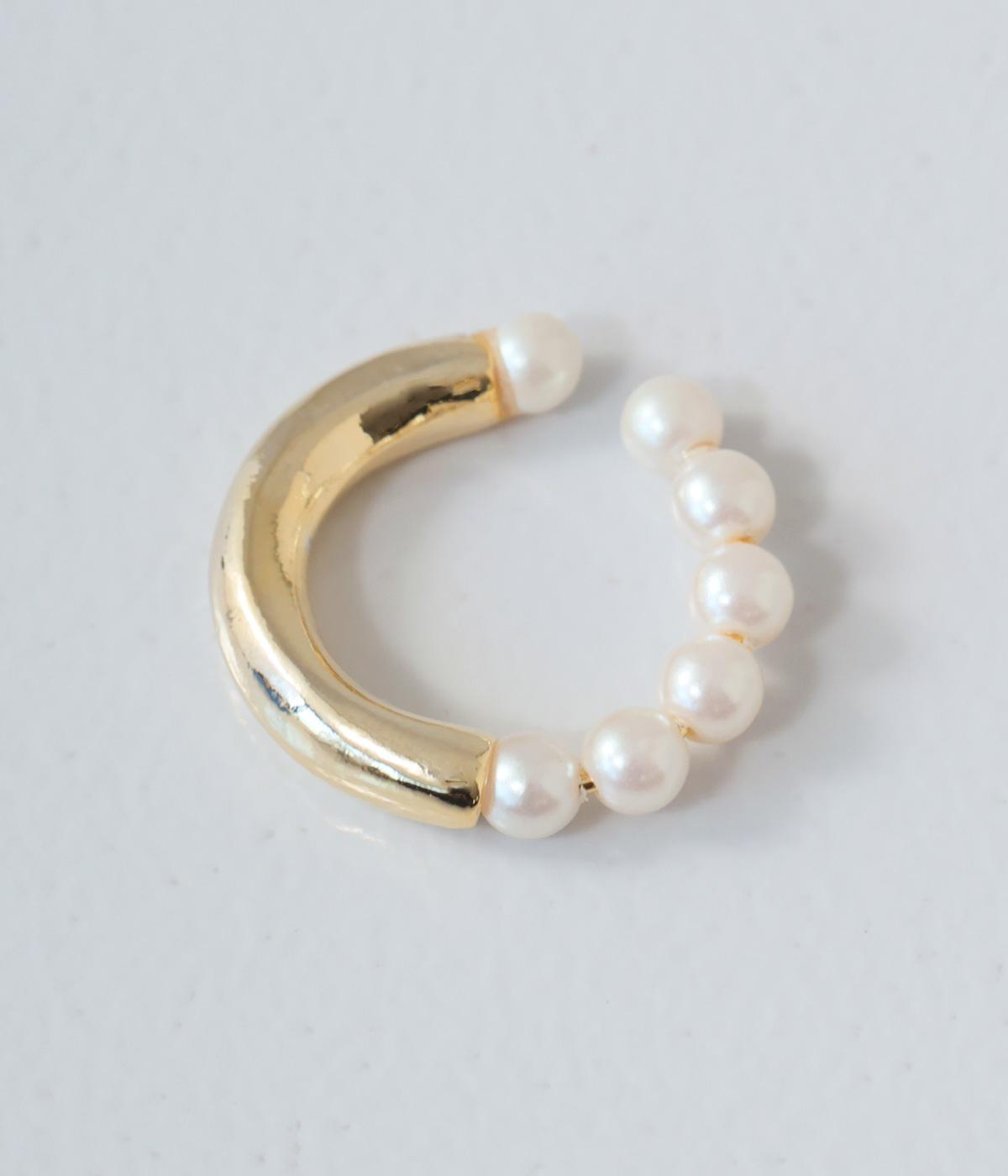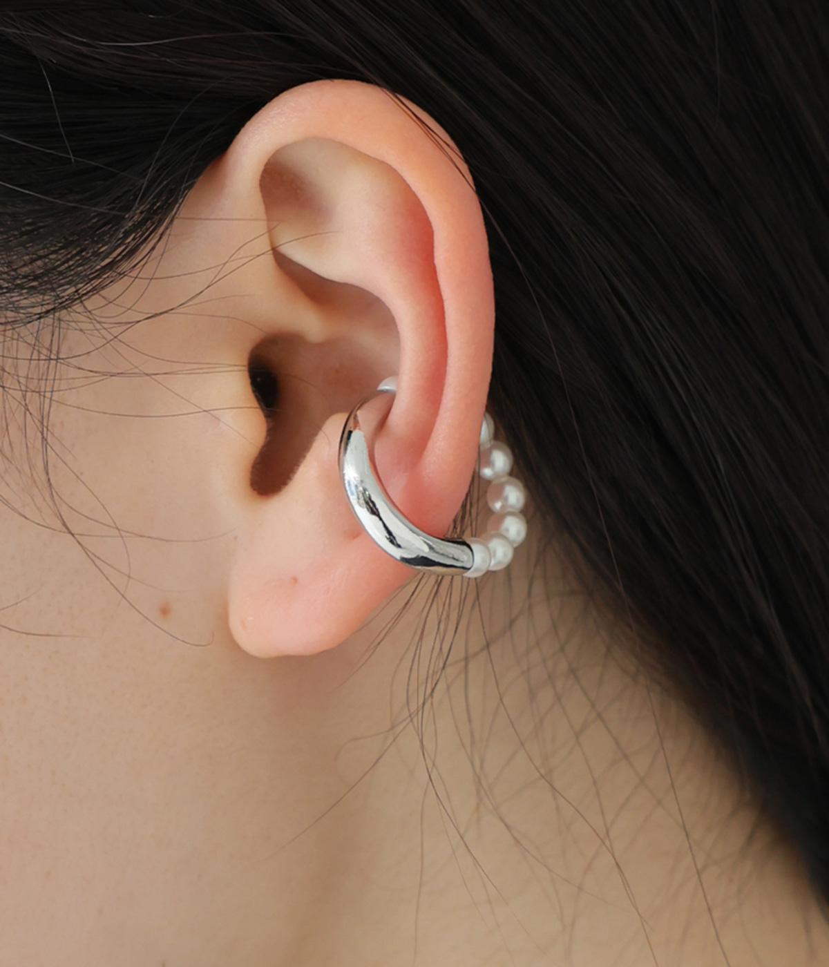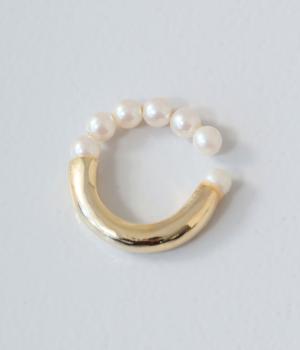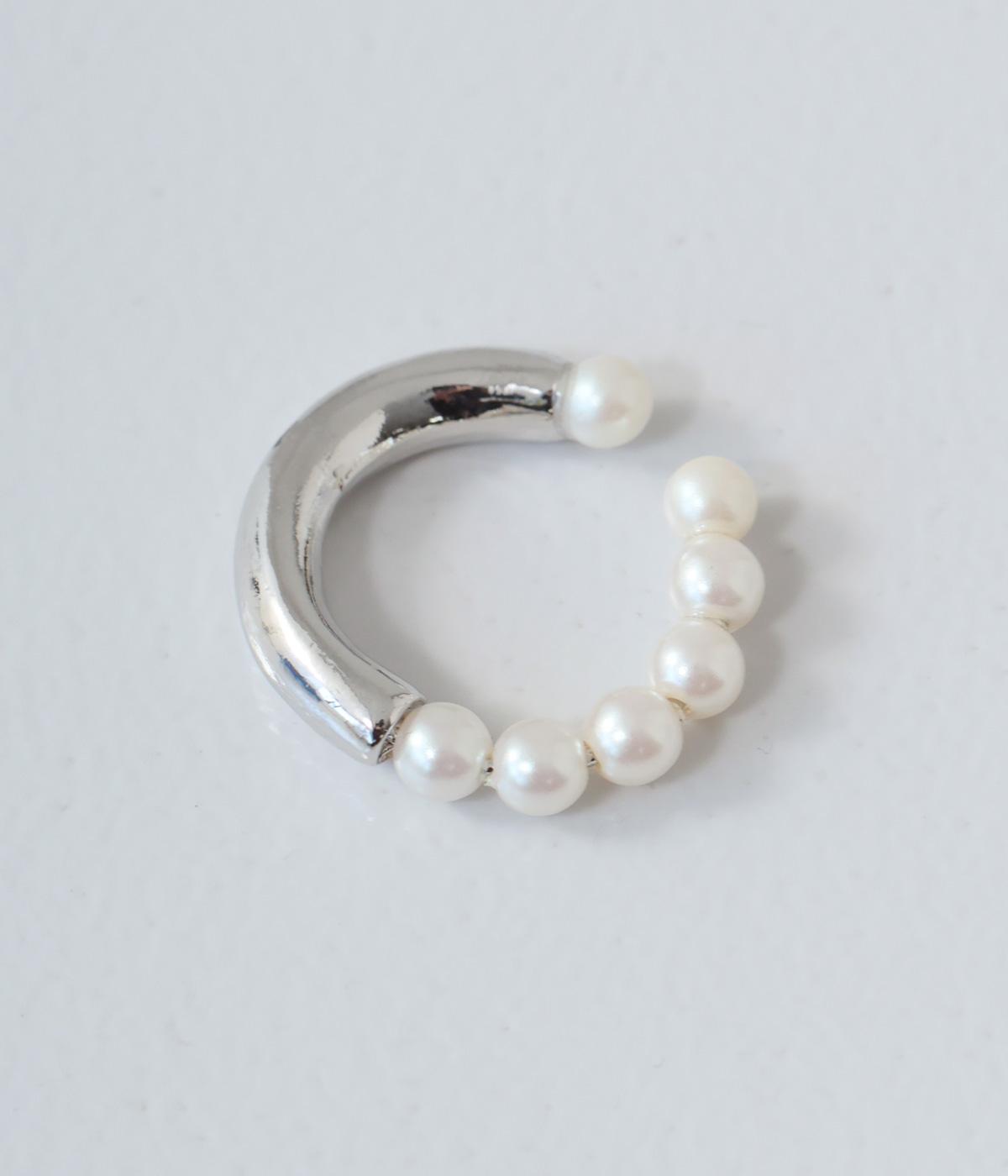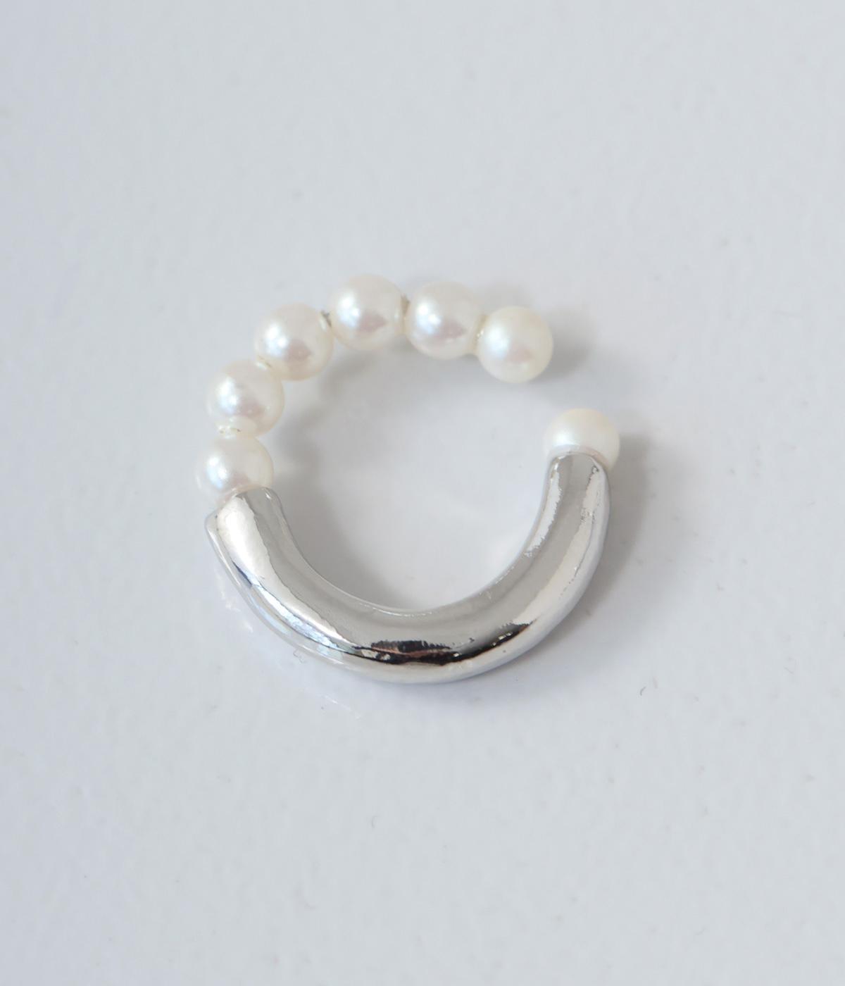 メタルの曲線にパールモチーフを半分配したイヤーカフ。異なる質感のコントラストが、耳もとにさりげない華やぎを添えます。小ぶりながらもほどよい存在感があり、シンプルな装いのアクセントとして活躍します。