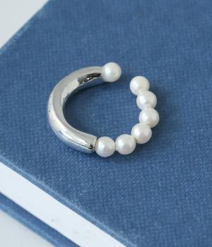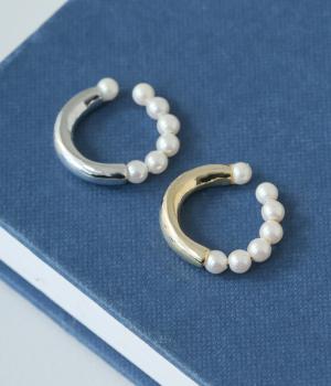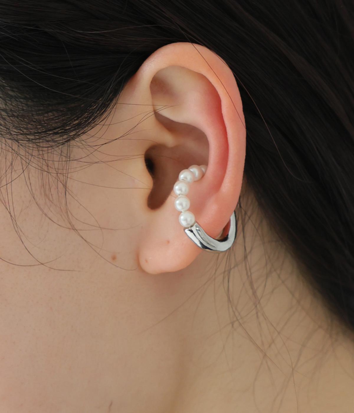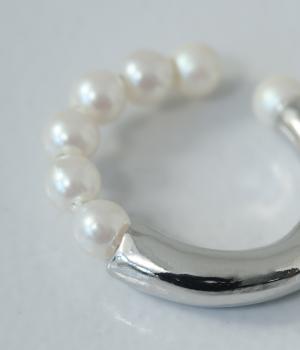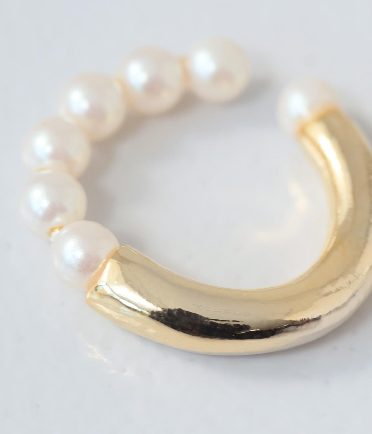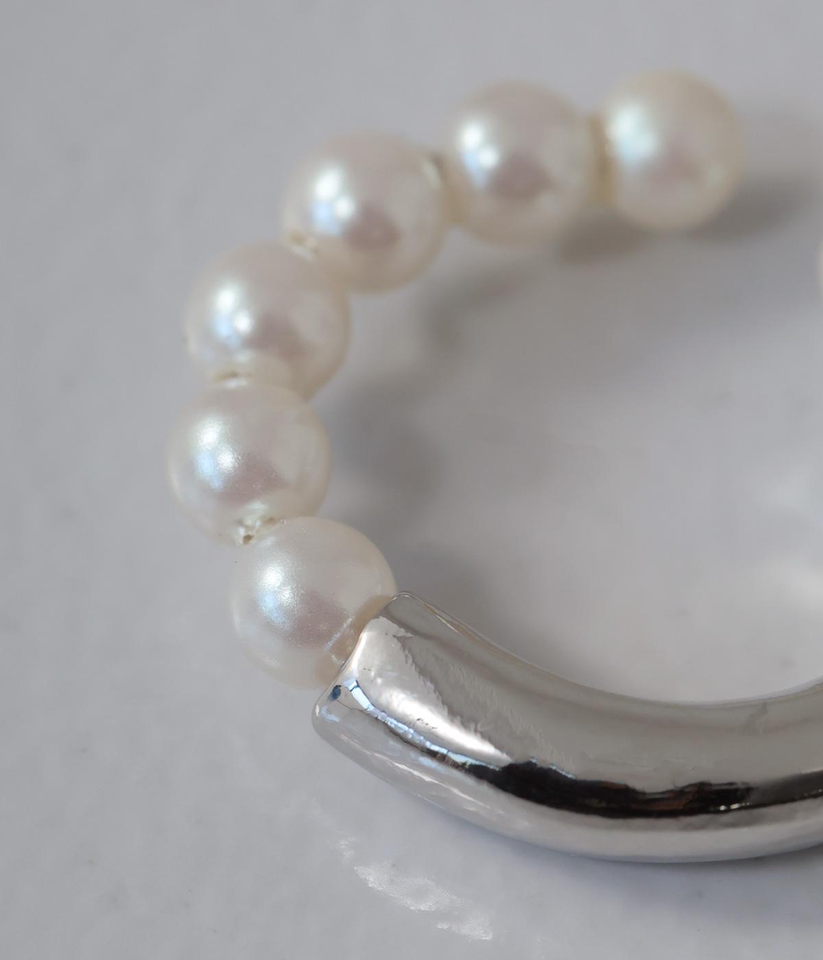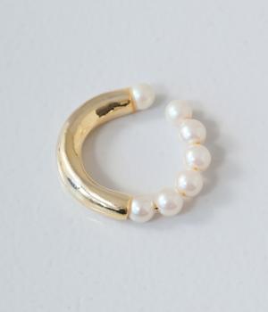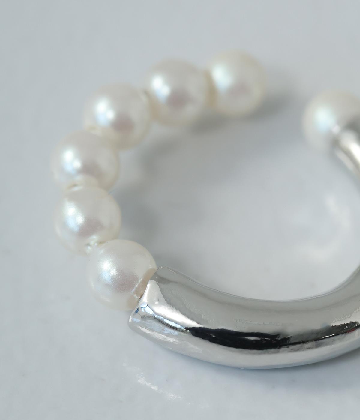 メタルの曲線にパールモチーフを半分配したイヤーカフ。異なる質感のコントラストが、耳もとにさりげない華やぎを添えます。小ぶりながらもほどよい存在感があり、シンプルな装いのアクセントとして活躍します。