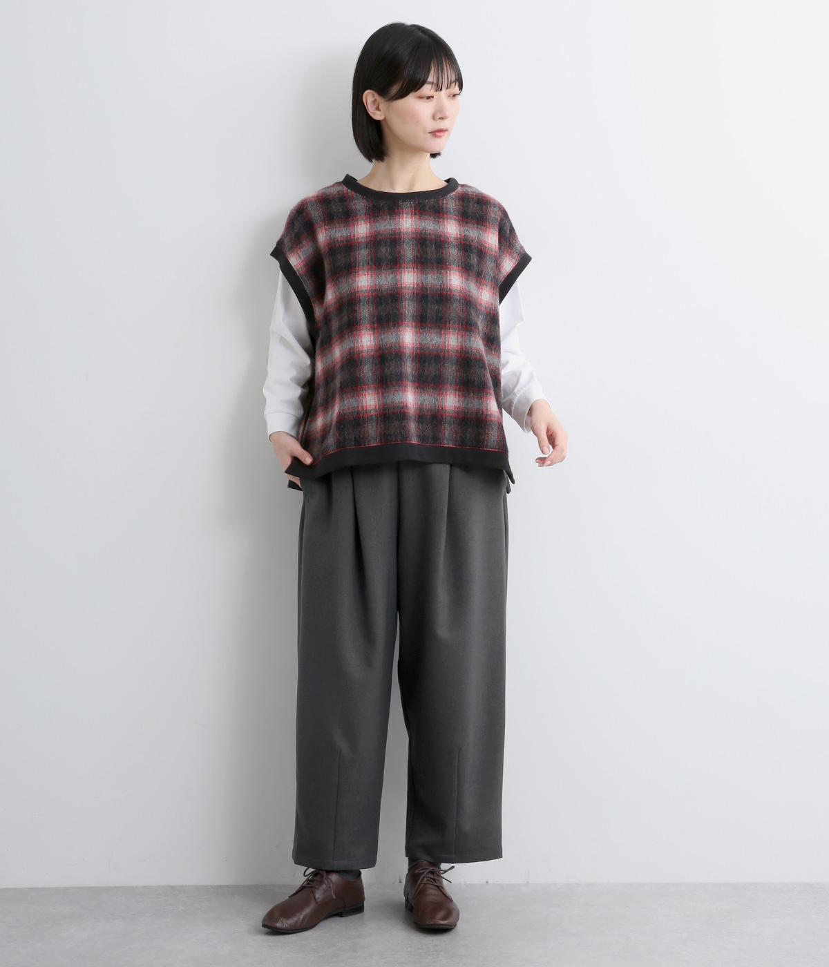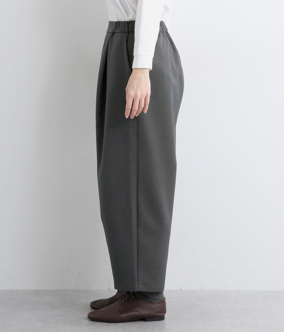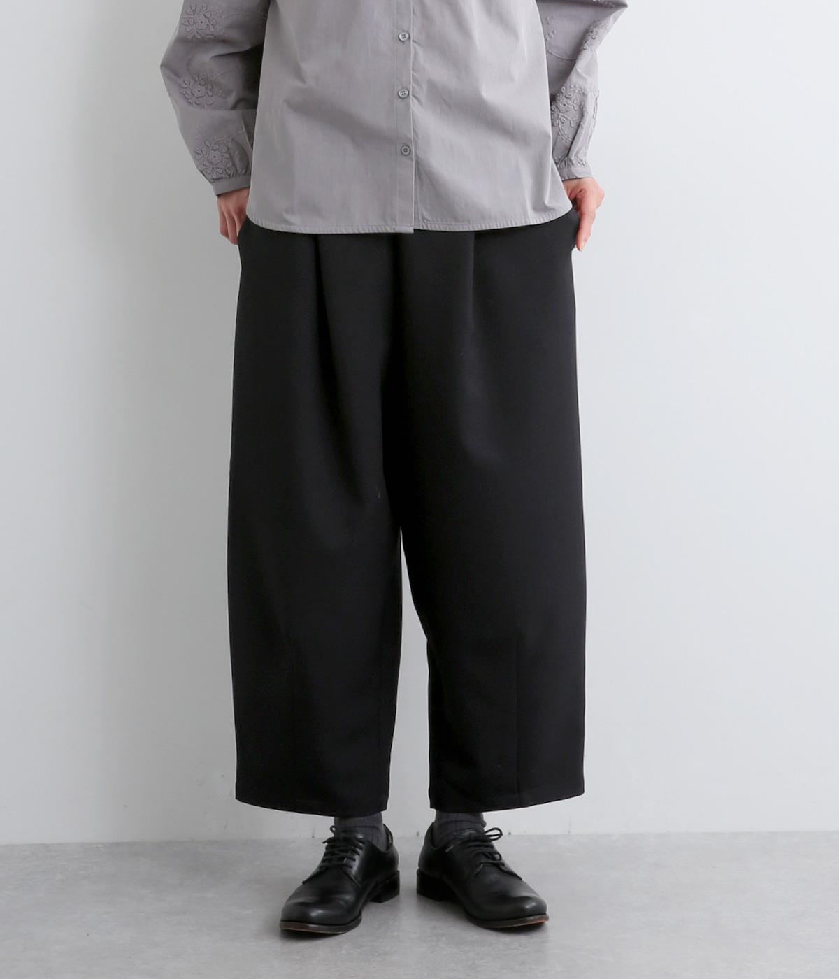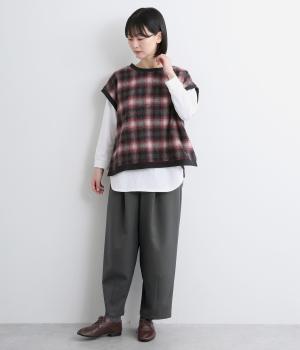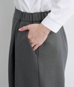 ウエストにタックを入れて自然な立体感をつけ、裾ダーツで全体をすっきりまとめました。トップスインもきまる前ベルト仕様で、サイドから後ろにかけてゴムを入れているのでお腹まわりの窮屈さも軽減。レースアップシューズでクラシカルな装いも◎。
