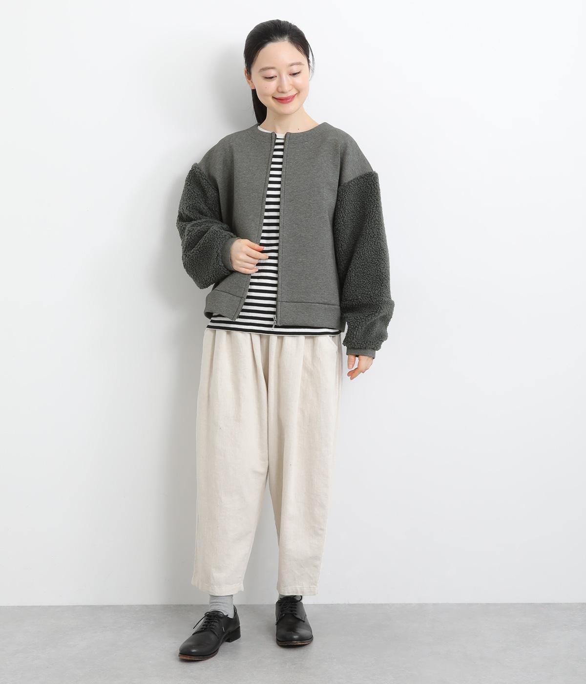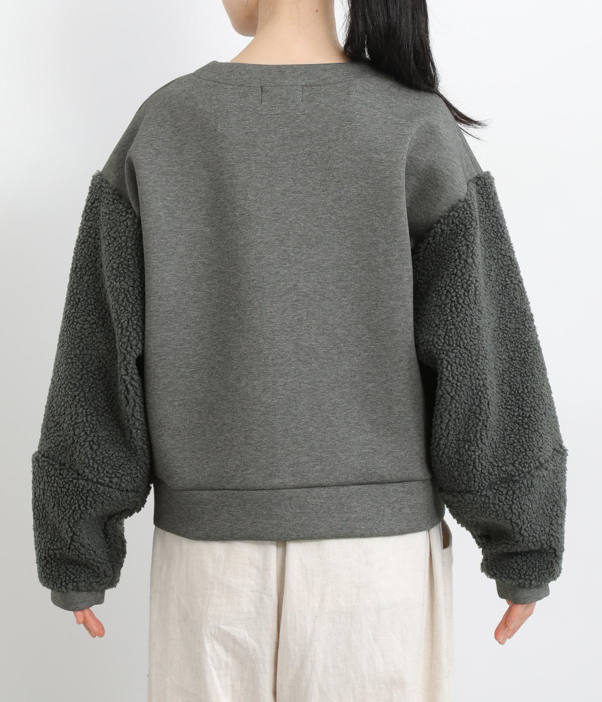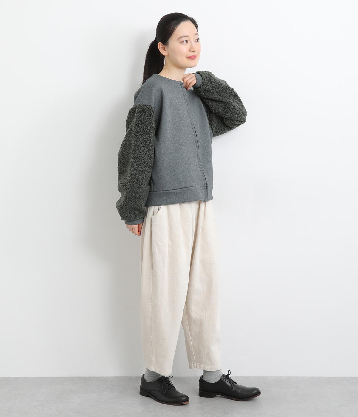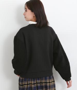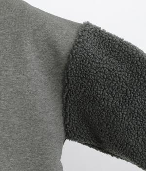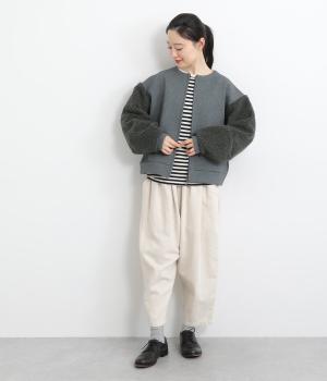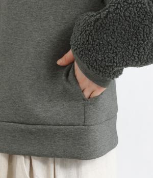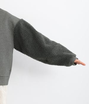 もっちりとしたやわらかな生地をベースに、袖はもこもことした表面感のあるプードルパイルに切り替えた異素材使い。どちらも適度な肉感と伸縮性が着心地のいい生地感です。