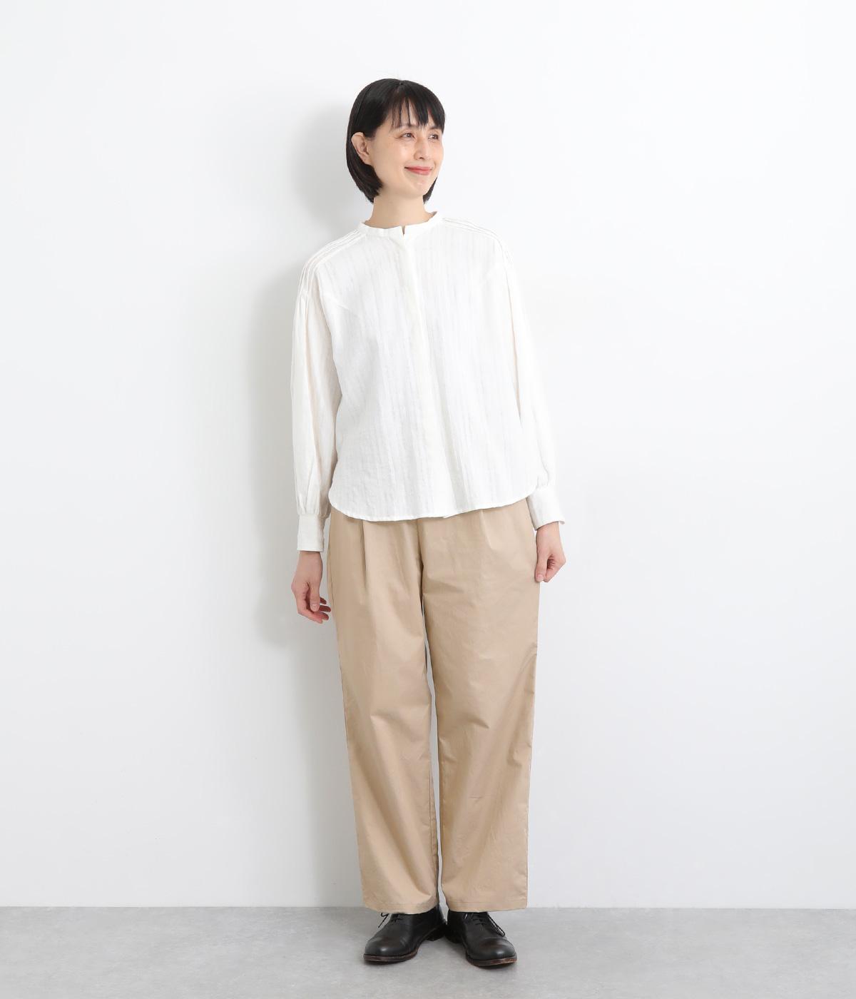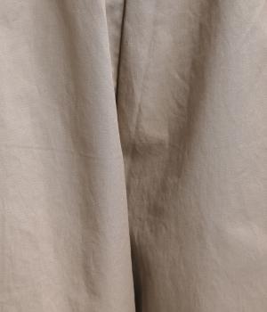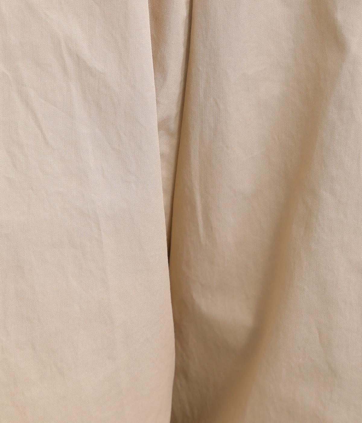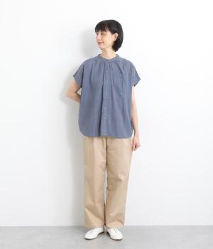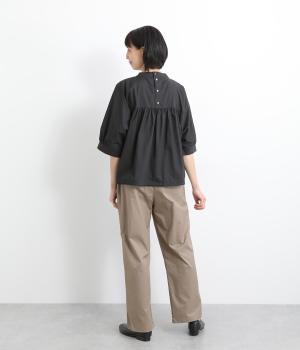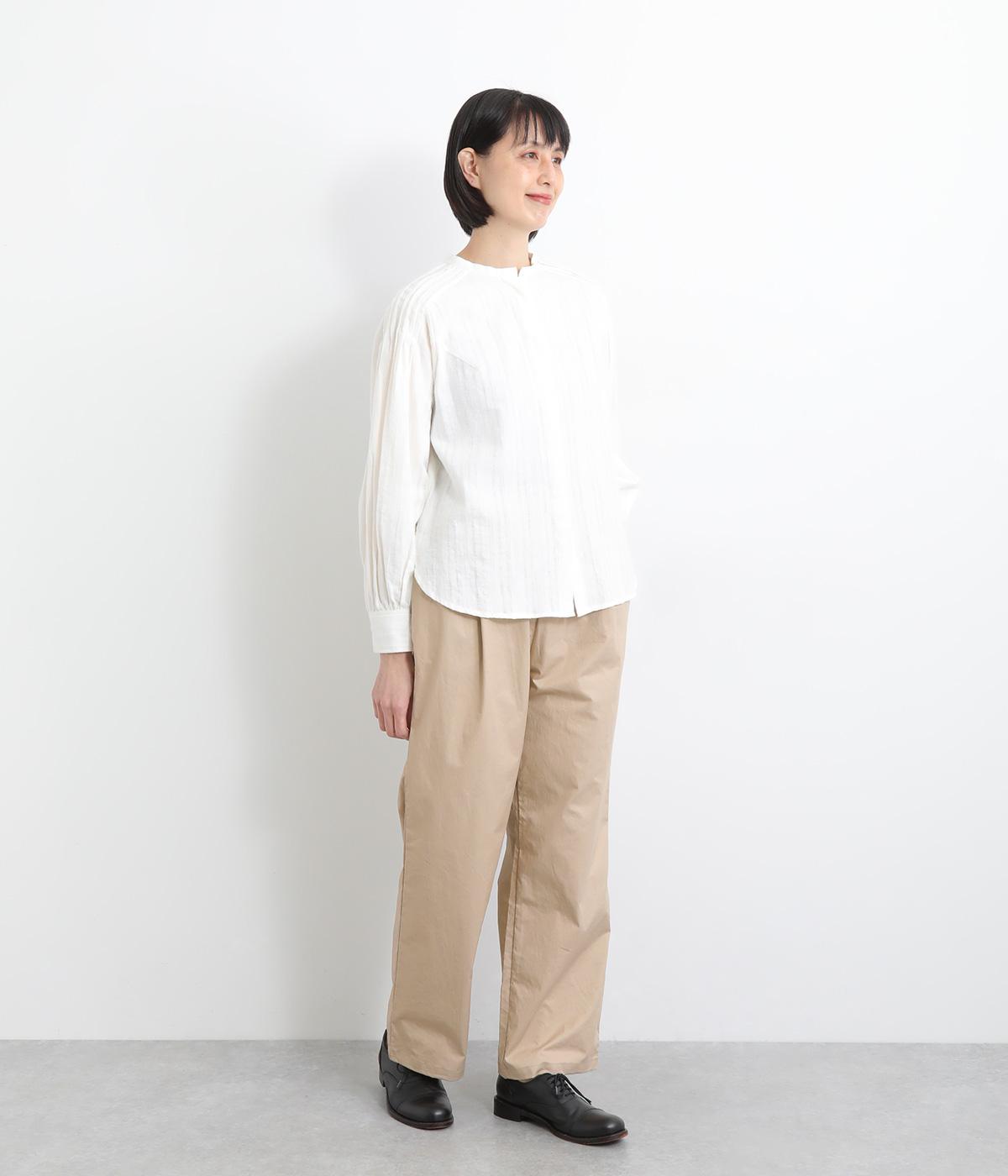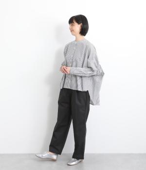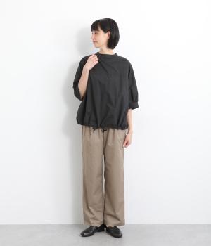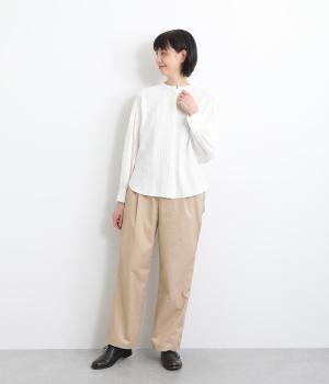 さらりとしたドライタッチのライトなコットン生地で心地よく仕上げました。ほどよいハリとシャリ感がシルエットをきれいに出し、季節問わずはきやすい使い勝手のいい生地感です。