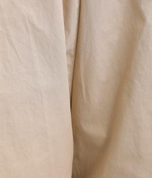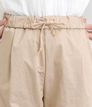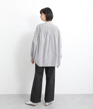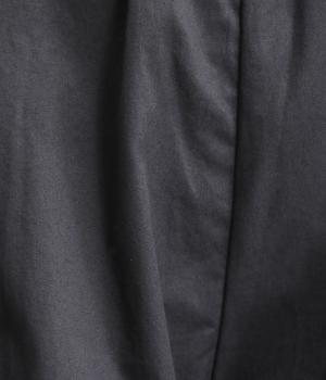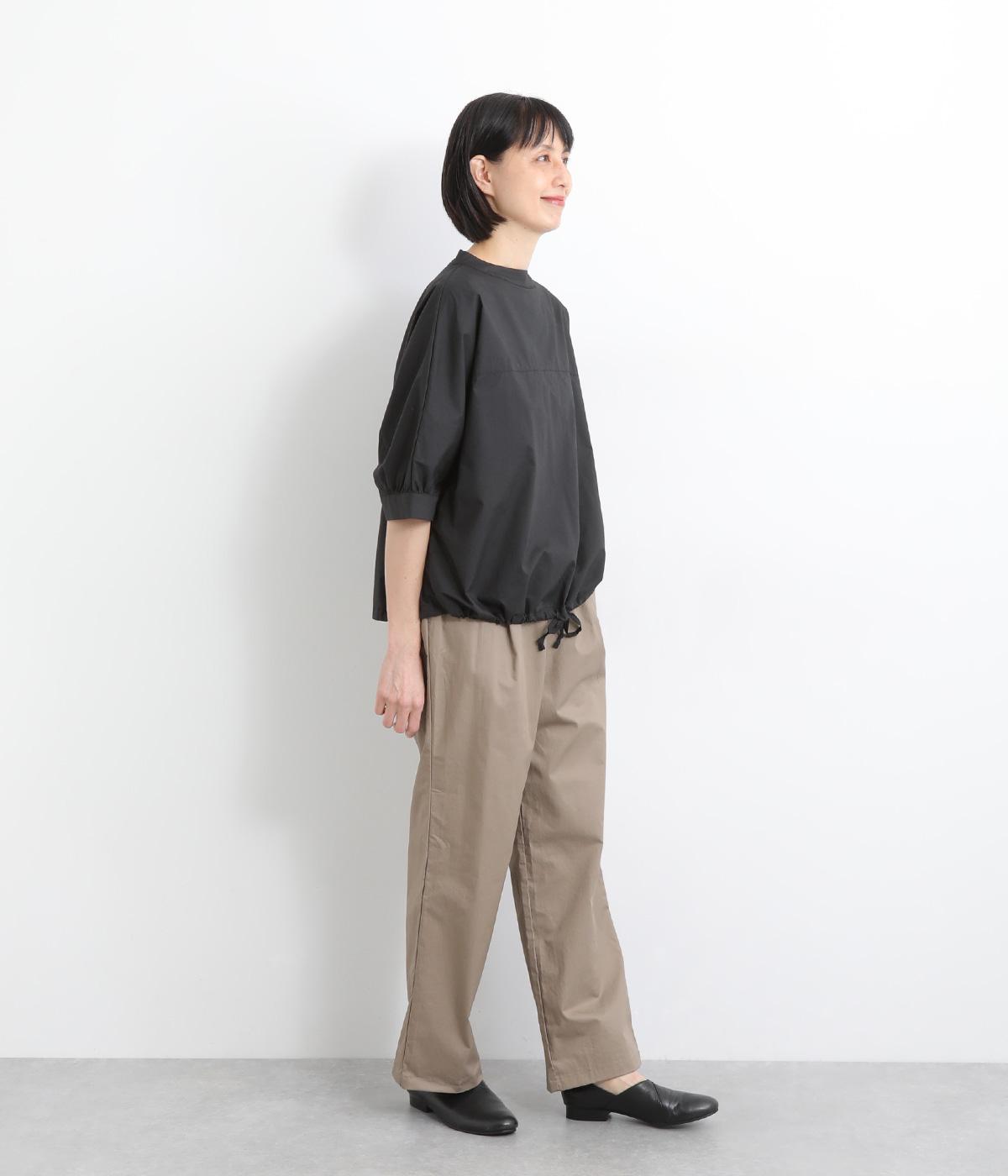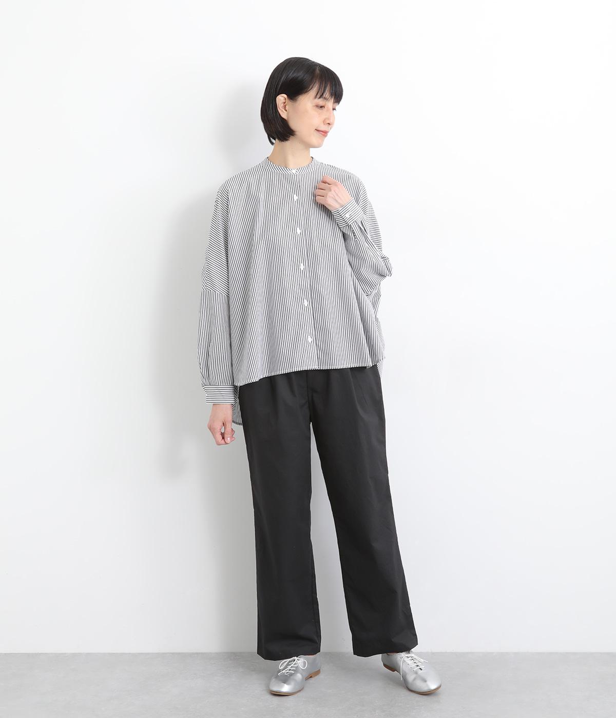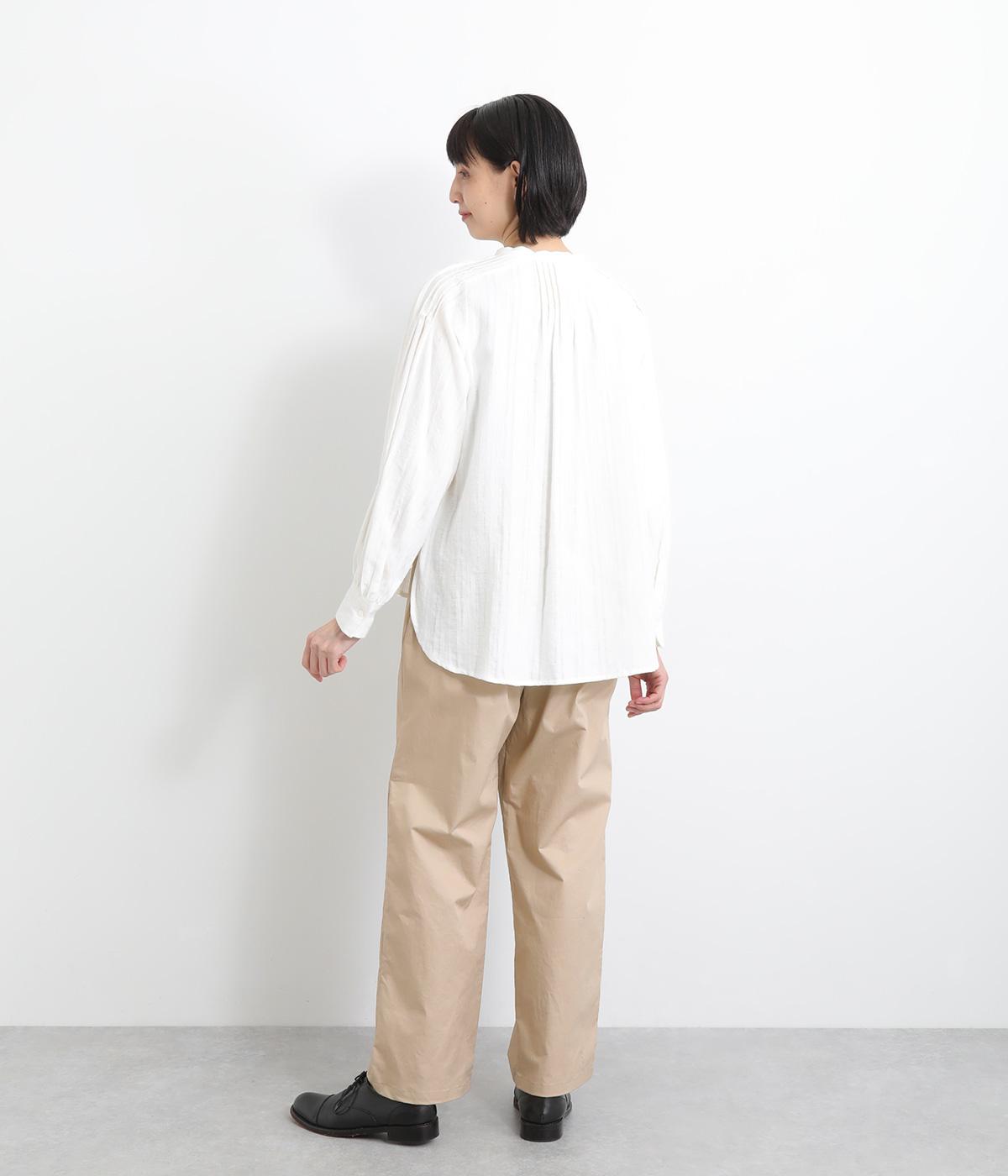 さらりとしたドライタッチのライトなコットン生地で心地よく仕上げました。ほどよいハリとシャリ感がシルエットをきれいに出し、季節問わずはきやすい使い勝手のいい生地感です。