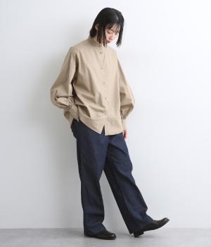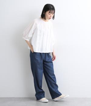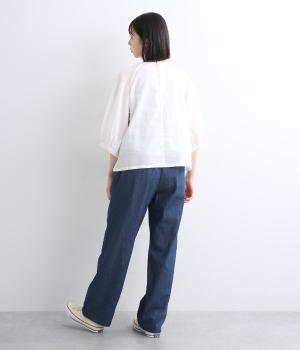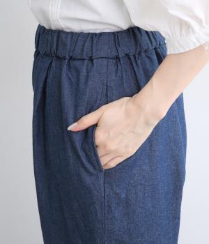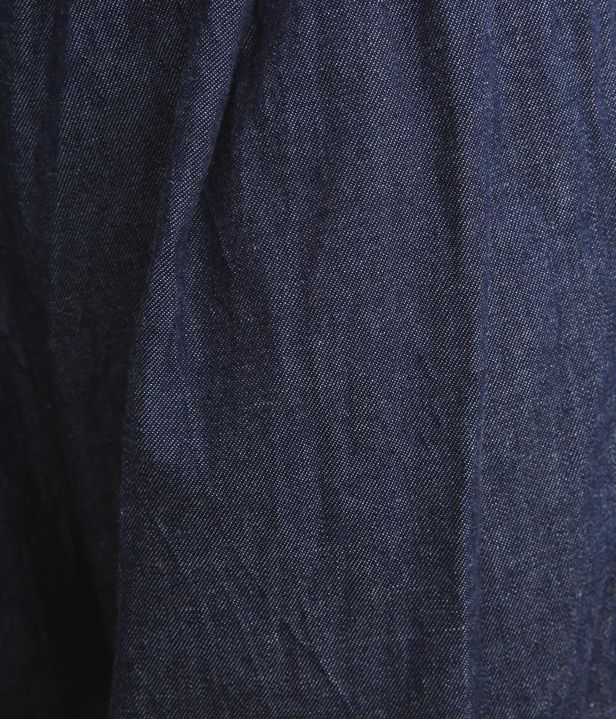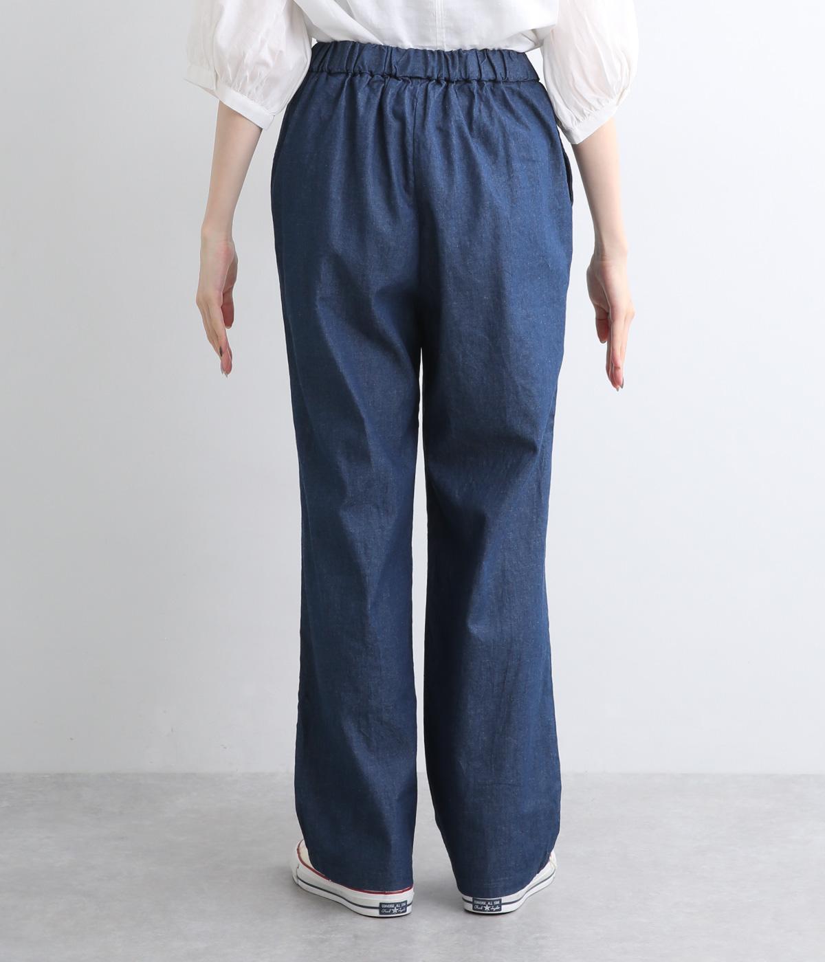 さらりとした肌ざわりのよいコットンデニムで仕立てました。表面のほどよいツヤ感がカジュアルさをおさえて、きれいめスタイルにもマッチします。