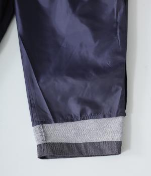 ほどよくハリ、コシのある手ざわりから上質さを感じさせるあたたかいコットンウール素材。裾部分までしっかりカバーしてくれる裏地は、ポリエステル素材。丈夫でシワになりにくく、摩擦にも強いのが特徴です。