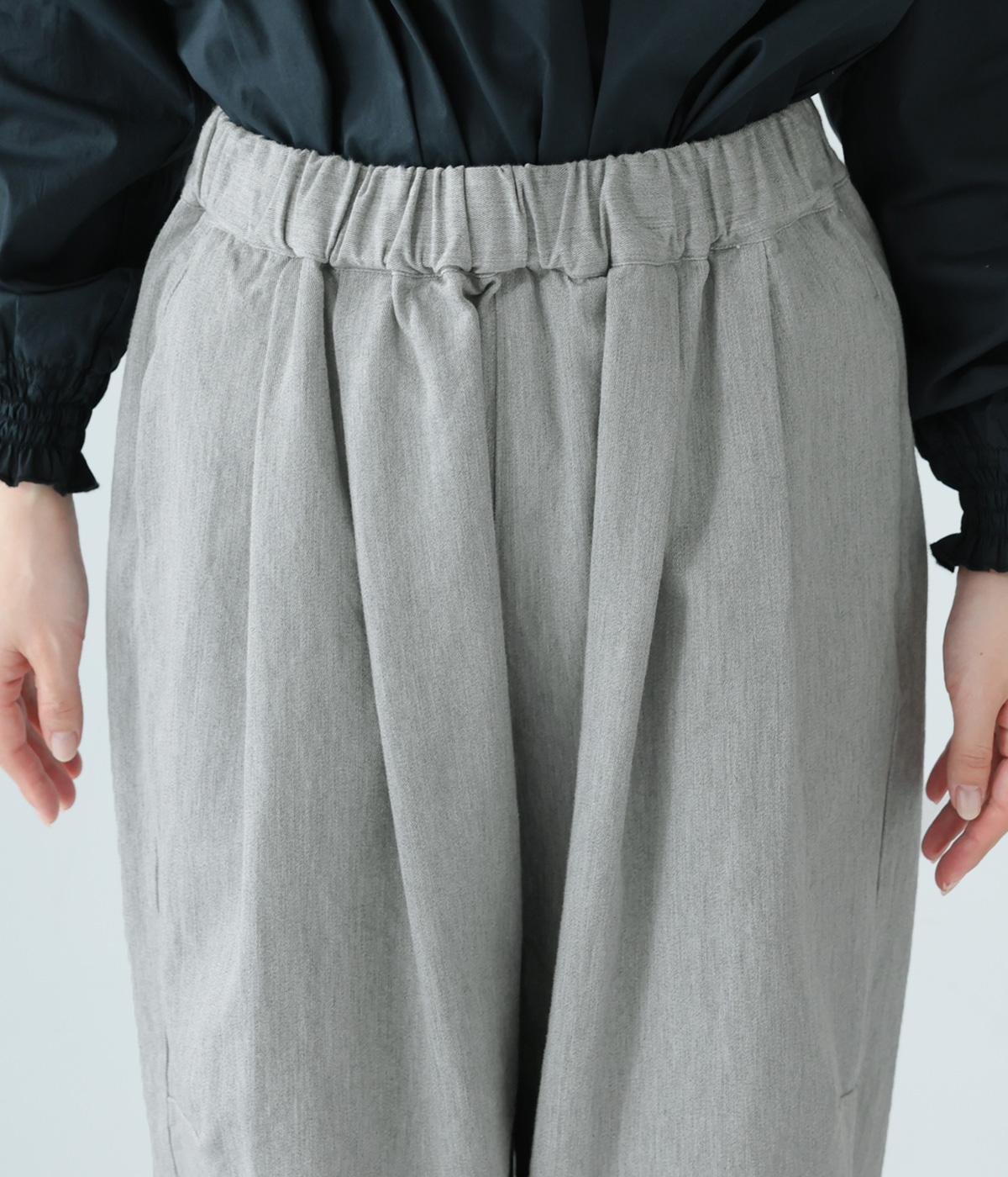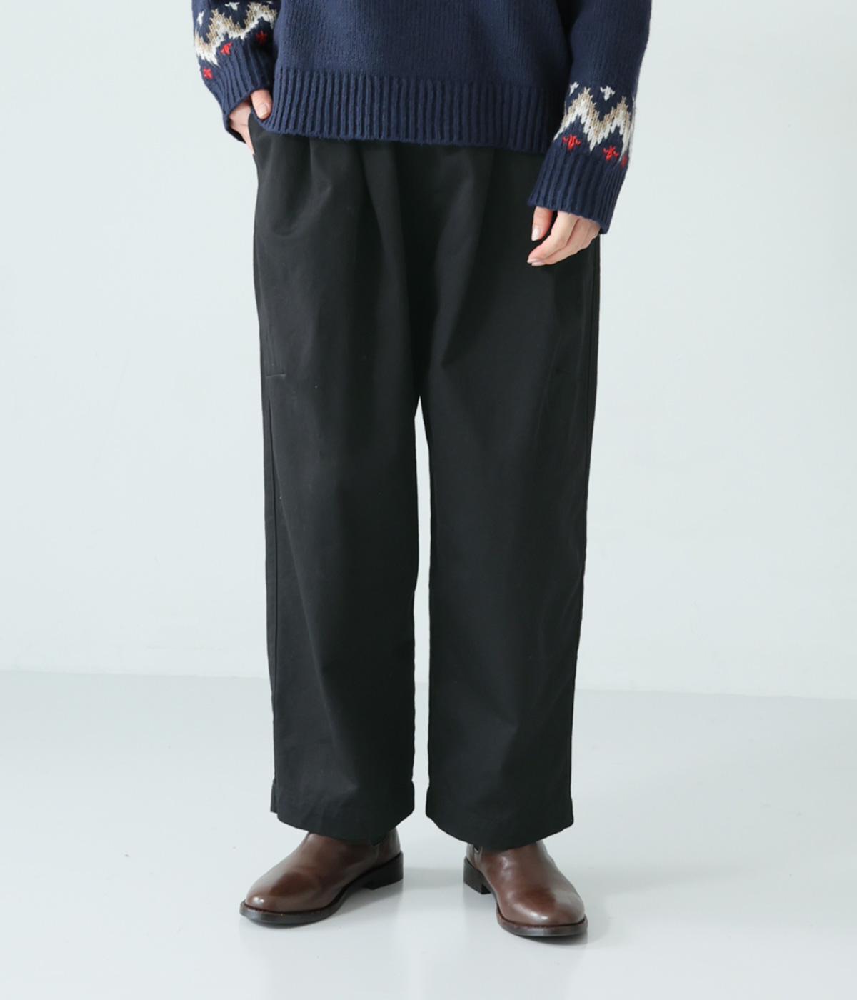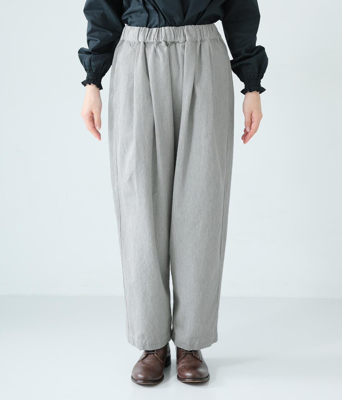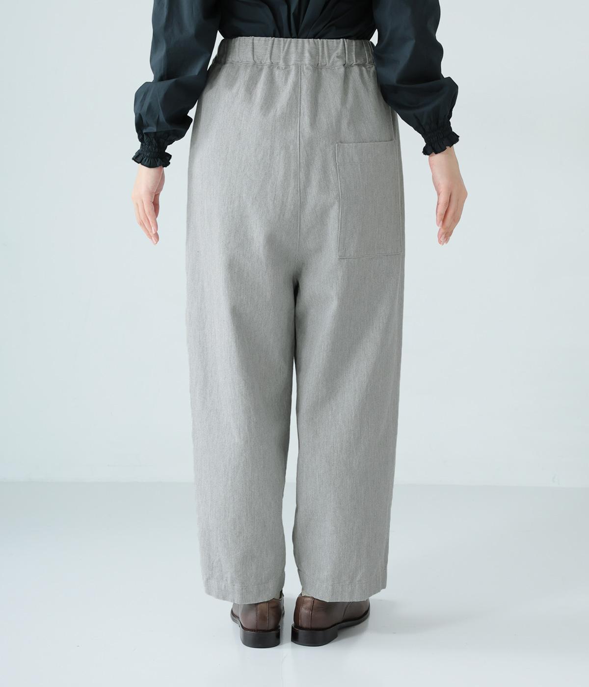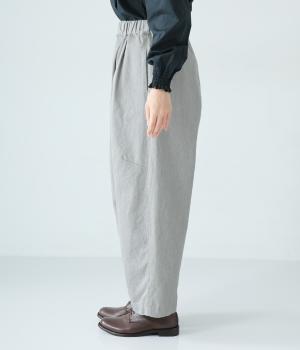 前ウエスト下のタックと太もも両サイドのダーツで立体的なシルエットを表現したワイドパンツ。テーパードラインが着こなしをすっきりと見せてくれます。大きな右ヒップポケットが後ろ姿のアクセントに。総ゴム仕様のウエストには内紐をプラスしました。