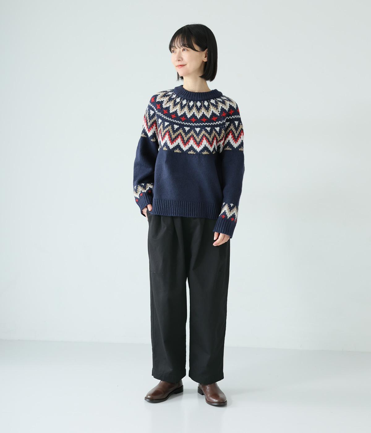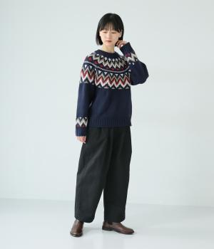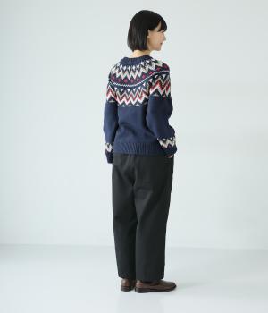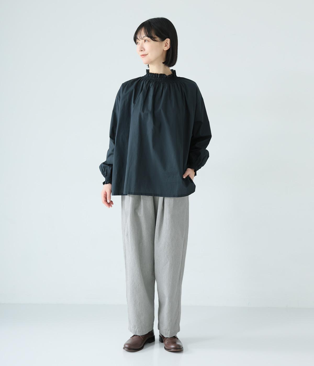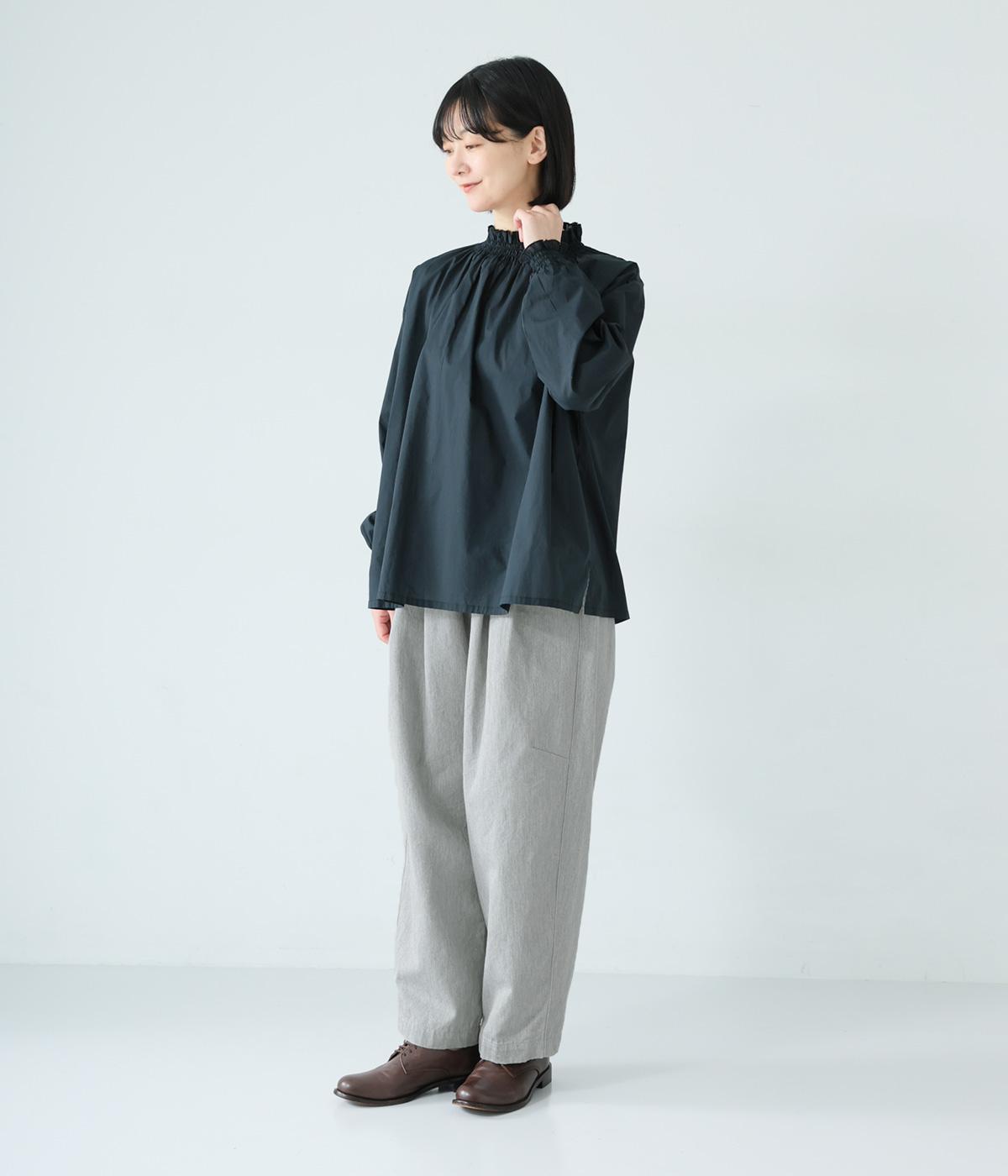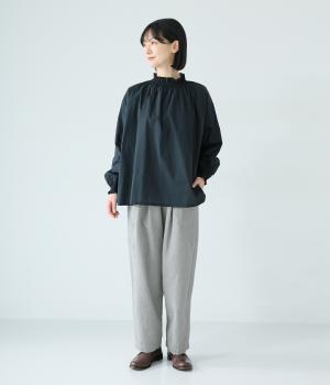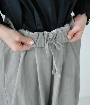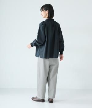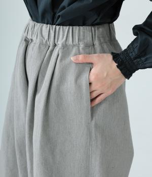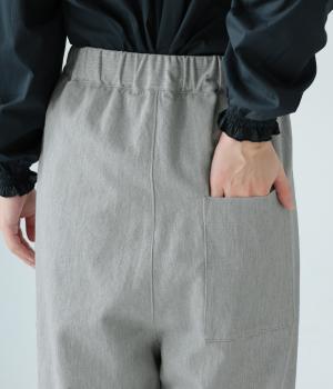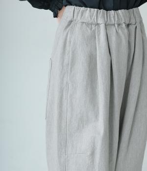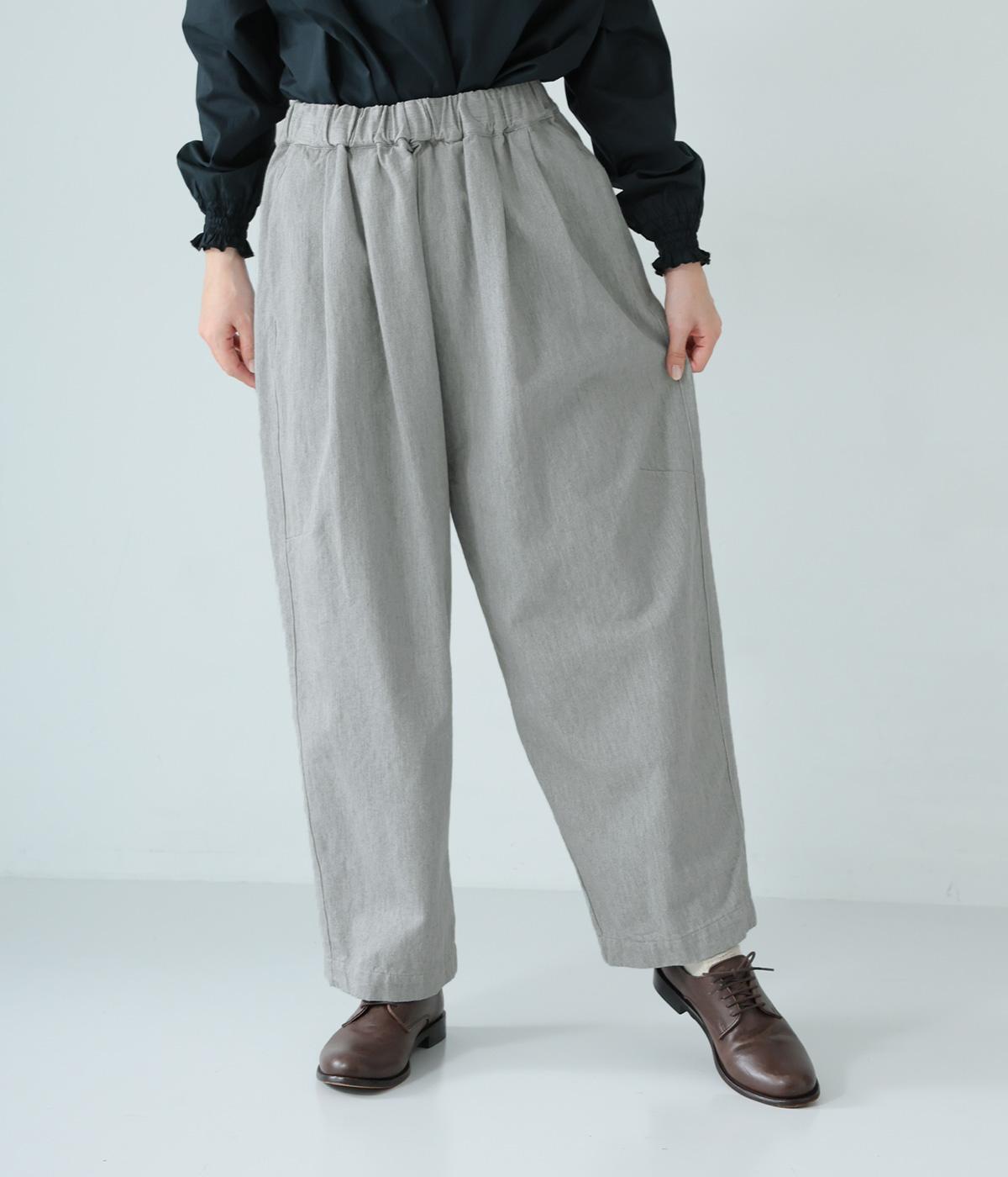 前ウエスト下のタックと太もも両サイドのダーツで立体的なシルエットを表現したワイドパンツ。テーパードラインが着こなしをすっきりと見せてくれます。大きな右ヒップポケットが後ろ姿のアクセントに。総ゴム仕様のウエストには内紐をプラスしました。