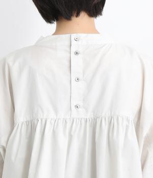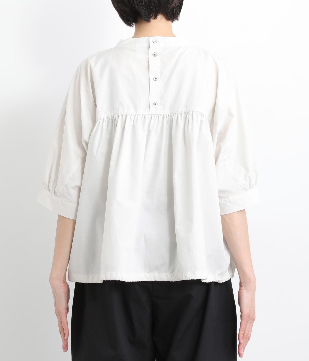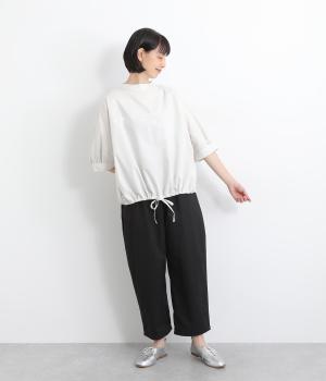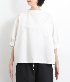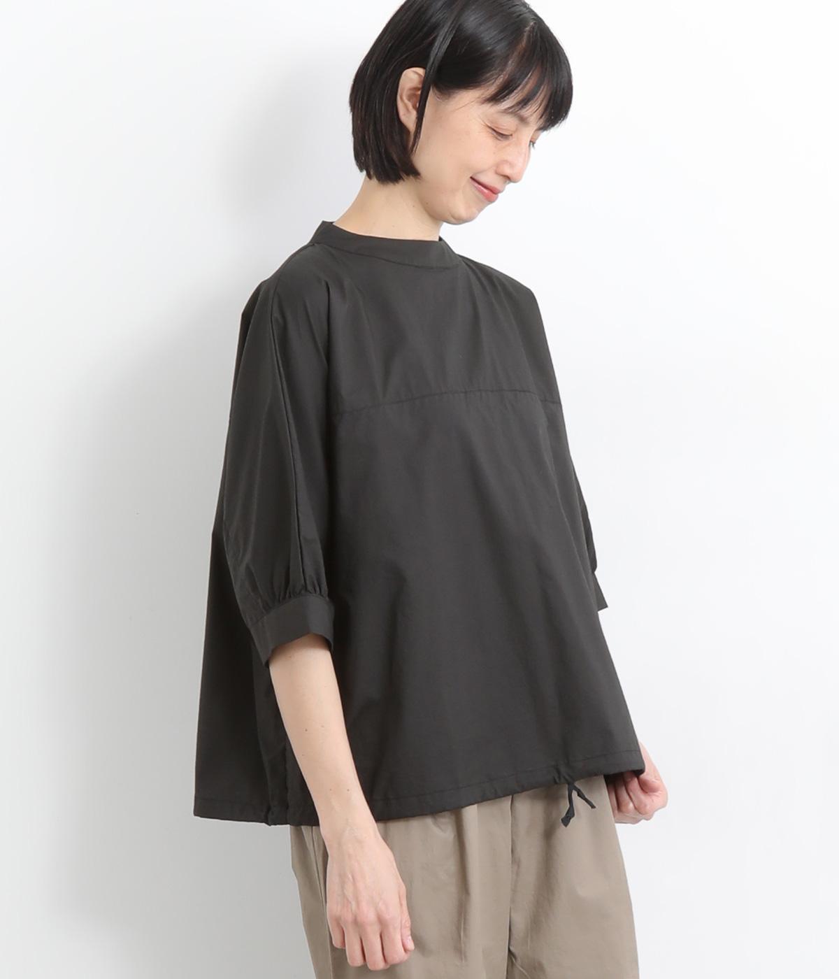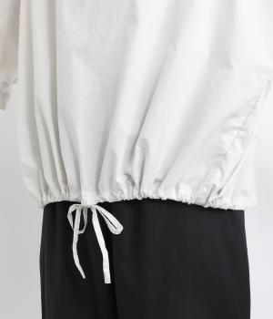 ゆったりとしたドルマンスリーブのプルオーバーは裾にコードを通してシルエットのアレンジを楽しめるよう仕立てました。袖のカフスやすこし立ち上がった襟が好印象。後ろあきで脱ぎ着しやすく、ギャザーも入れてゆとりを持たせました。