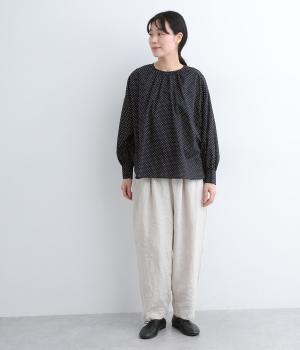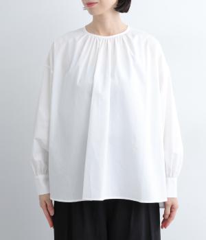 襟ぐりにたっぷりギャザーを寄せたシンプルなブラウスです。着丈は前後差をつけたスリット入りでアウトの着こなしもすっきりと決まります。ふたつボタンのカフスできちんと感も◎。スタンダードな一枚でふだん使いからフォーマルまで幅広く活躍します。