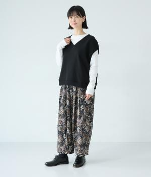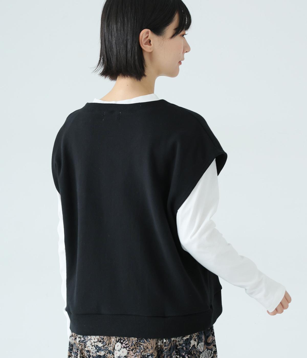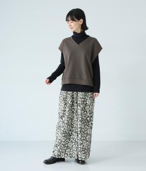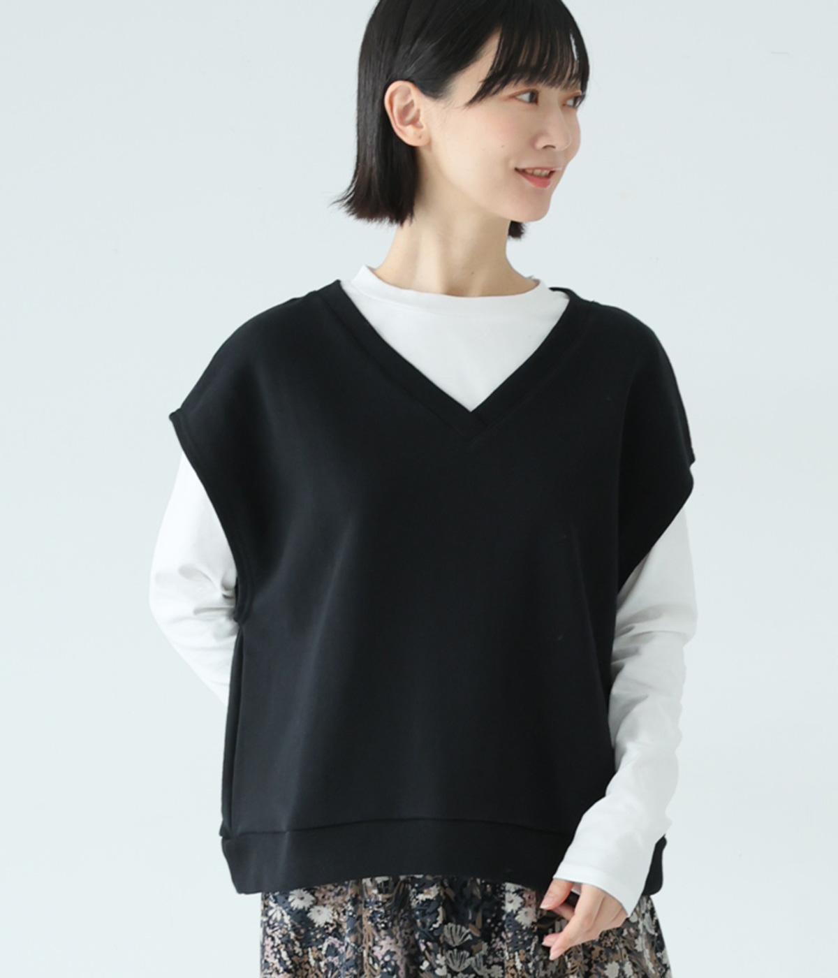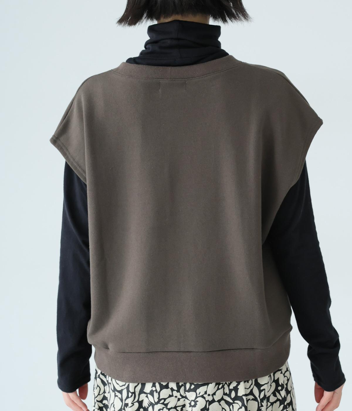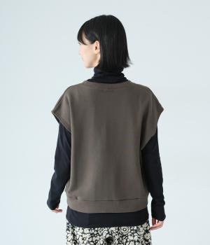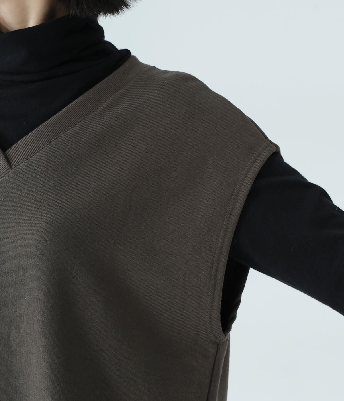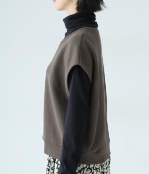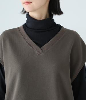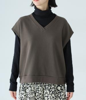 肩先をおおうゆったりとした身幅がポイントの裏毛ベスト。抜け感のあるVネックが顔まわりをすっきりと見せてくれます。無駄のないシンプルなデザインで、大人らしいこなれ感ただよう重ね着スタイルに導く一着です。